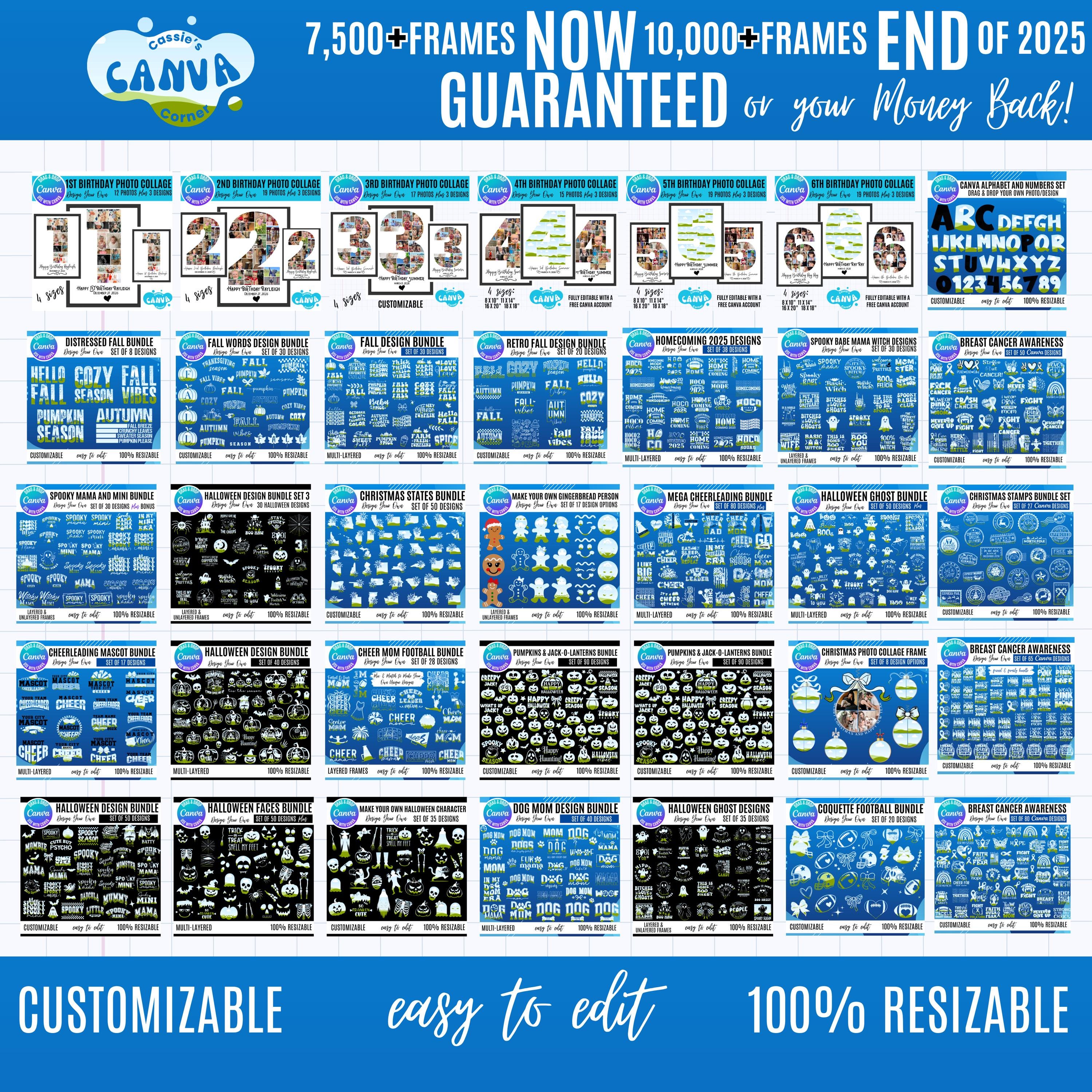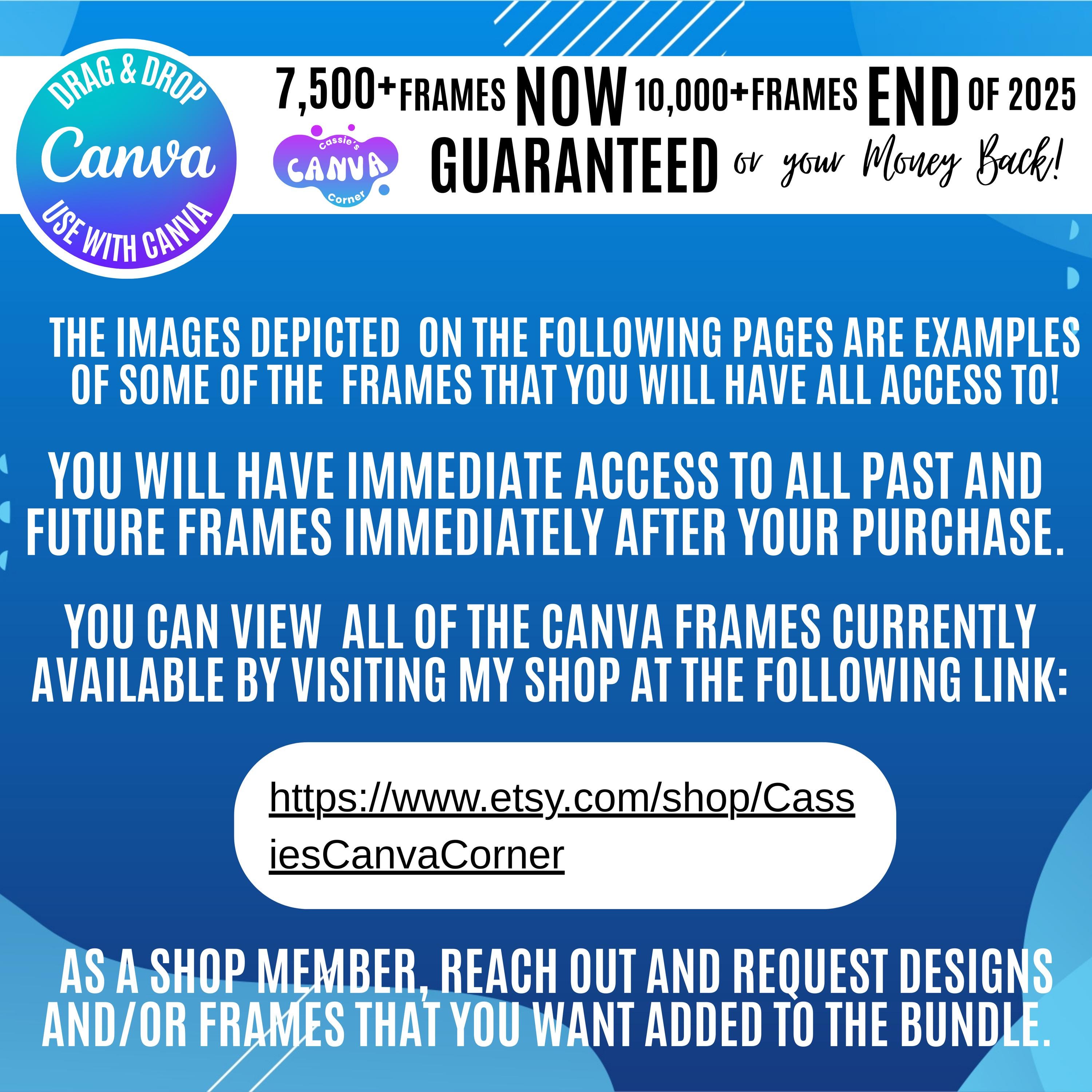 ***Experience the amazing discount of over 95% compared to buying them individually. Join us in our journey towards success while taking advantage of the current low ALL ACCESS PRICING! ***Experience the thrill of our trendy seasonal and updated frames, which will be added to our shop weekly, which you will have immediate access to. ***We promise to provide you with over 10,000 Canva frame designs by the end of 2025 or we will refund your purchase!