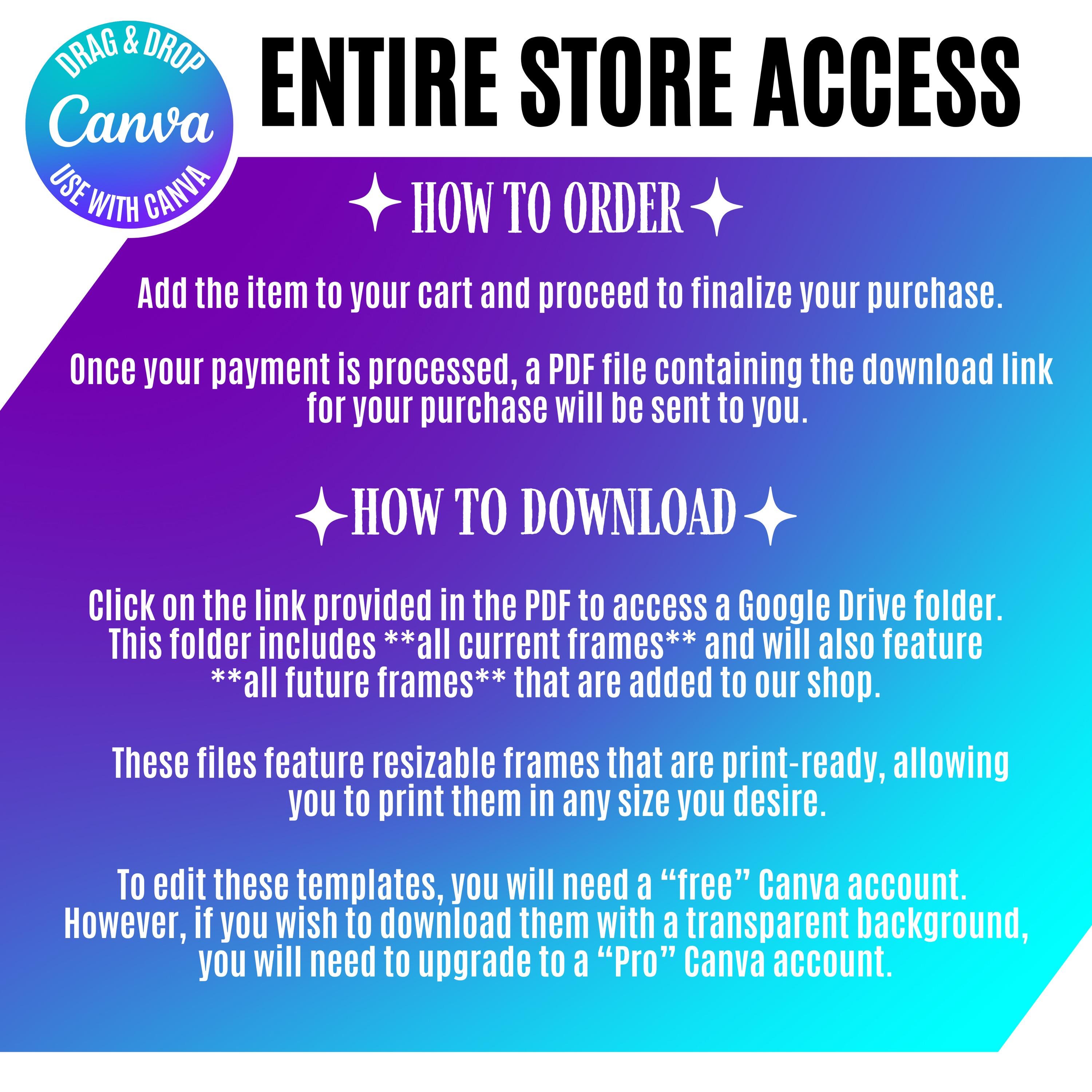 With a one-time payment, our All-Access Canva bundle offers you instant access to our entire shop, along with all future Canva frames that are added to our shop. Enjoy an incredible discount of over 100% compared to purchasing the Canva frames separately. Don't miss out on the current low All Access Pricing available in our shop!