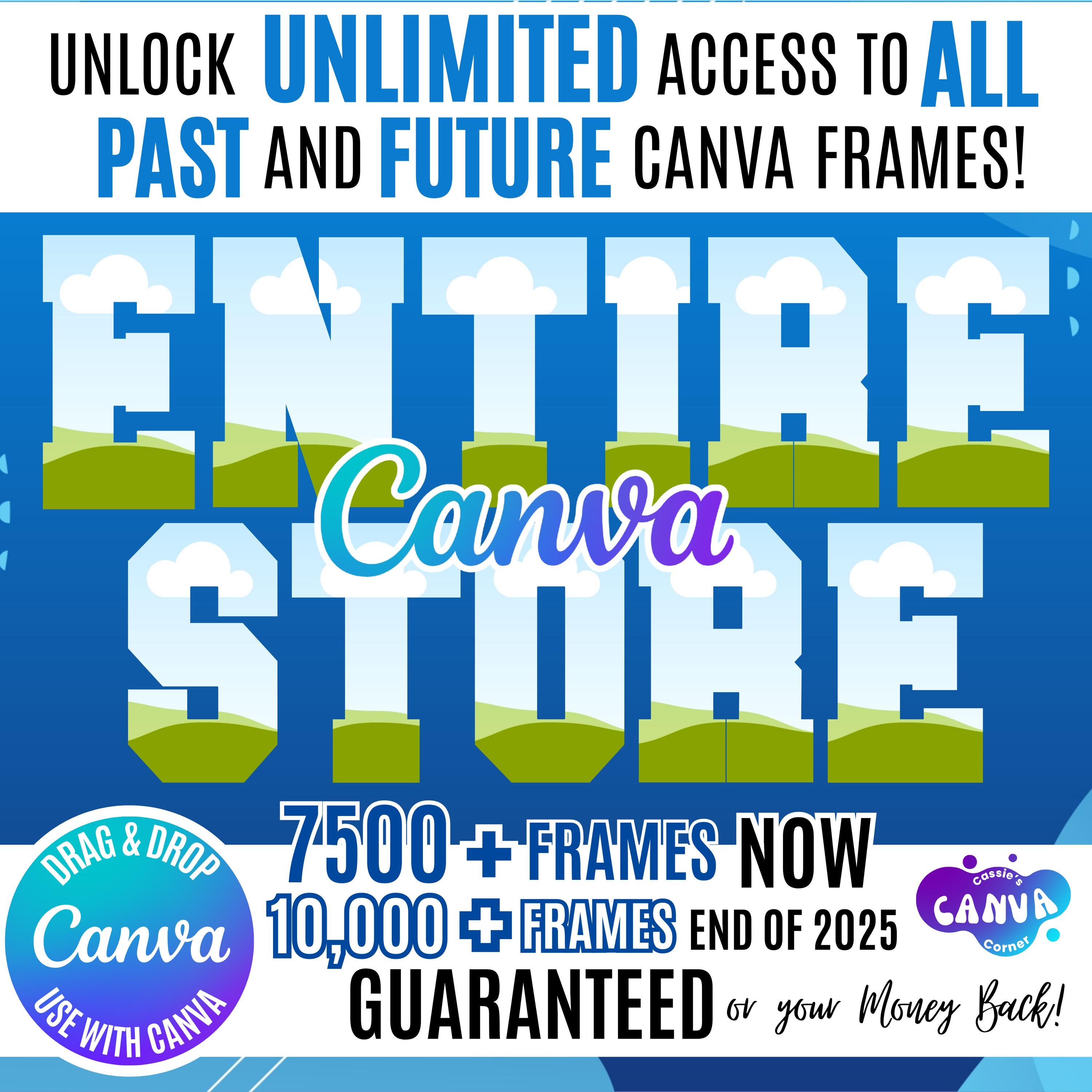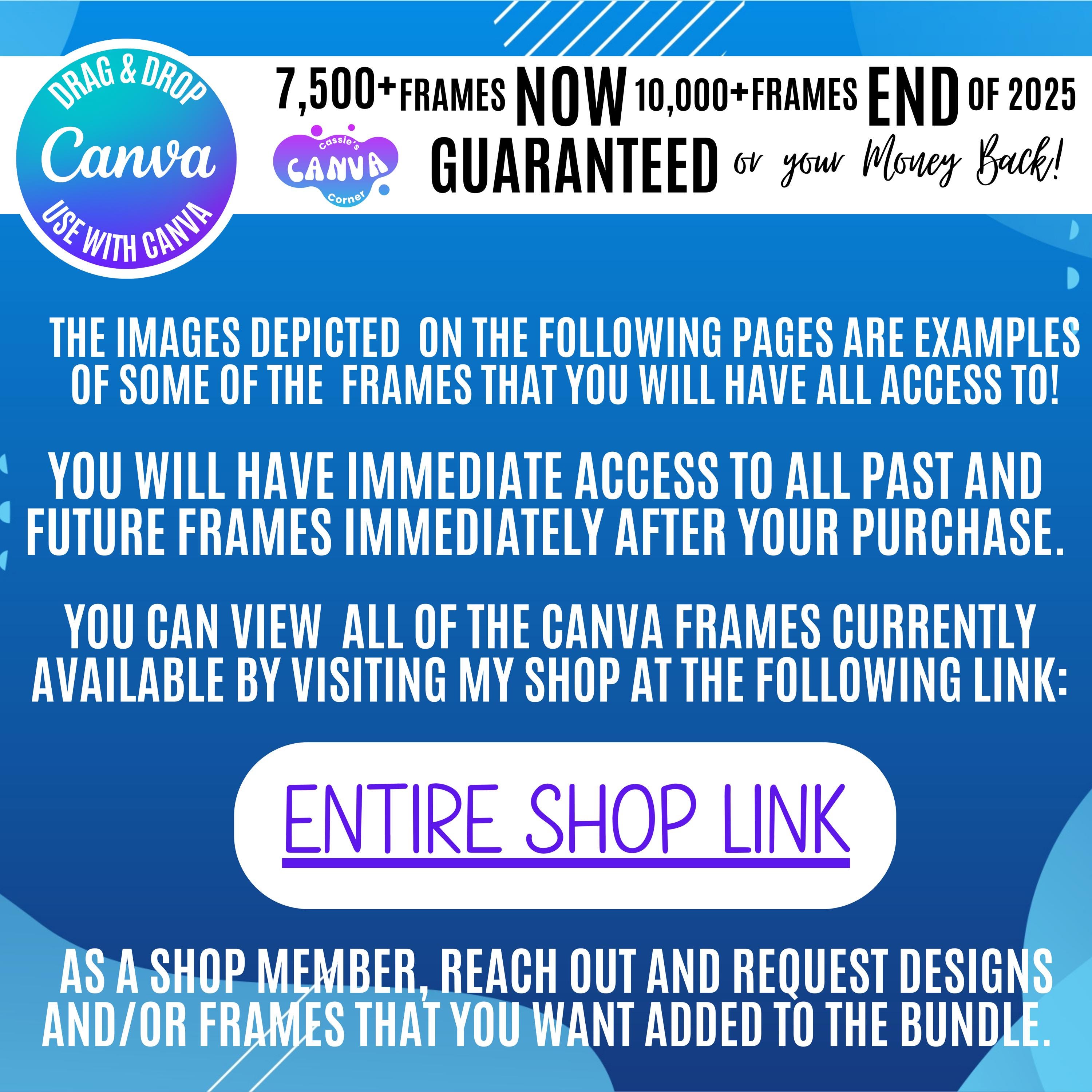 ***Experience the amazing discount of over 95% compared to buying them individually. Join us in our journey towards success while taking advantage of the current low ALL ACCESS PRICING! ***Experience the thrill of our trendy seasonal and updated frames, which will be added to our shop weekly, which you will have immediate access to. ***We promise to provide you with over 10,000 Canva frame designs by the end of 2025 or we will refund your purchase!