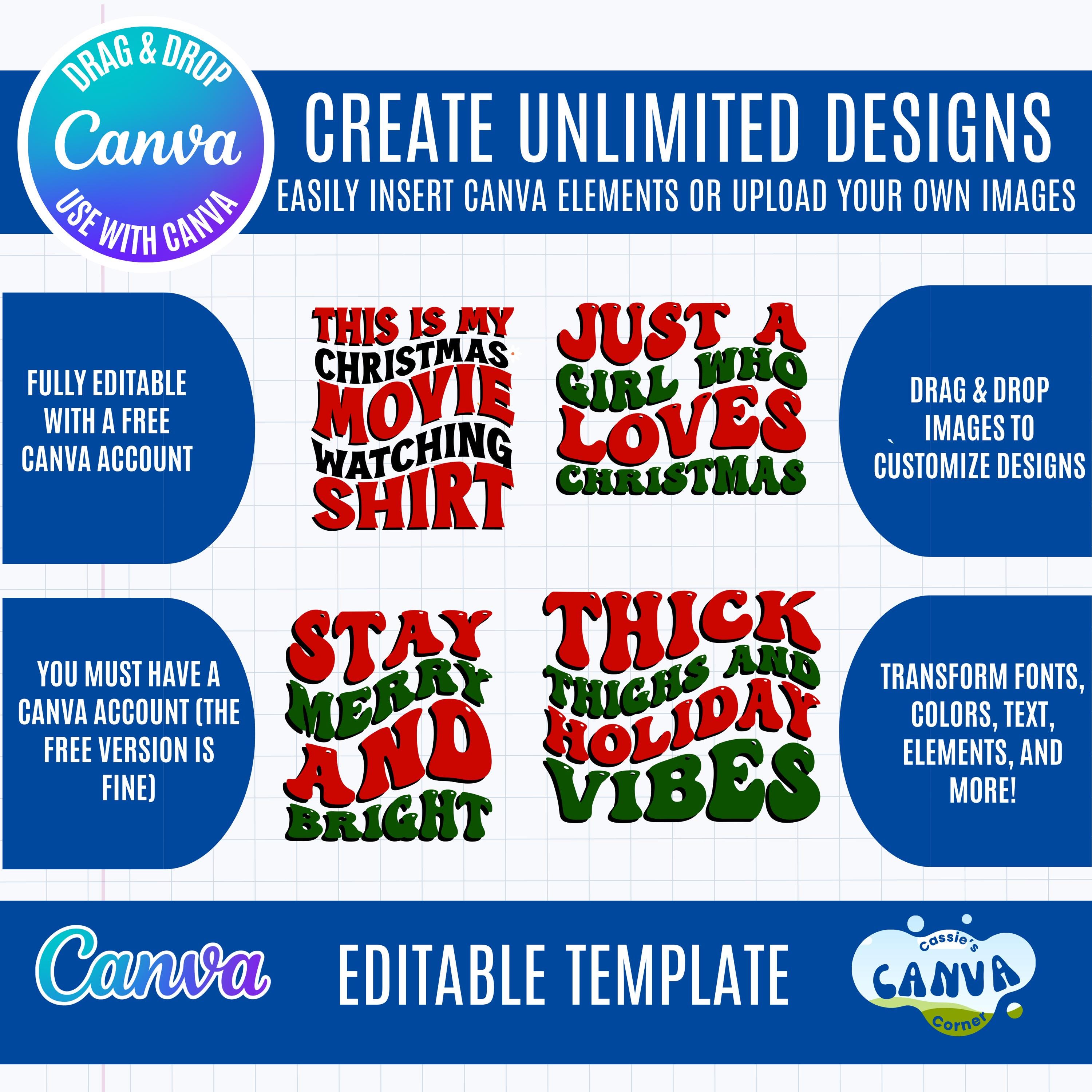 Perfect for small business owners, content creators, and holiday lovers alike — easily customize and use these designs in Canva for Christmas cards, mugs, t-shirts, stickers, social media posts, and more.