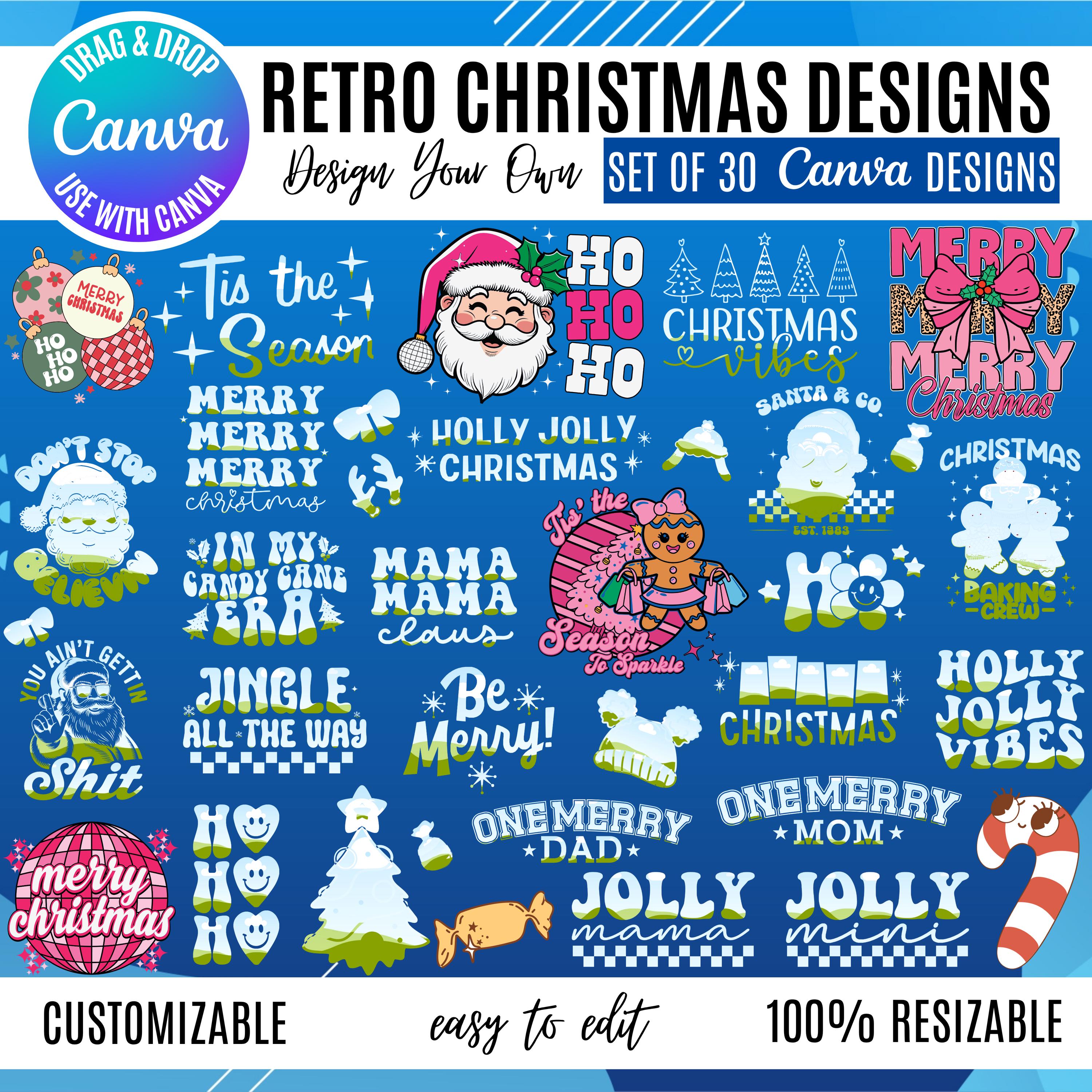 This festive set includes 30 unique retro-inspired Christmas designs featuring playful vintage graphics, classic holiday colors, and mid-century charm.