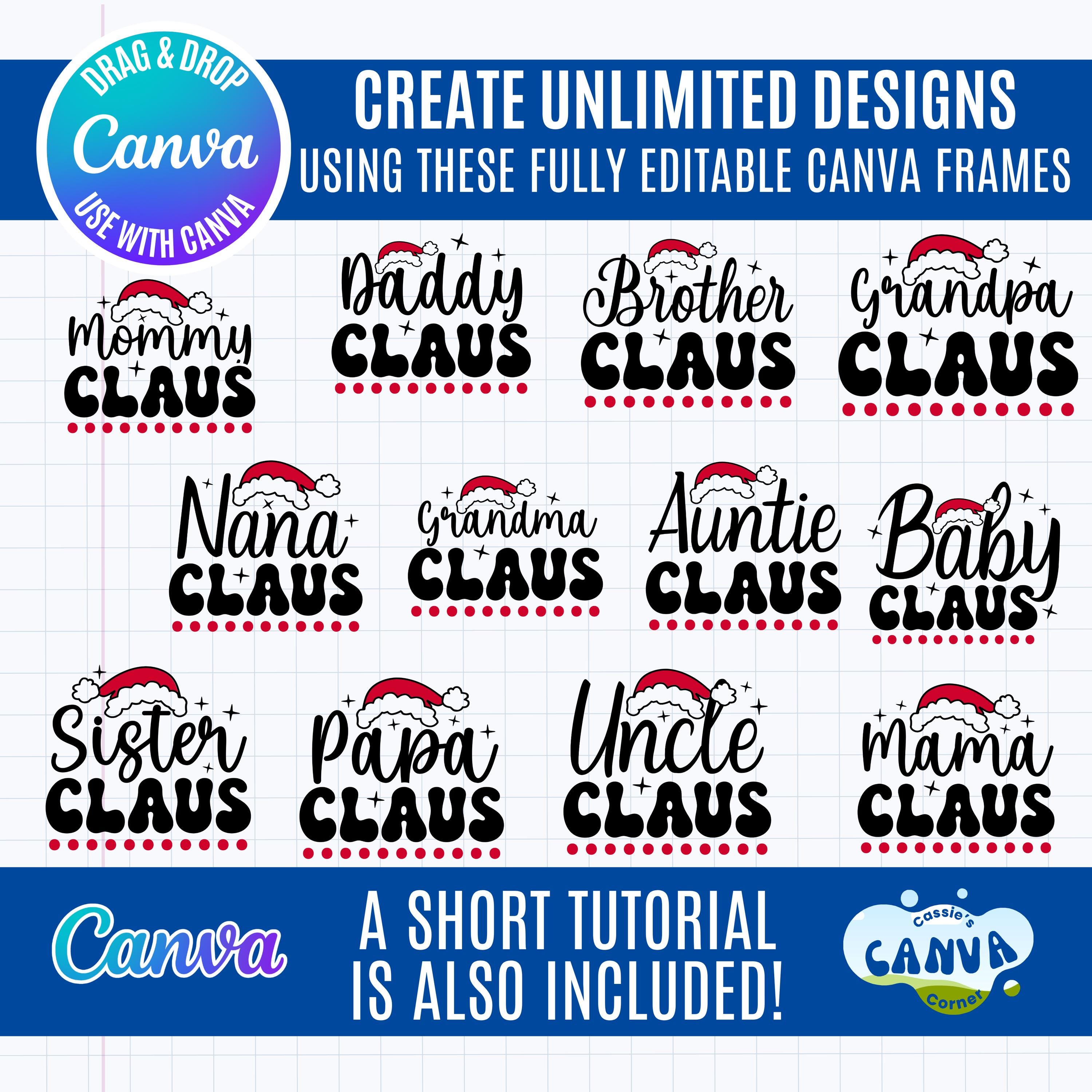 This festive set includes editable Canva templates featuring fun “Claus Family” titles like Mama Claus, Daddy Claus, Mini Claus, Papa Claus, Nana Claus, and more! Perfect for creating adorable matching Christmas shirts, pajamas, mugs, or holiday party outfits for the whole family.