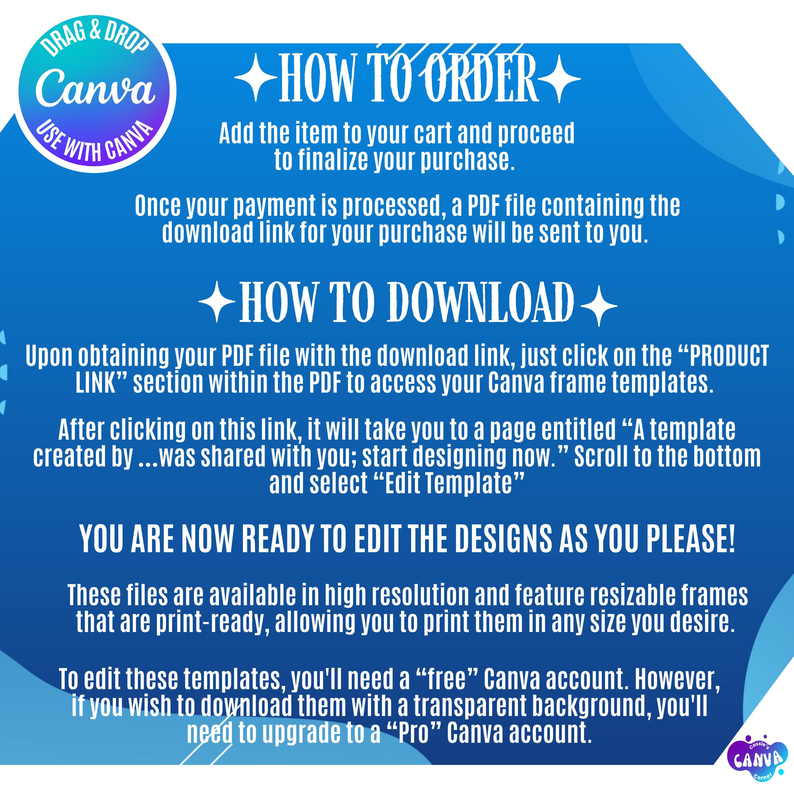 Simply add the item to your Etsy cart and proceed to finalize your purchase. After Etsy confirms your payment, a file containing the download link to your Canva Editable Frame Template and Tutorial Template will be sent to your email address.