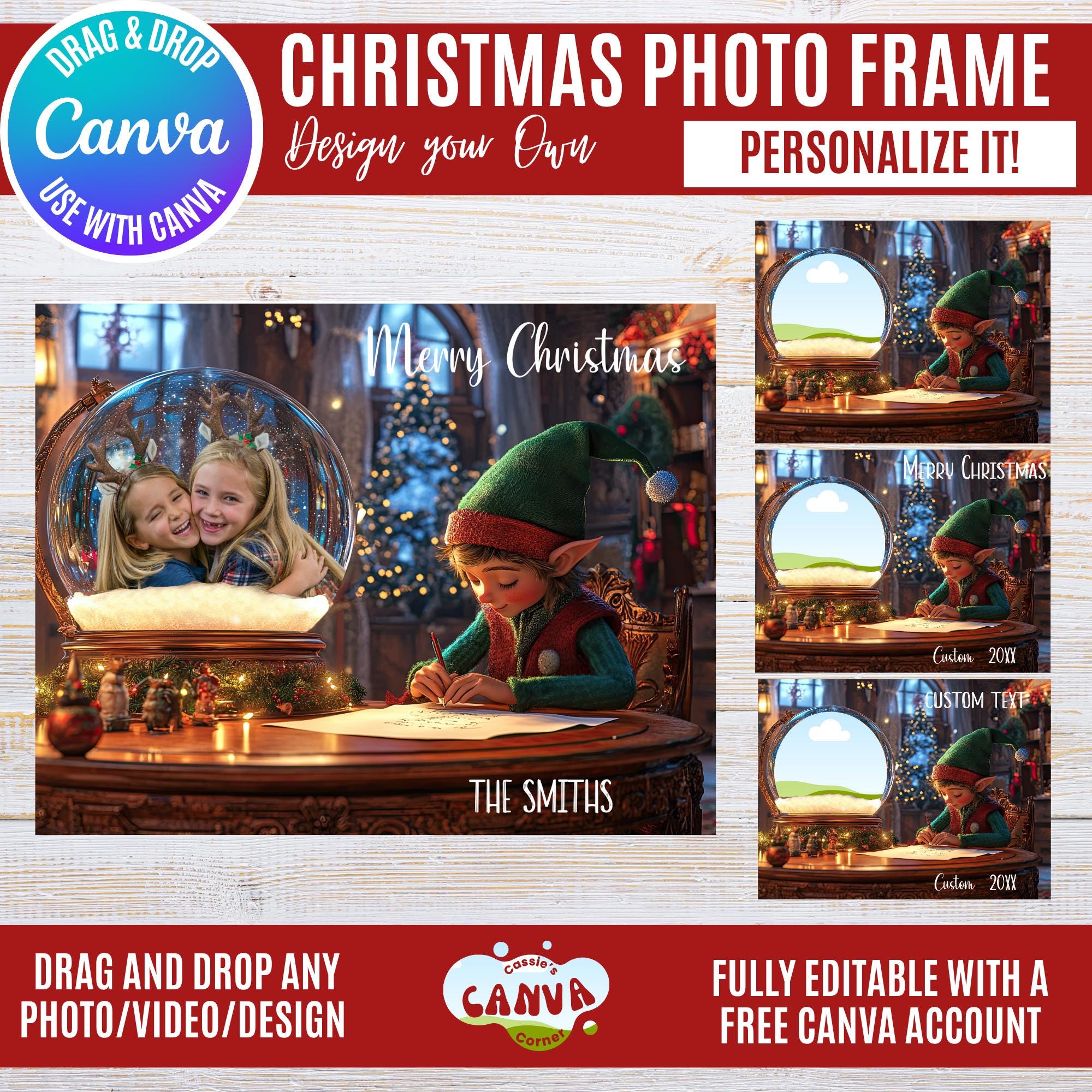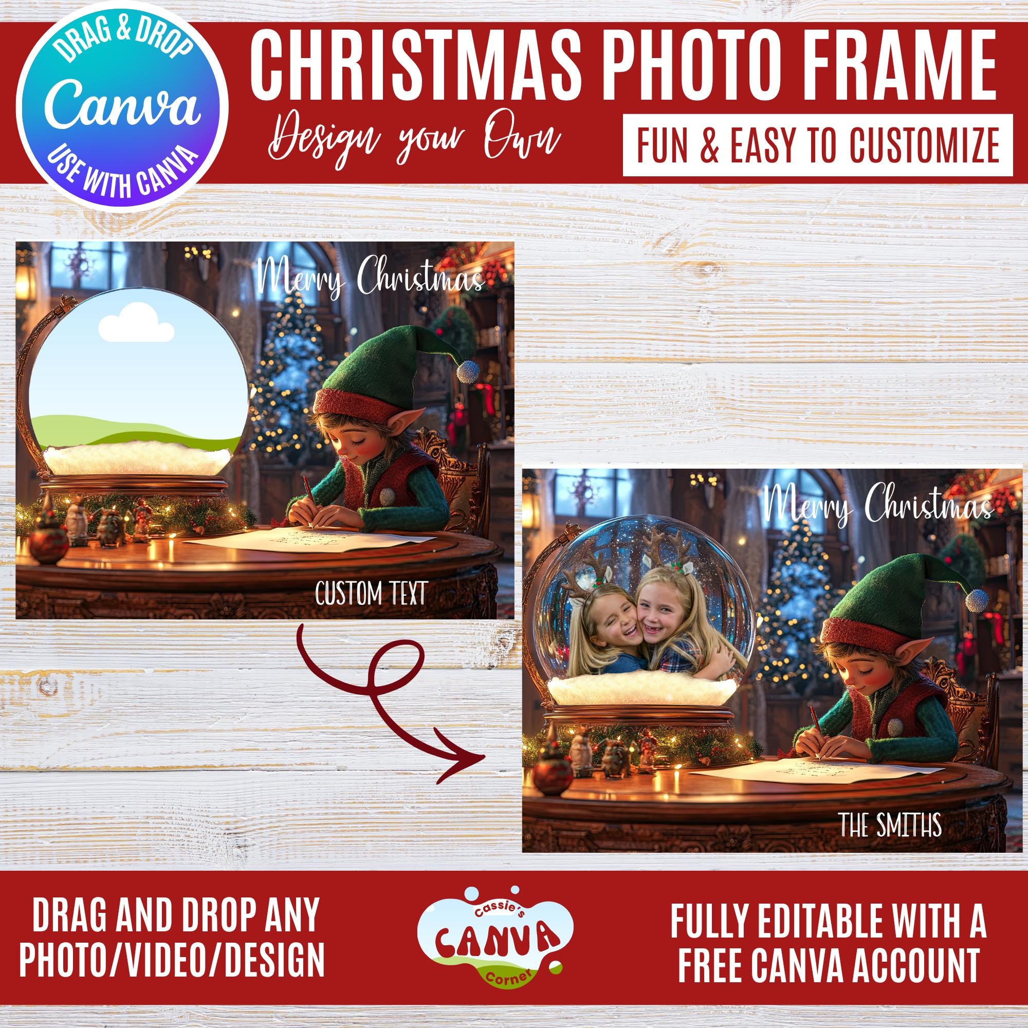 Christmas Elf Picture Frame Canva Template, Canva Christmas Photo Placeholder, Holiday Photo Frame Design, Editable Snowglobe Photo Template Canva