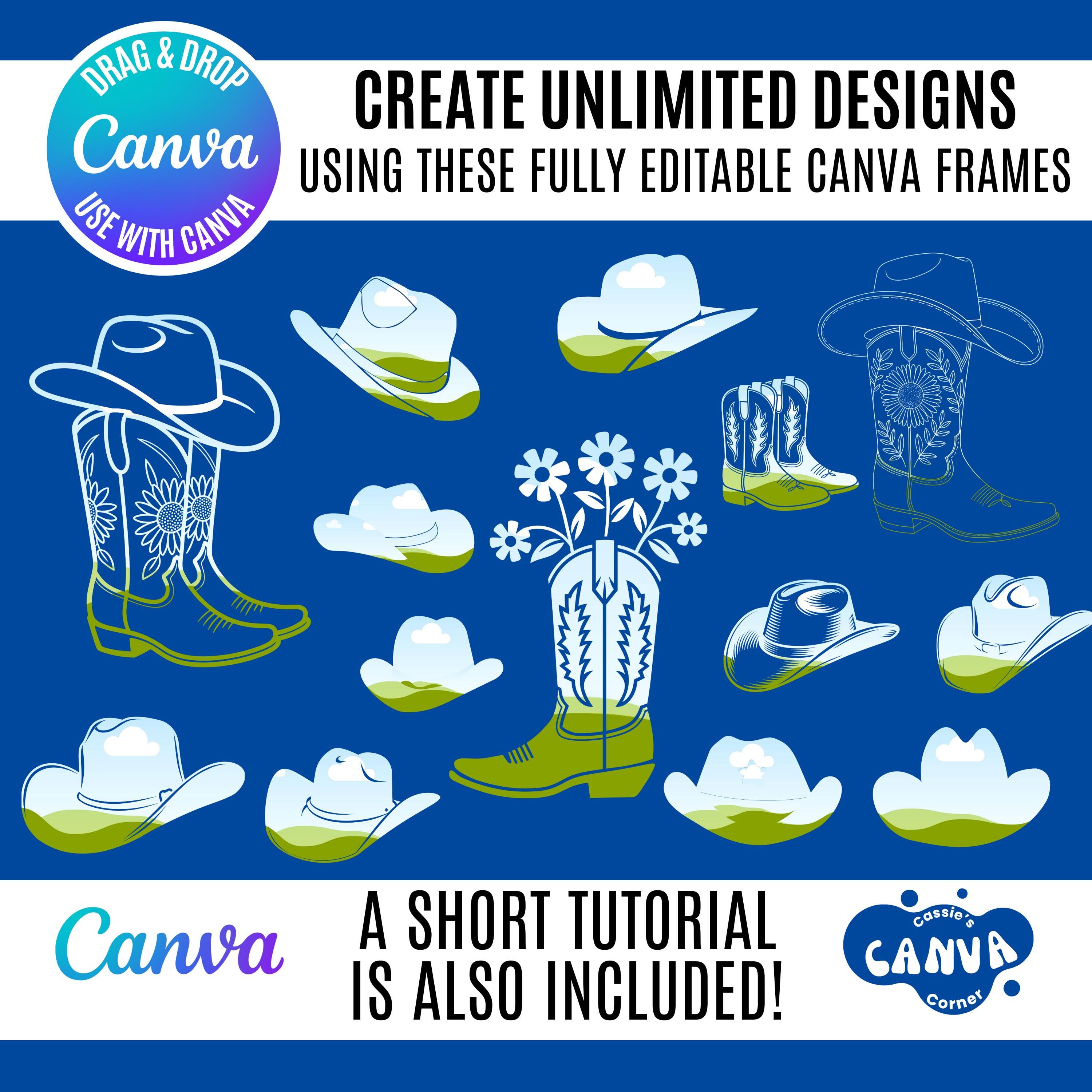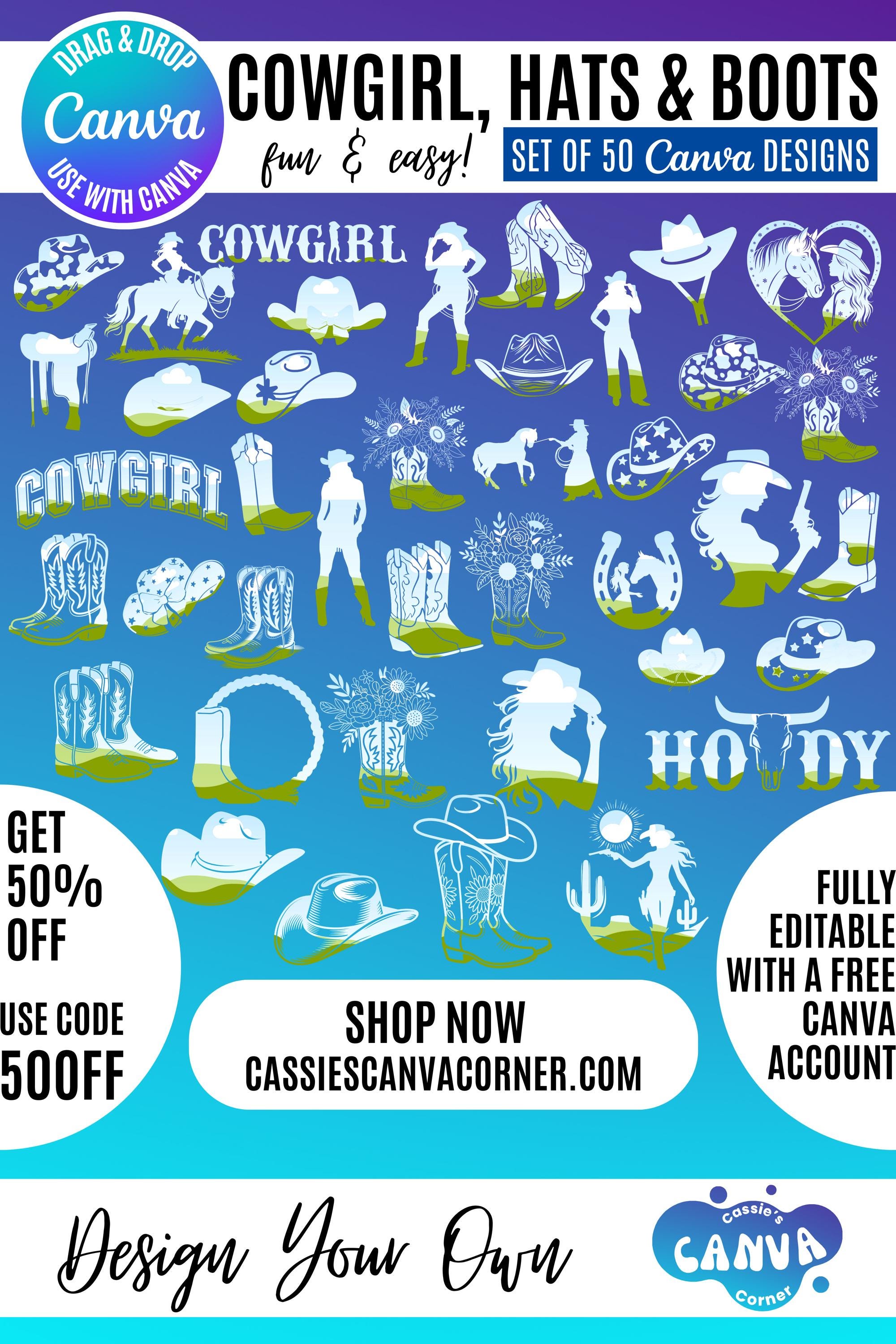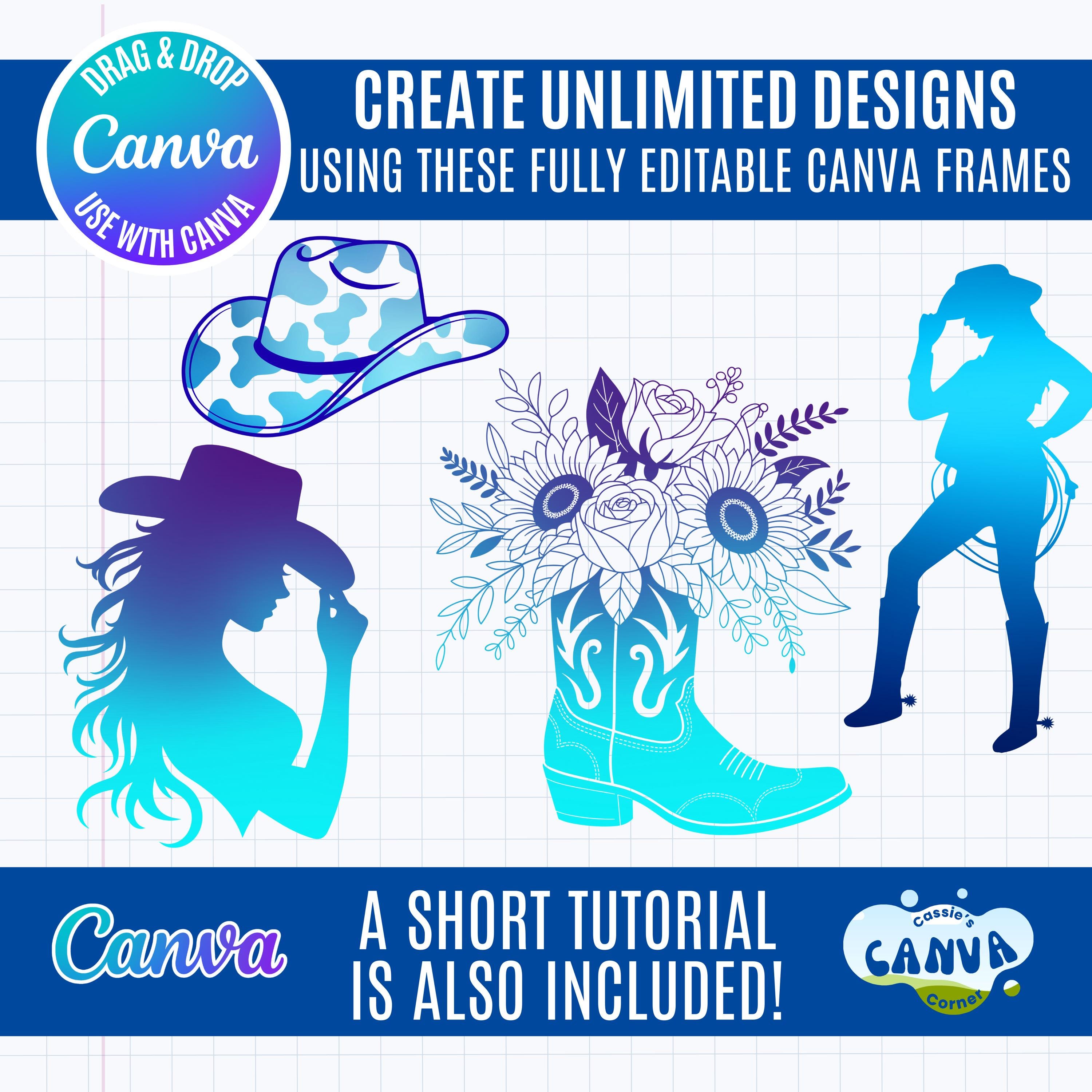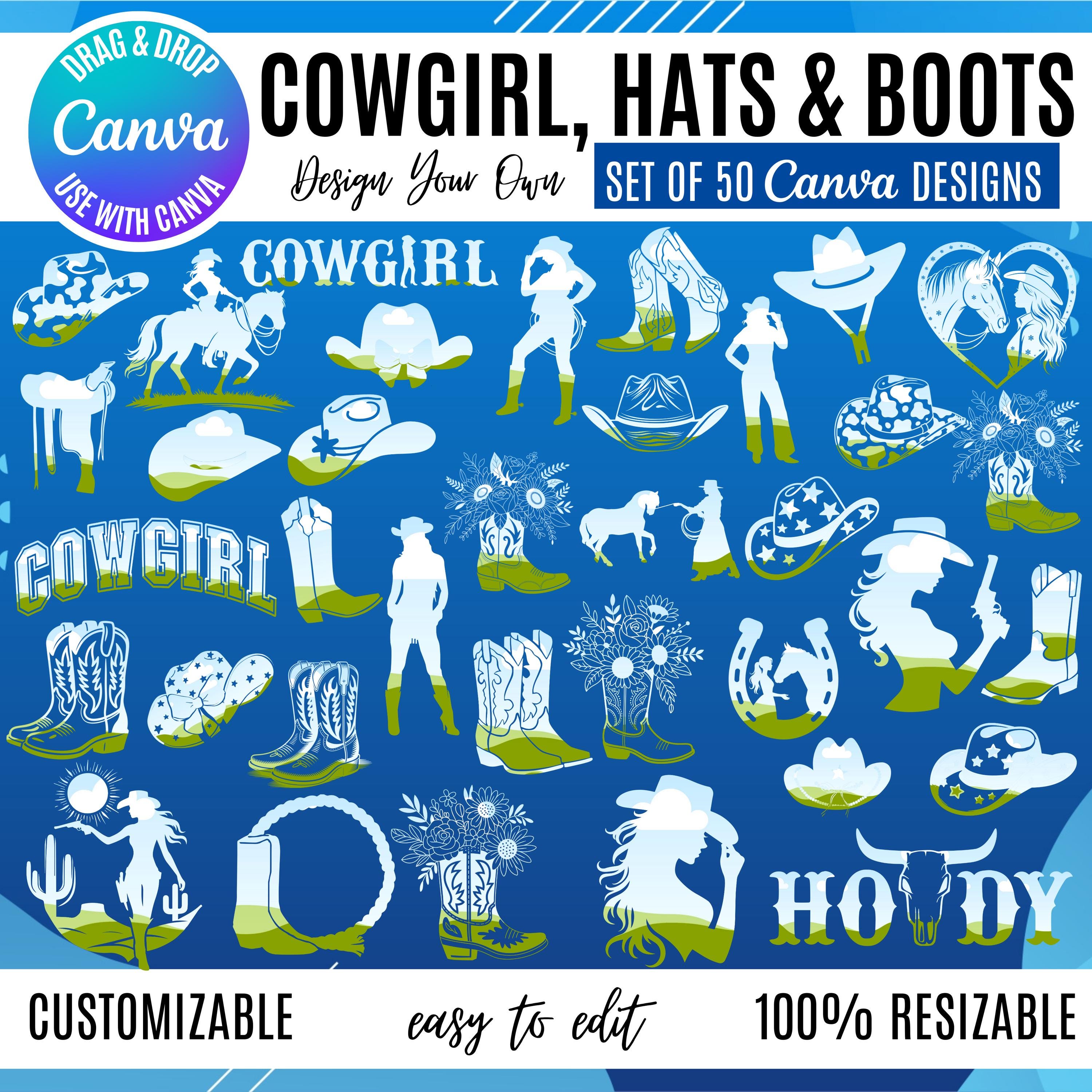 Cowgirl Canva Design Bundle • Western Cowgirls, Boots, Saddles, Horses, Cowboy Hats & Floral Hat Graphics • Editable Western Elements for DIY Projects