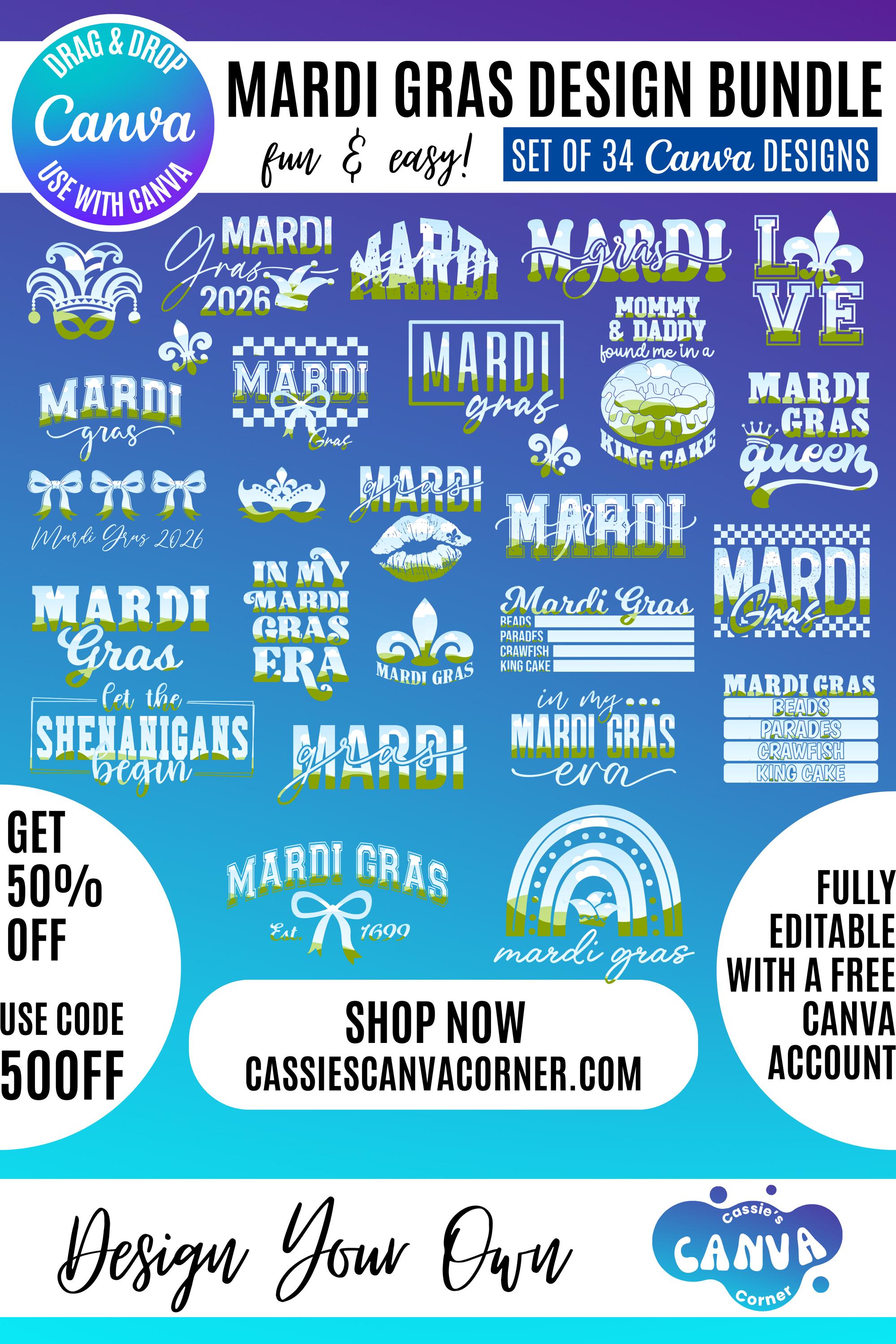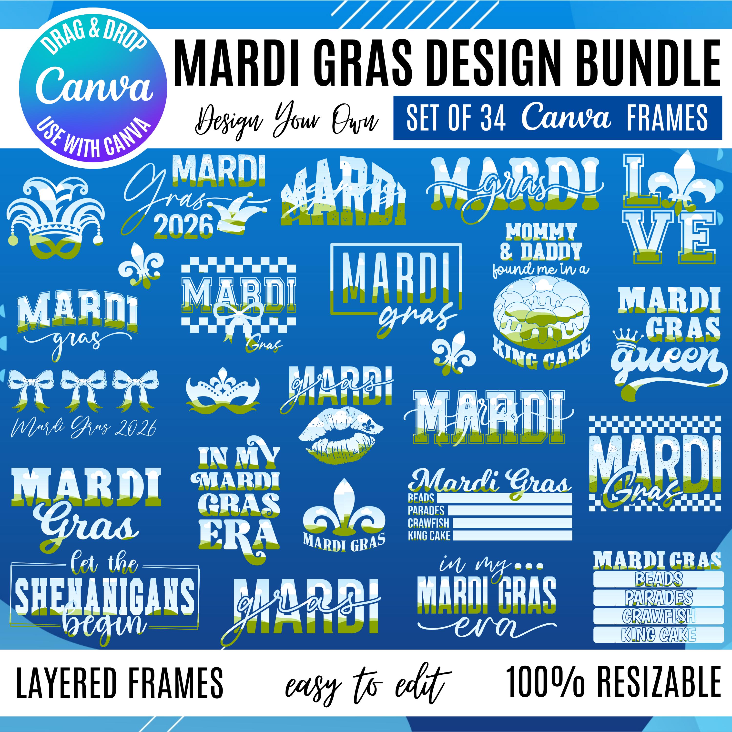 Mardi Gras Canva Bundle | 34 Assorted Mardi Gras Designs | Editable Canva Graphics | Fat Tuesday, Carnival, NOLA Party Designs
