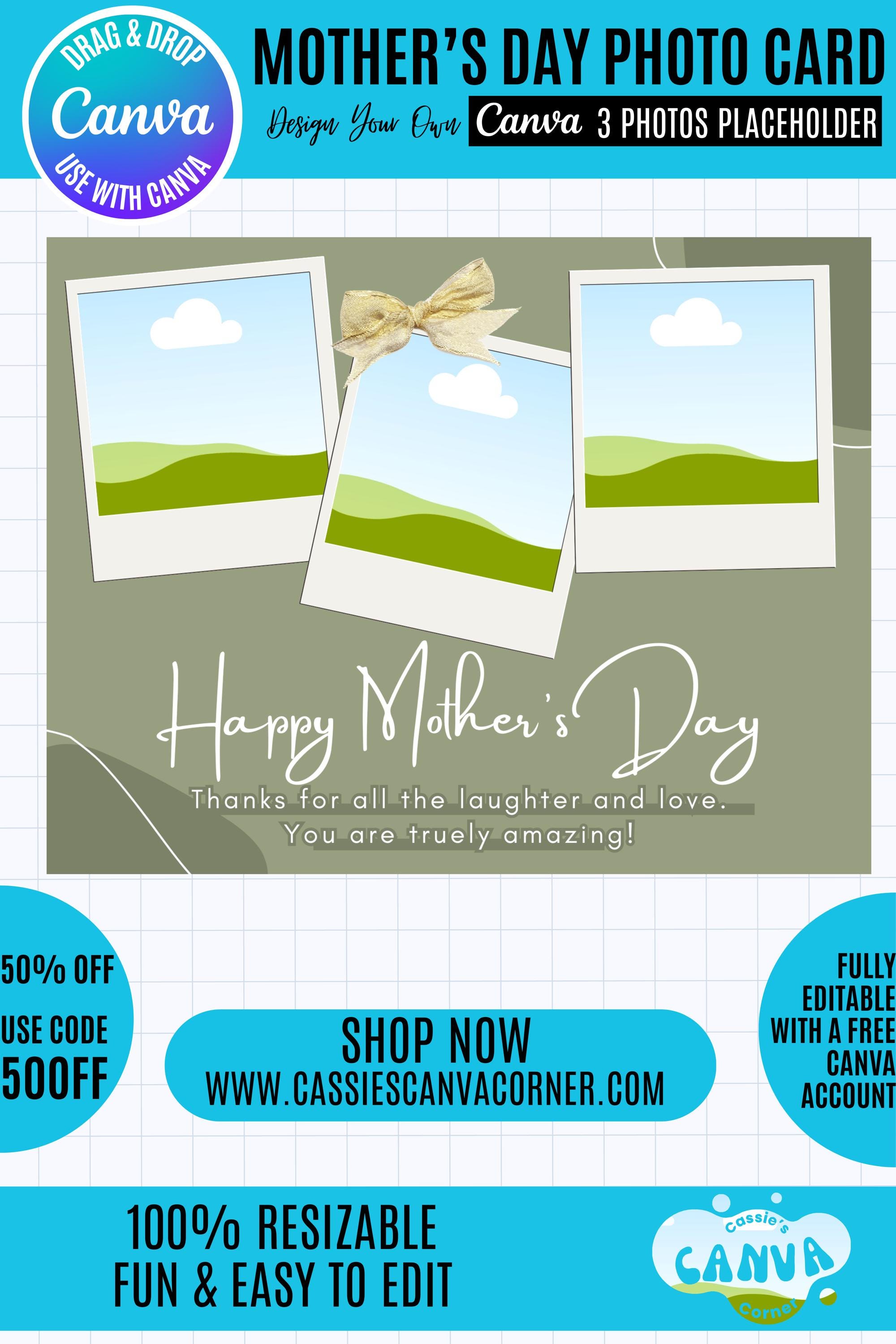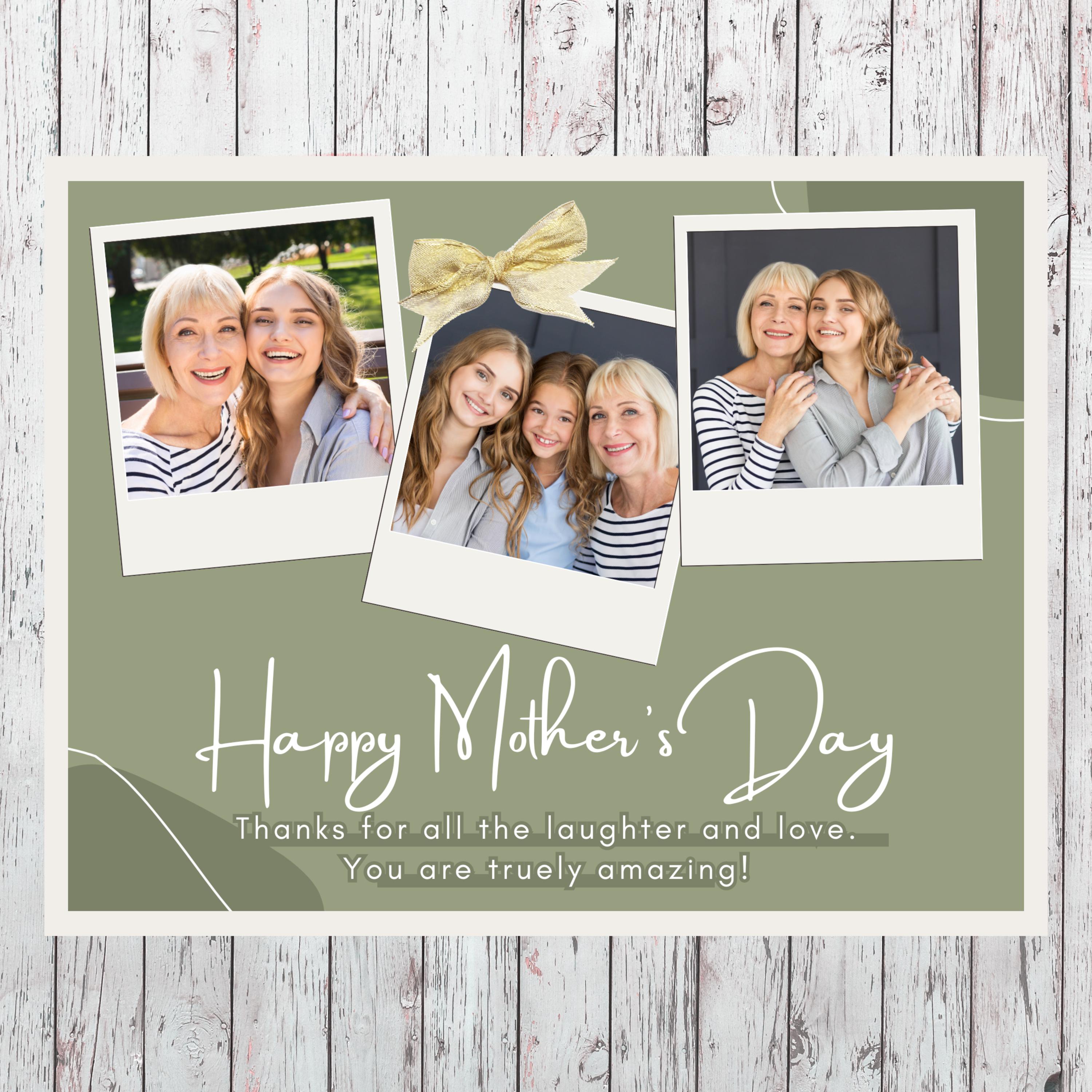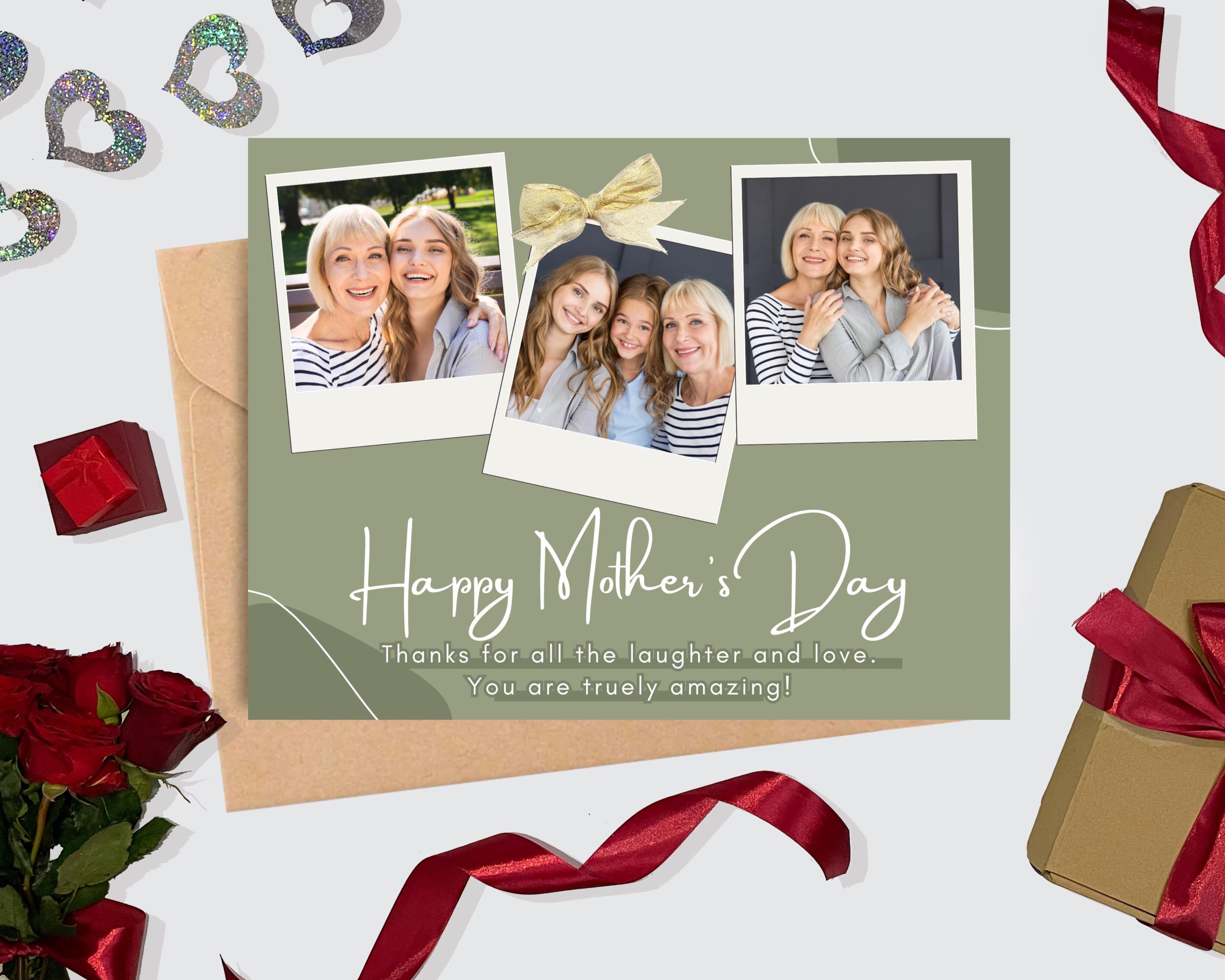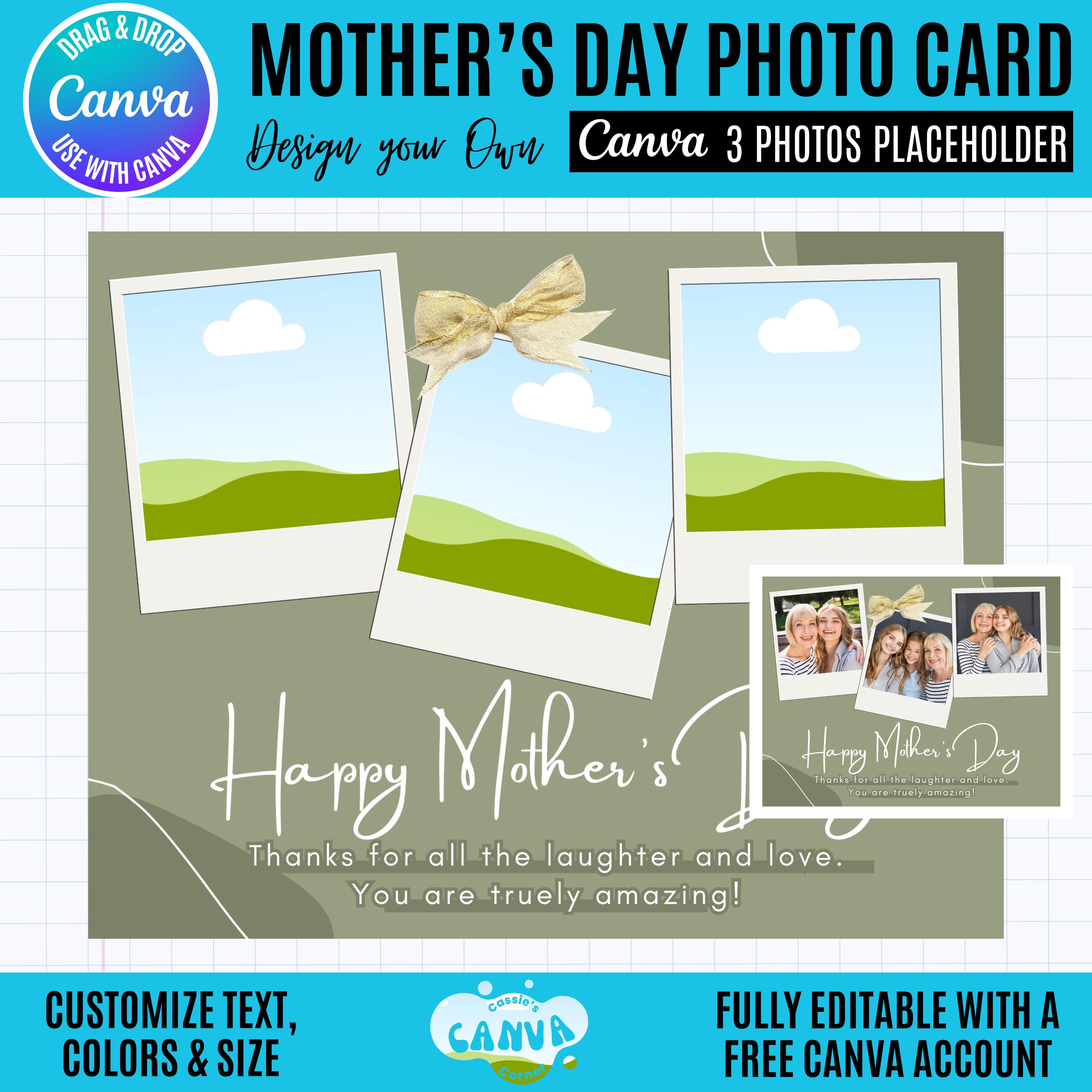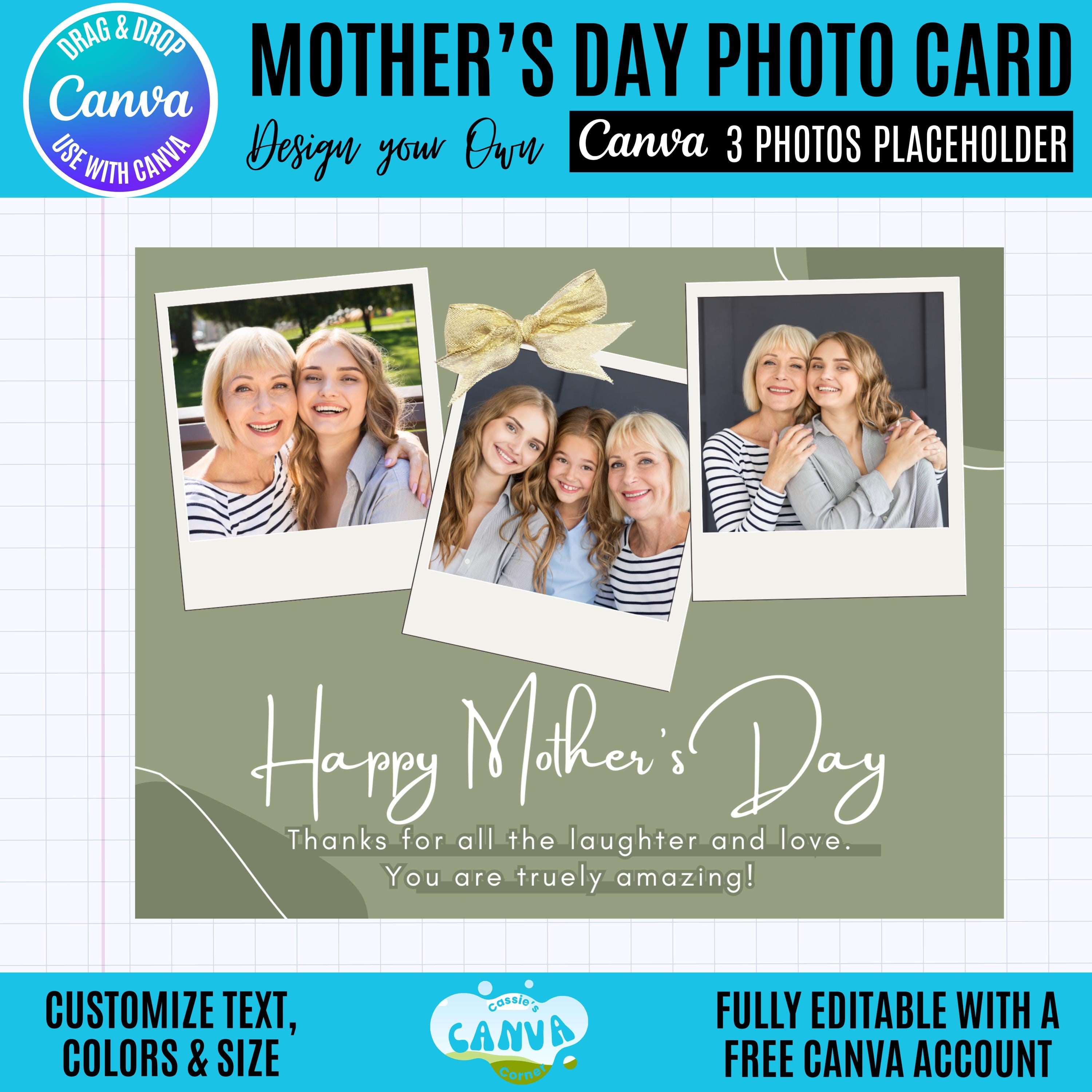 This Canva Mother's Day photo collage card includes a unique photo collage design that has 3 photo placeholders and is perfect for sentimental gifts, prints, or digital sharing.
