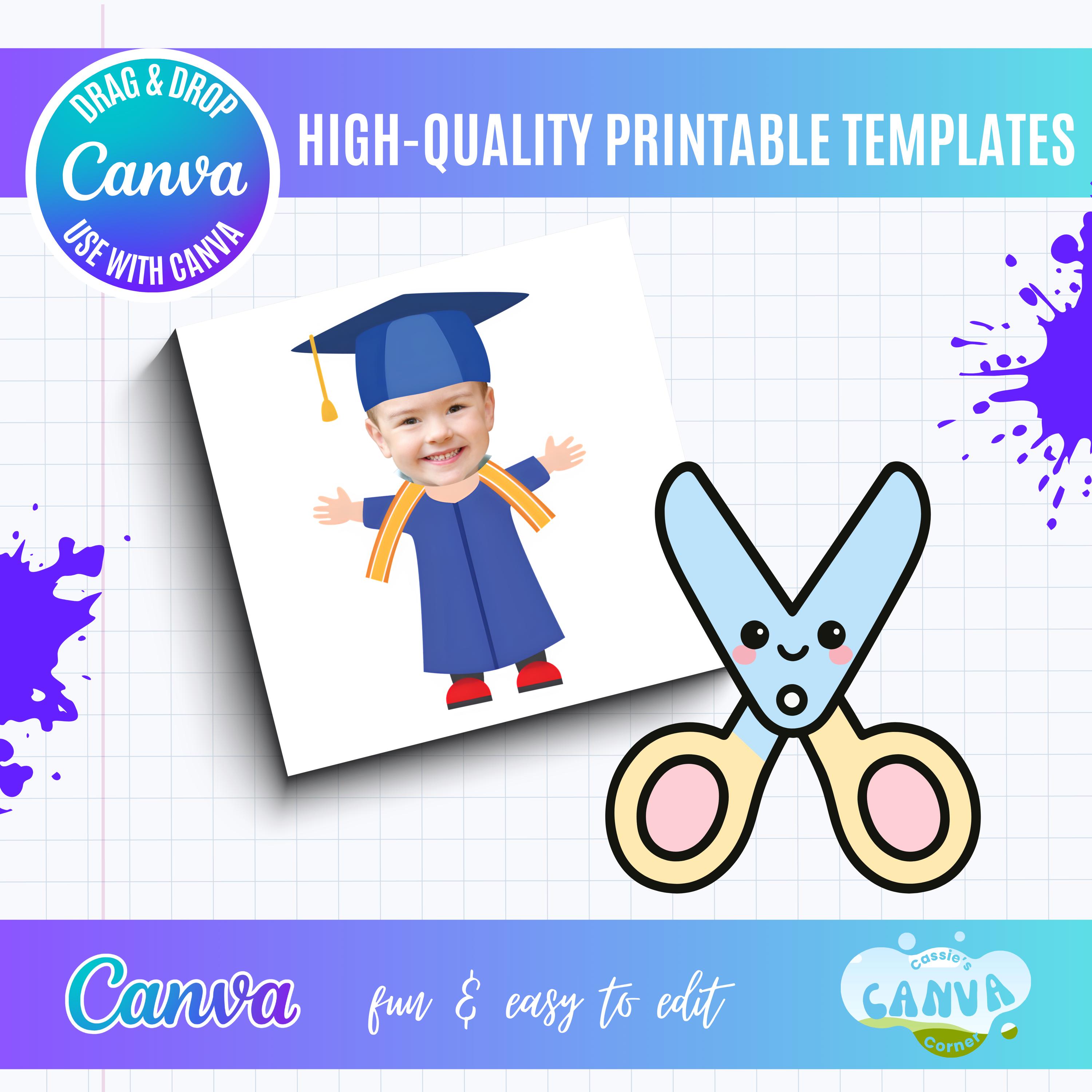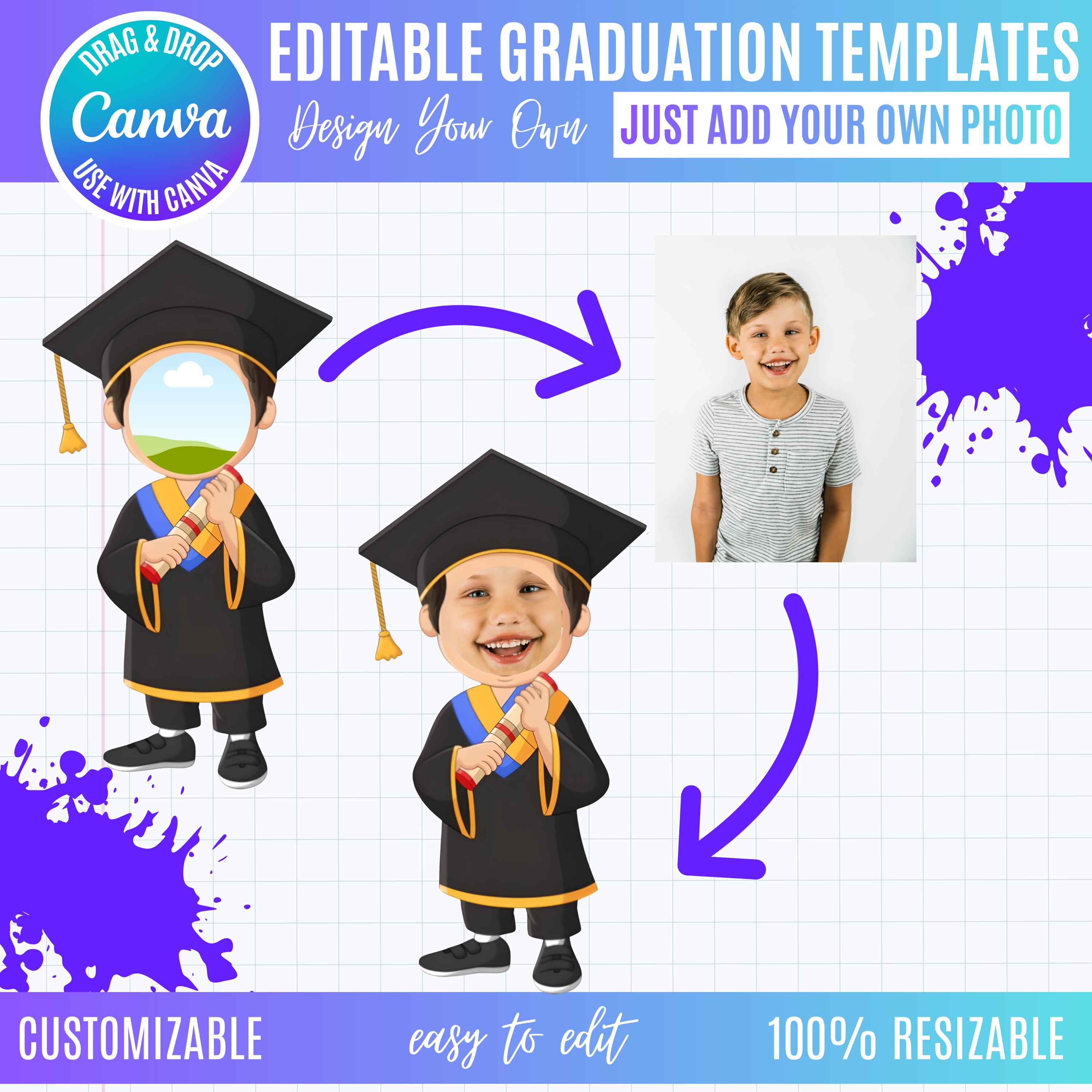 Simply upload your child’s photo in Canva, position it in the face cutout area, and your graduate instantly becomes part of the design!