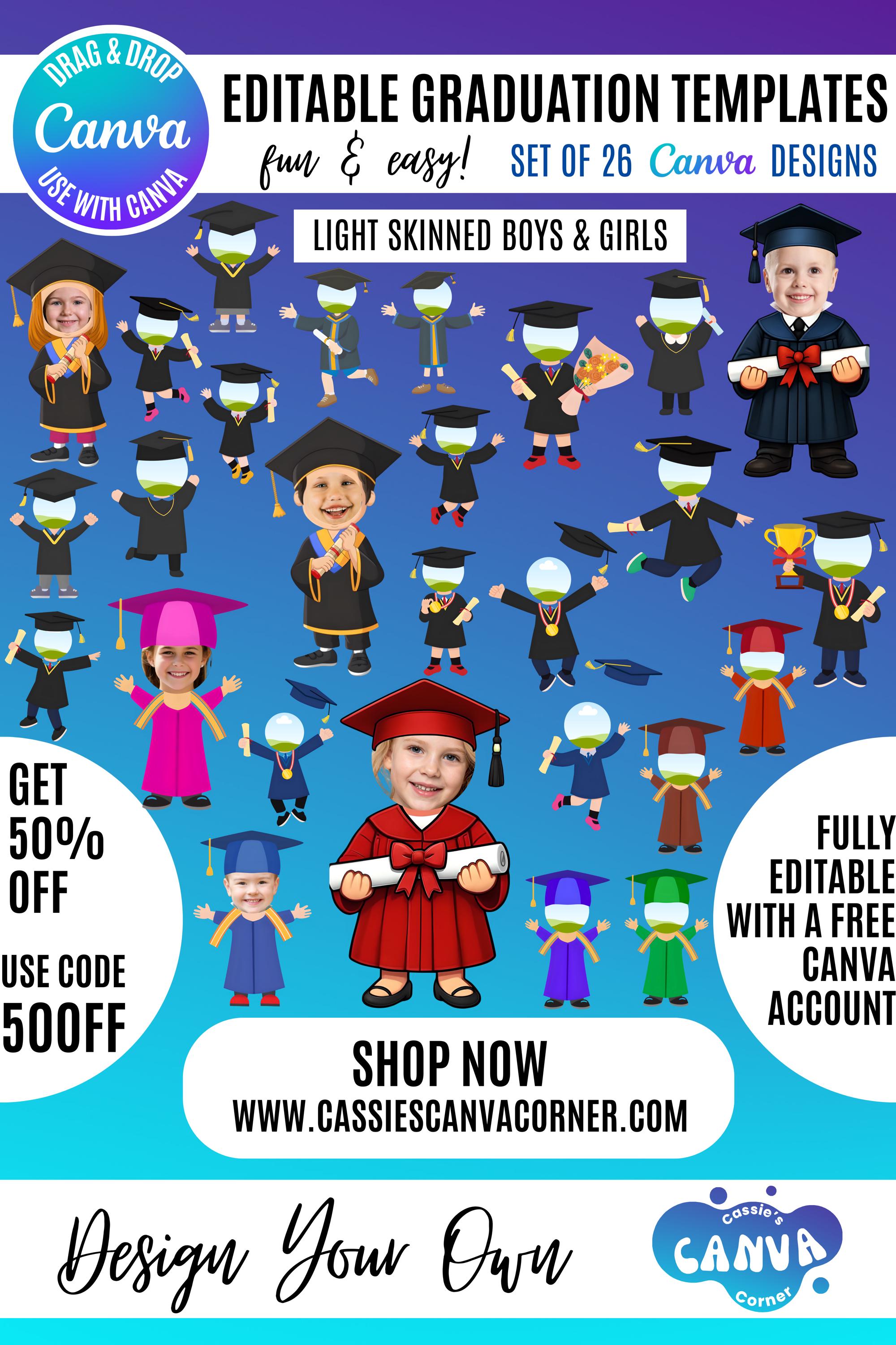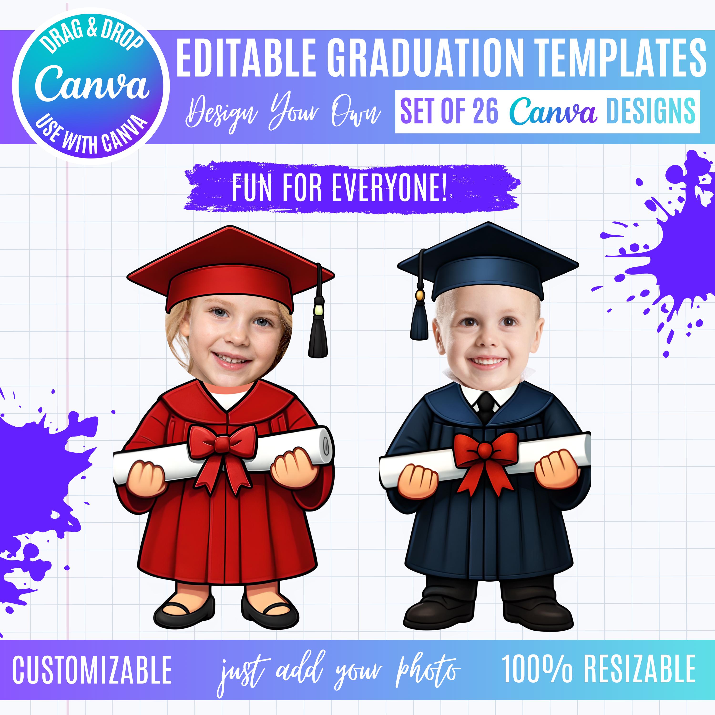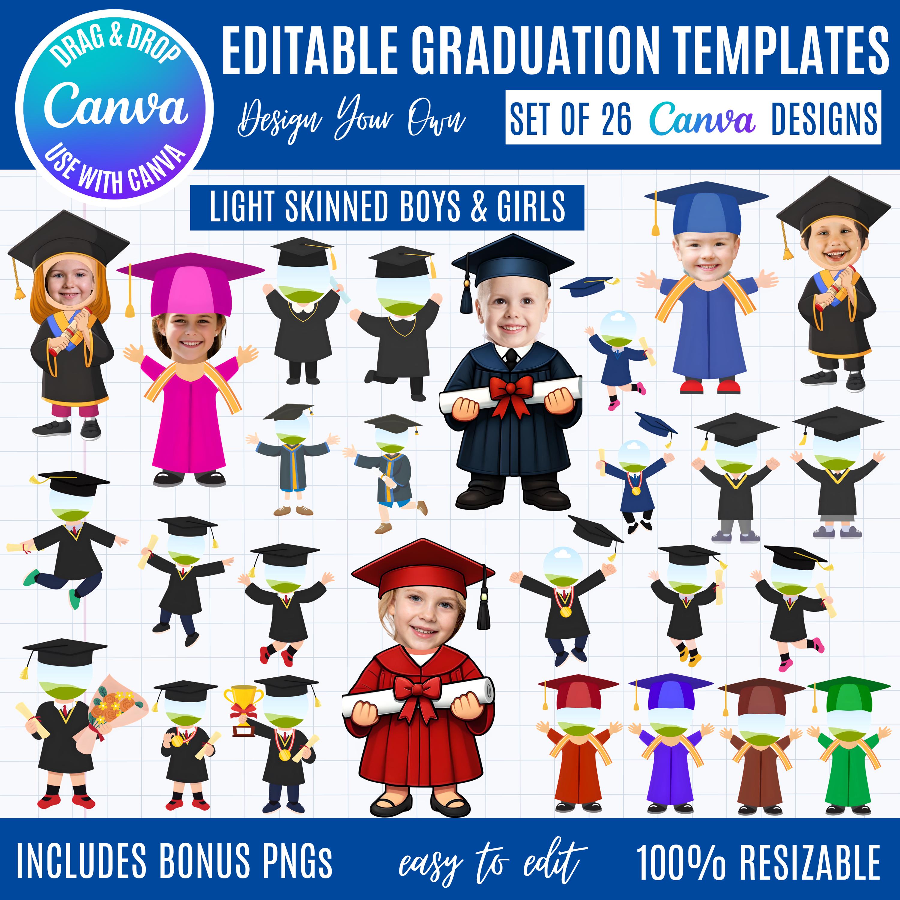 Light skinned Kids Graduation Face Frames Canva Bundle | Funny Kids Graduate Photo Templates | Insert Face Graduation Designs | Editable Canva Templates | Preschool Kindergarten Grad