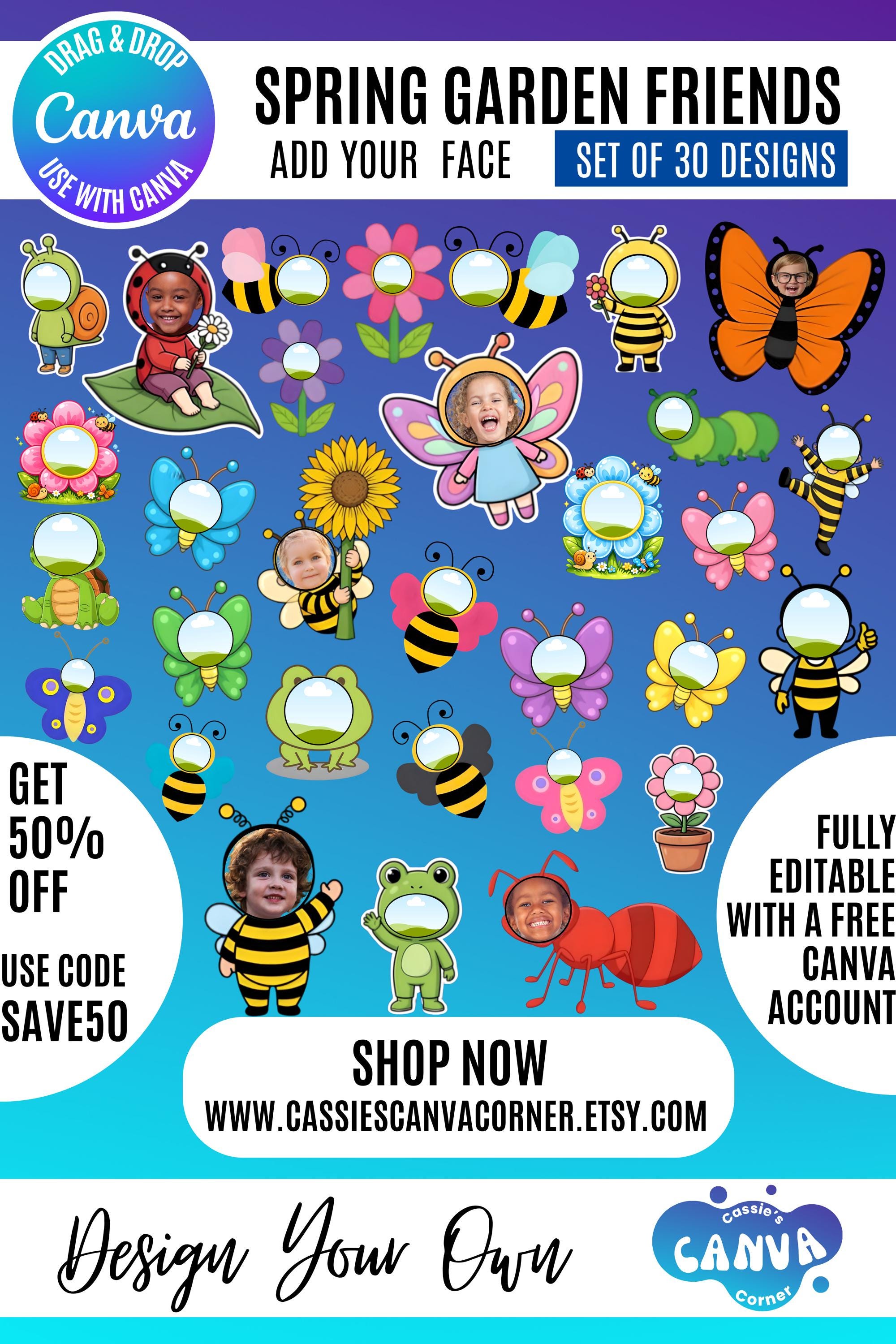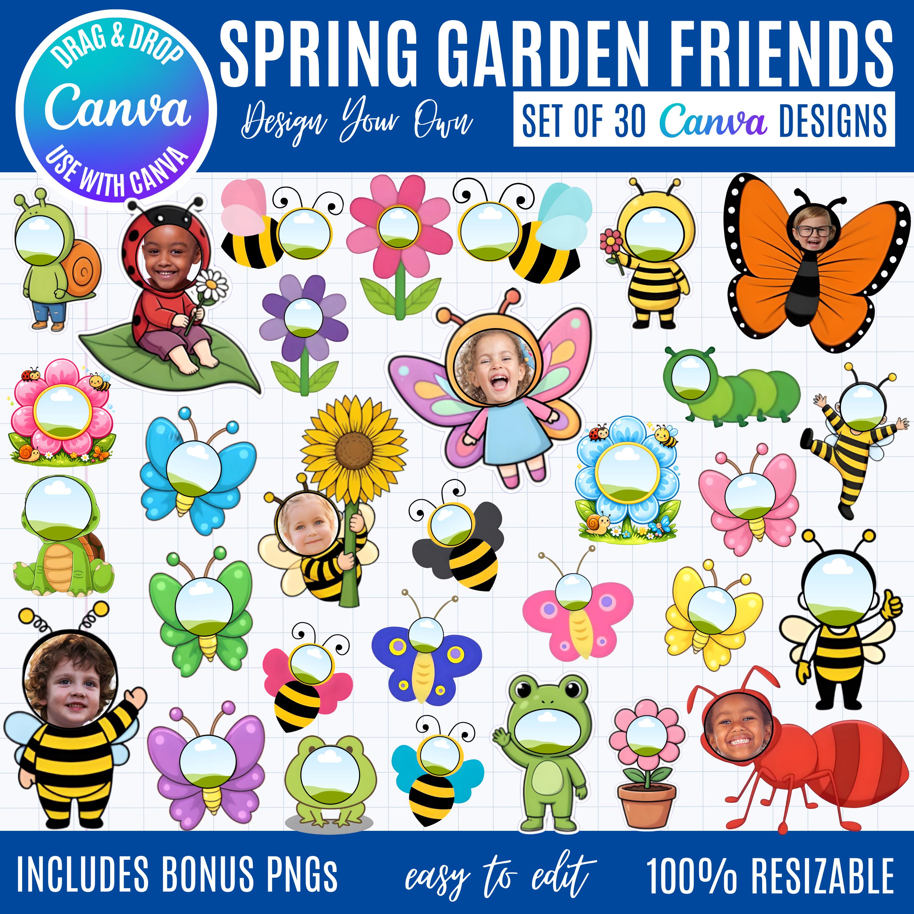 Bring your spring creations to life with this adorable Spring Garden Friends Face Insert Canva Bundle! 🌷🐝🦋