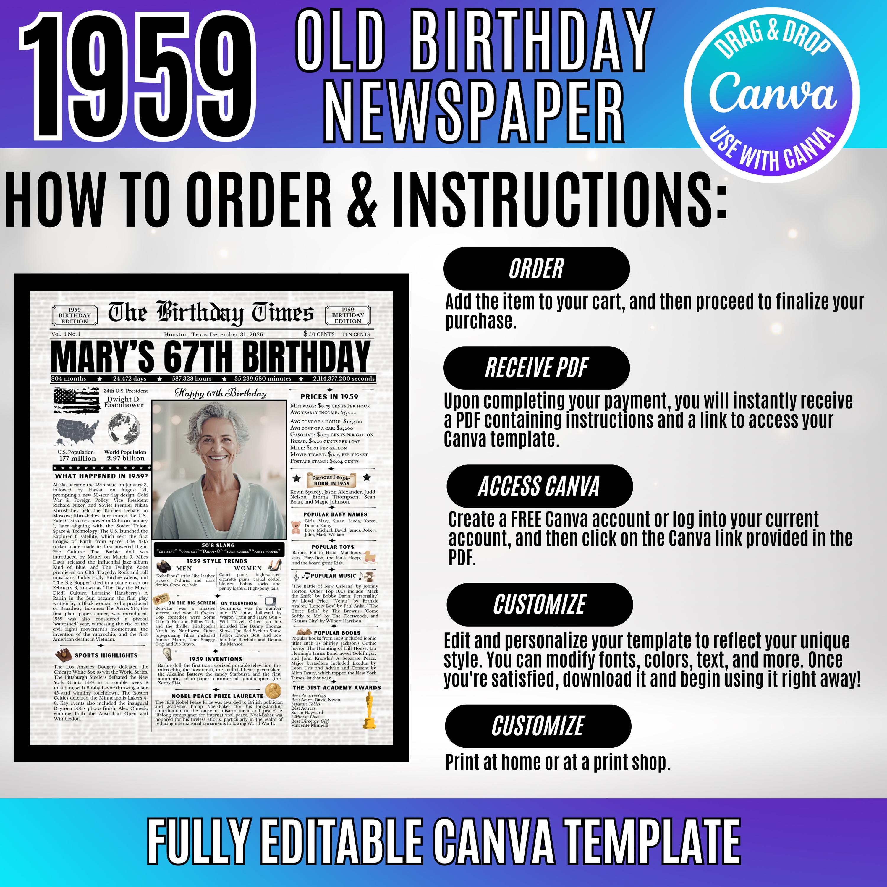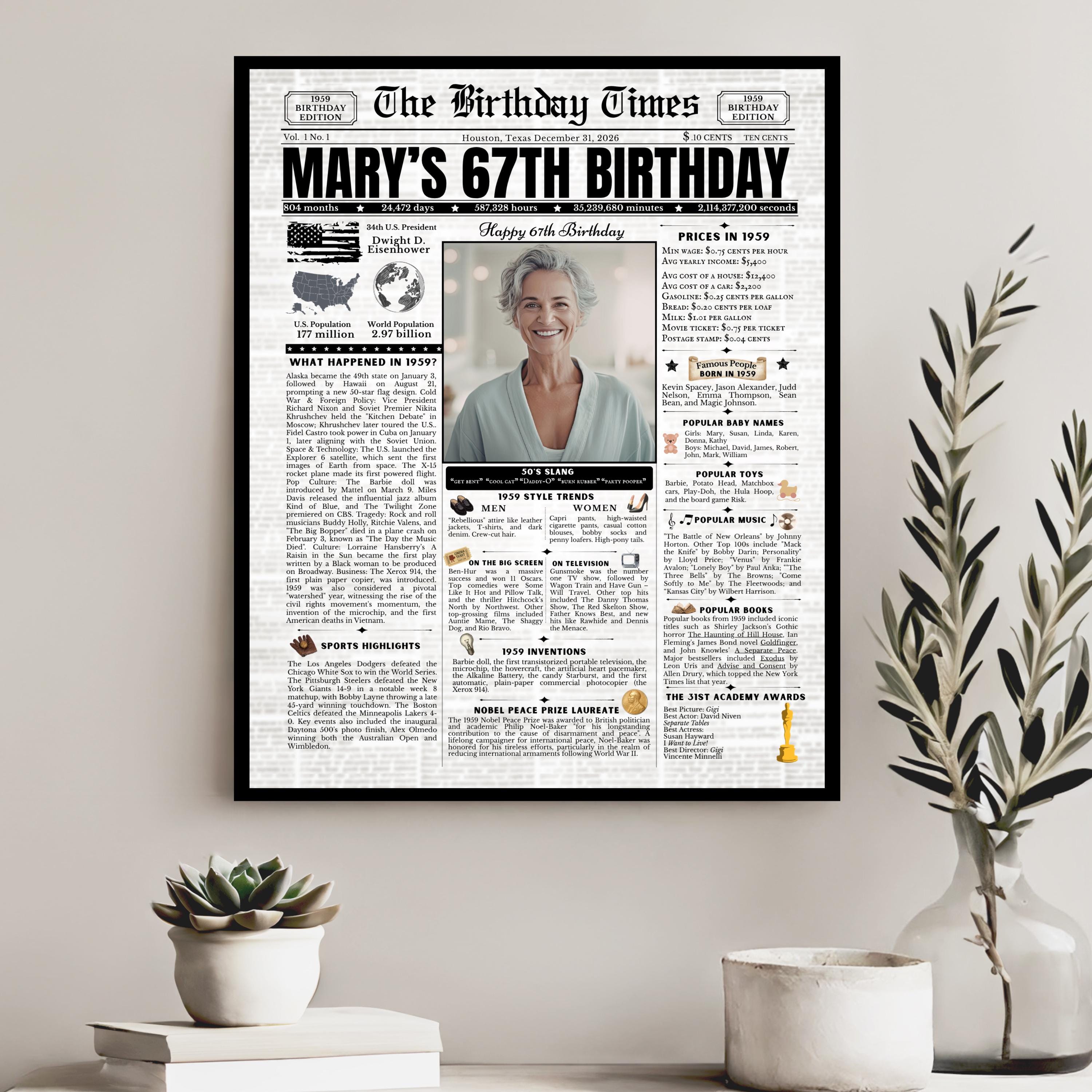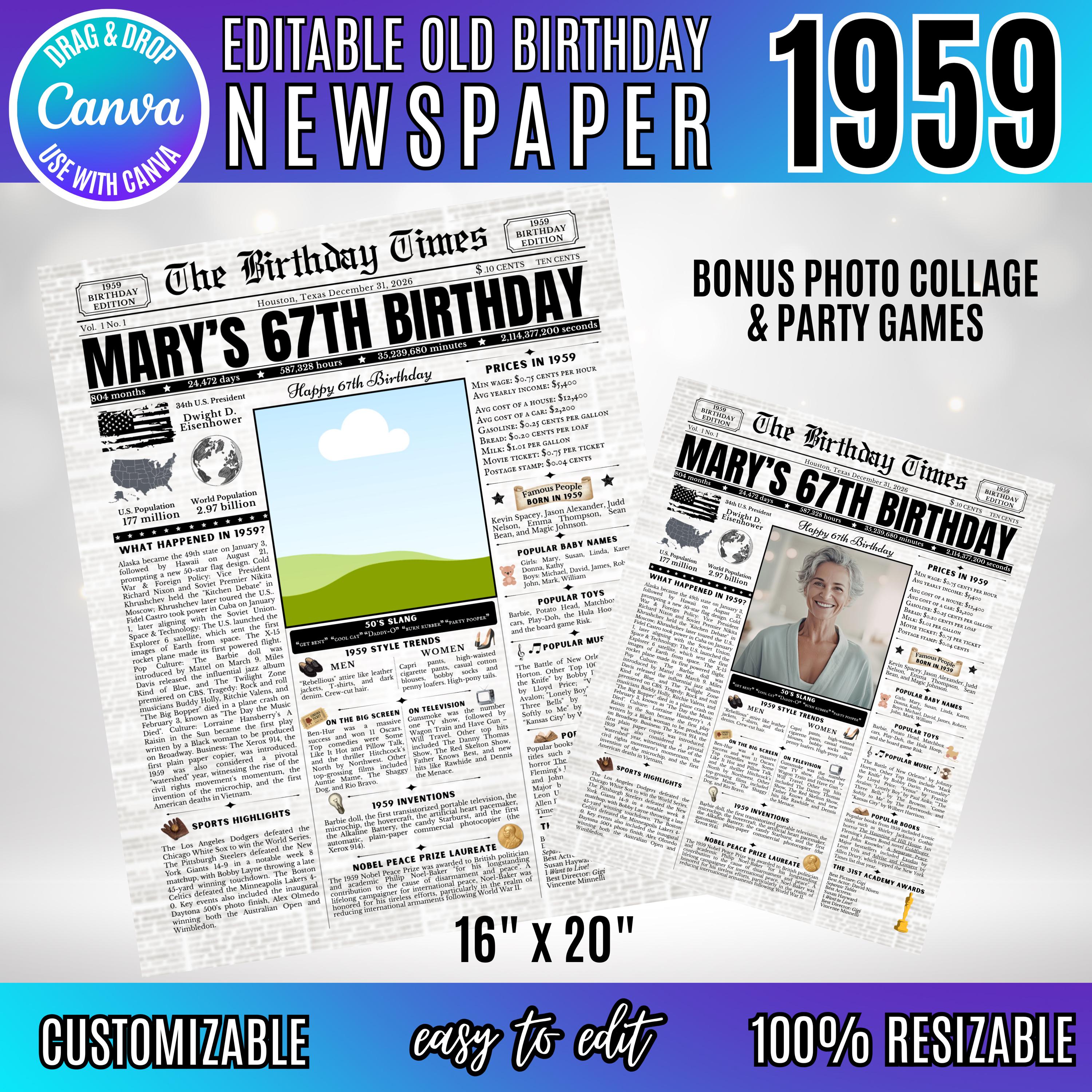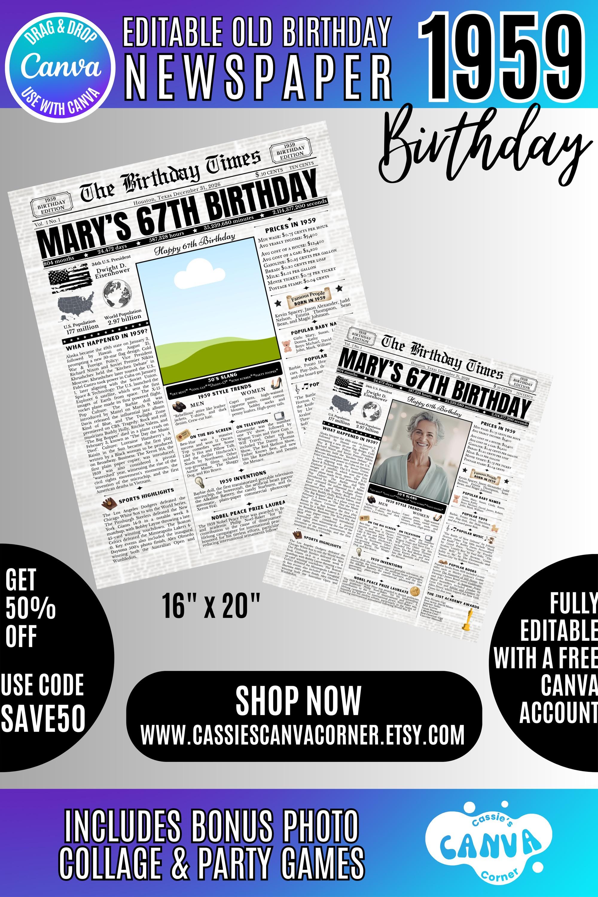 Editable Birthday Newspaper Template Canva | Custom Birth Year Facts Poster | Vintage Newspaper Birthday Sign | Photo Insert Party Decor Printable