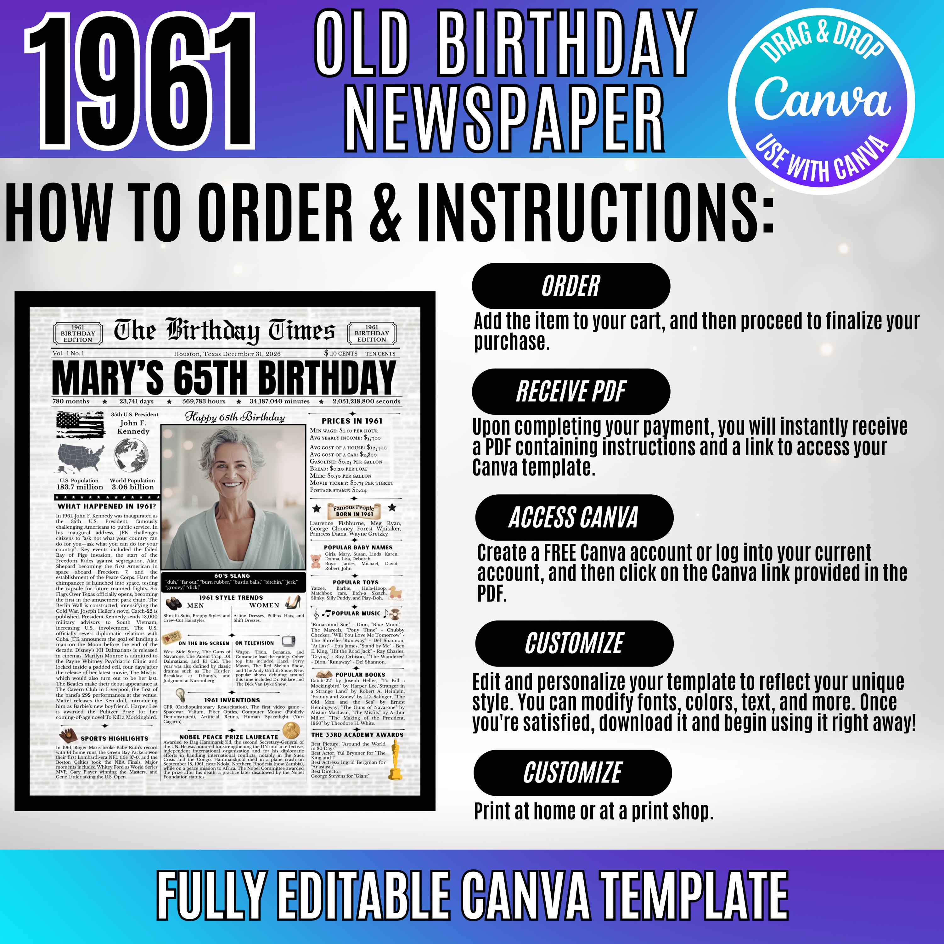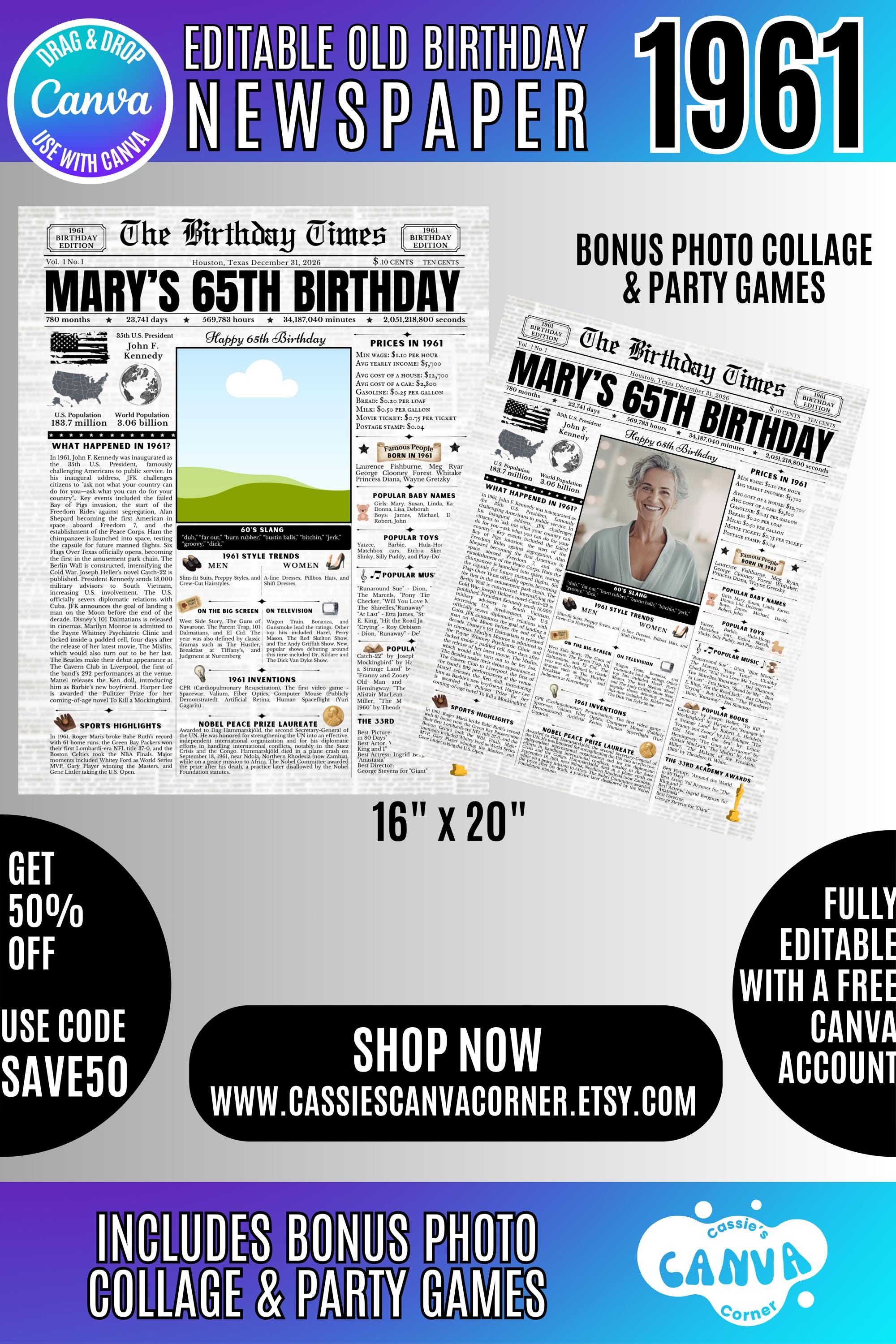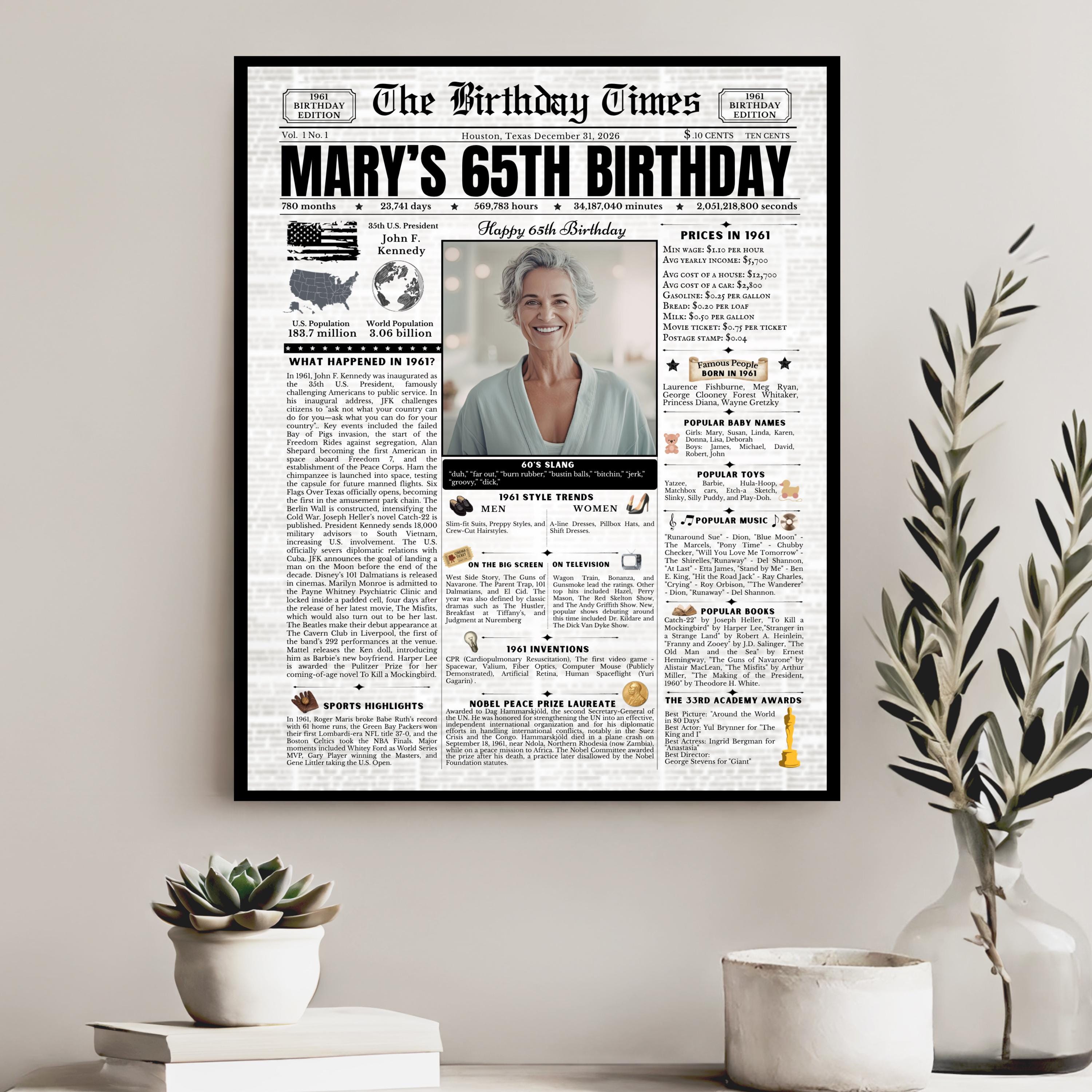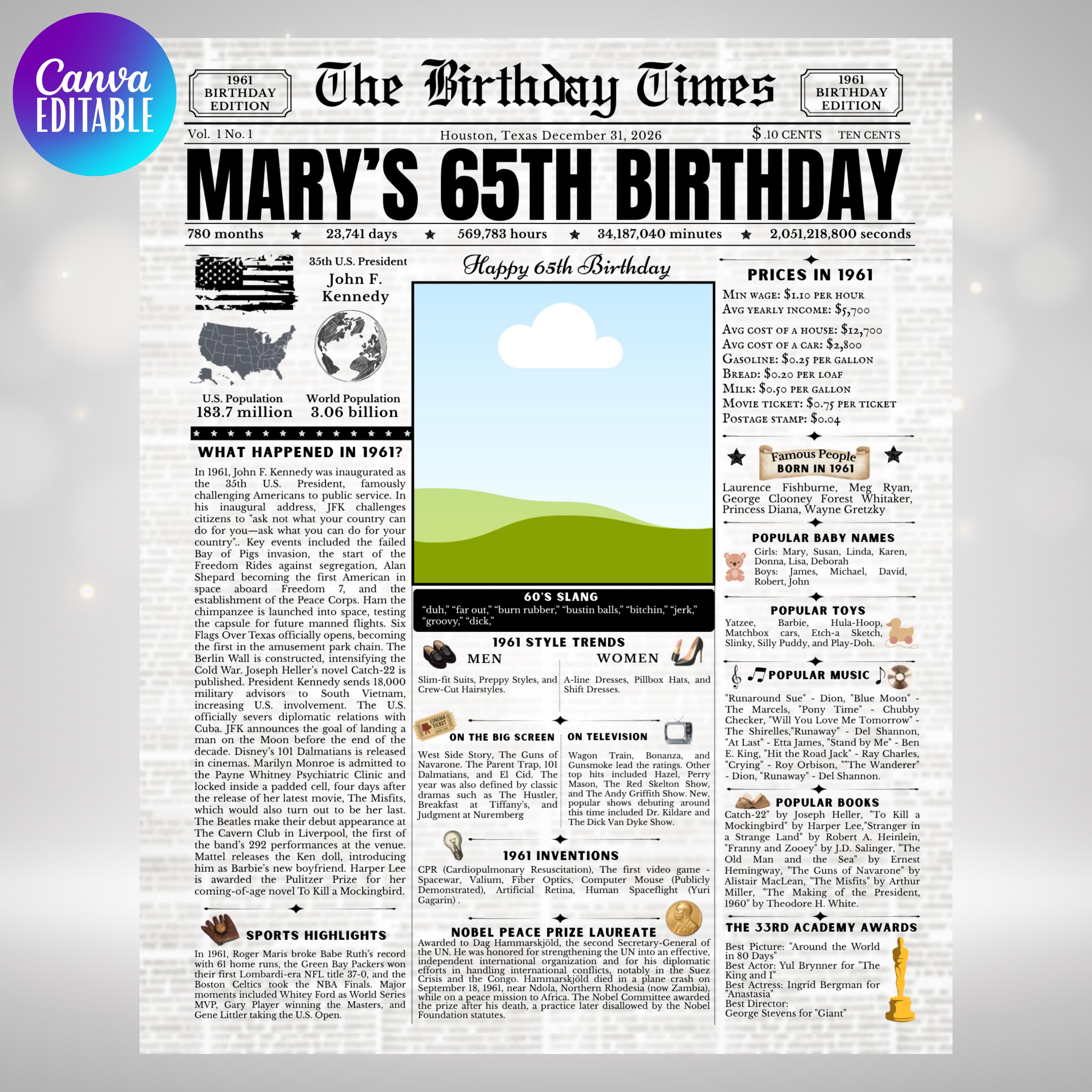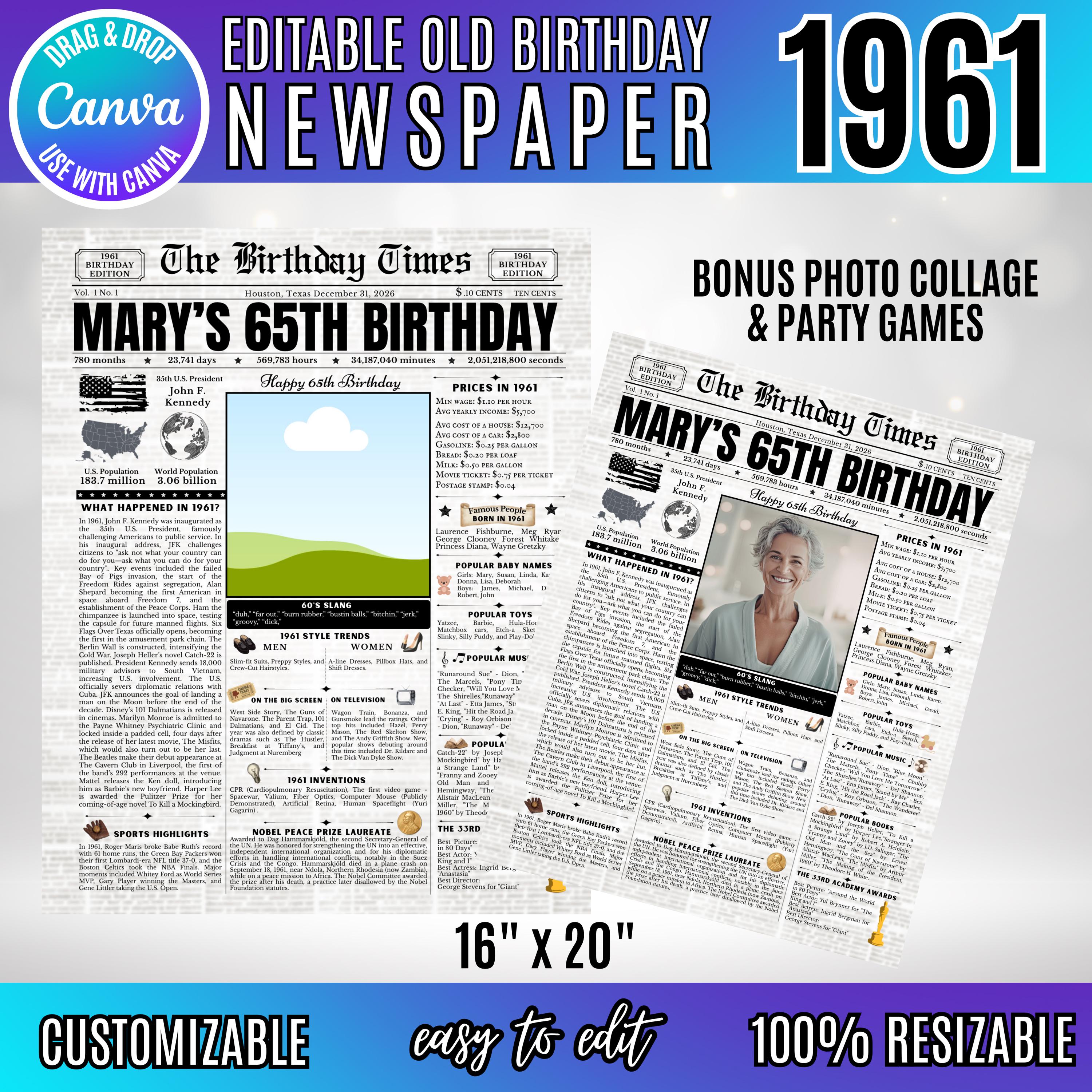 Editable Birthday Newspaper Template Canva | Custom Birth Year Facts Poster | Vintage Newspaper Birthday Sign | Photo Insert Party Decor Printable, 1961 Birthday Card, 65th Birthday