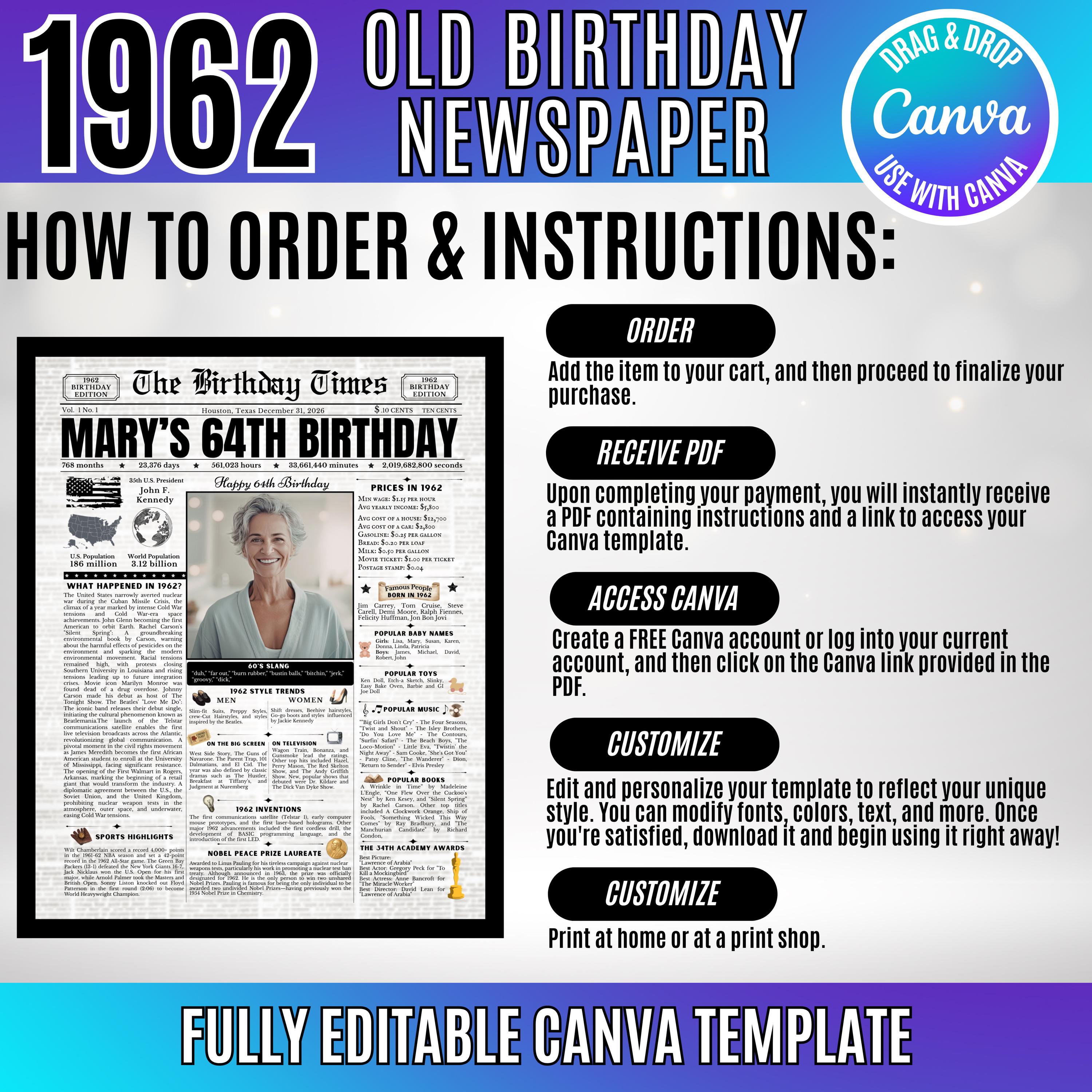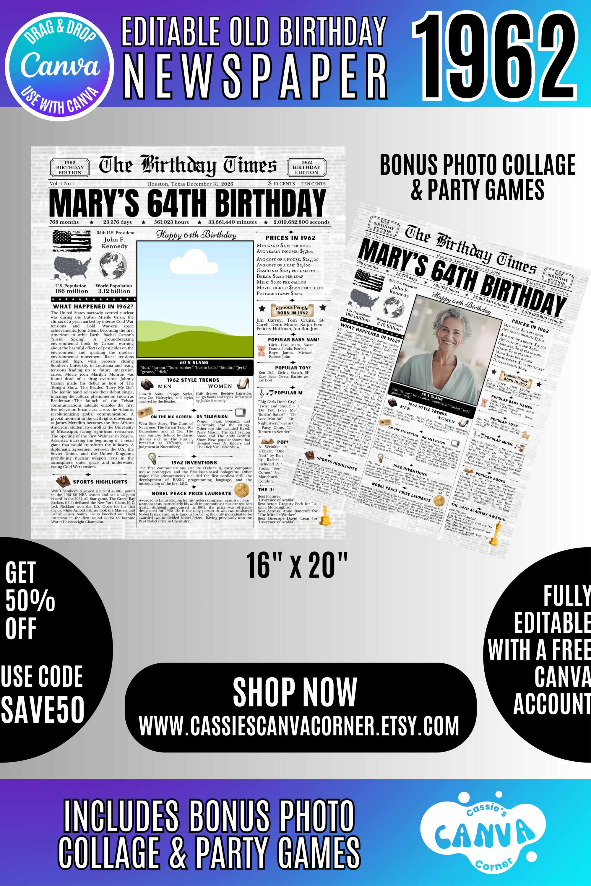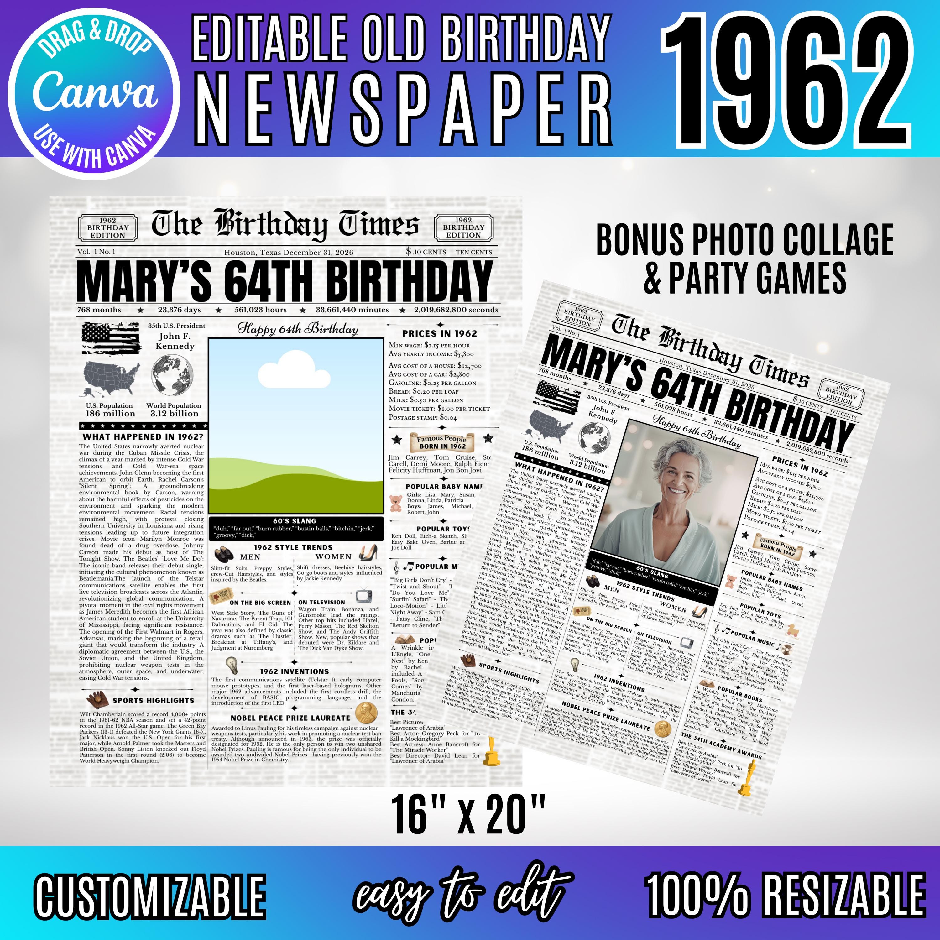 Editable Birthday Newspaper Template Canva | Custom Birth Year Facts Poster | Vintage Newspaper Birthday Sign | Photo Insert Party Decor Printable, 1962 Birthday Card, 64th Birthday