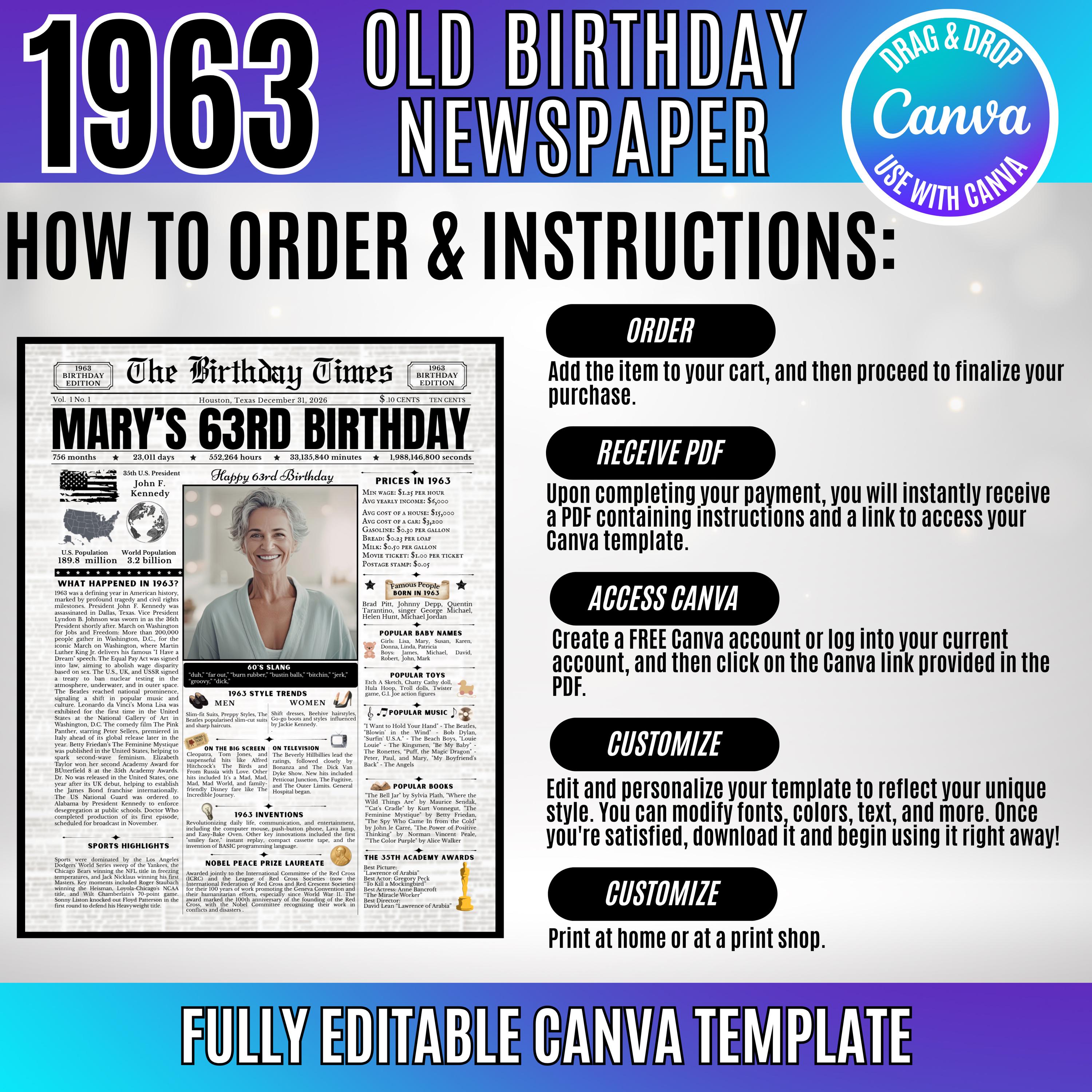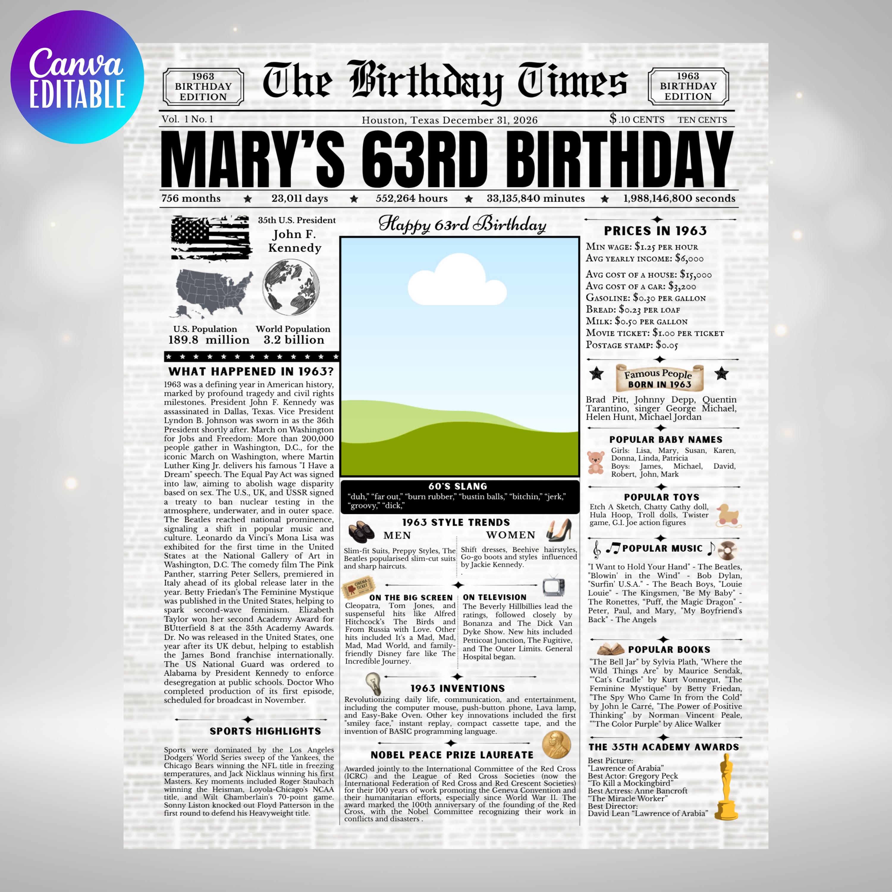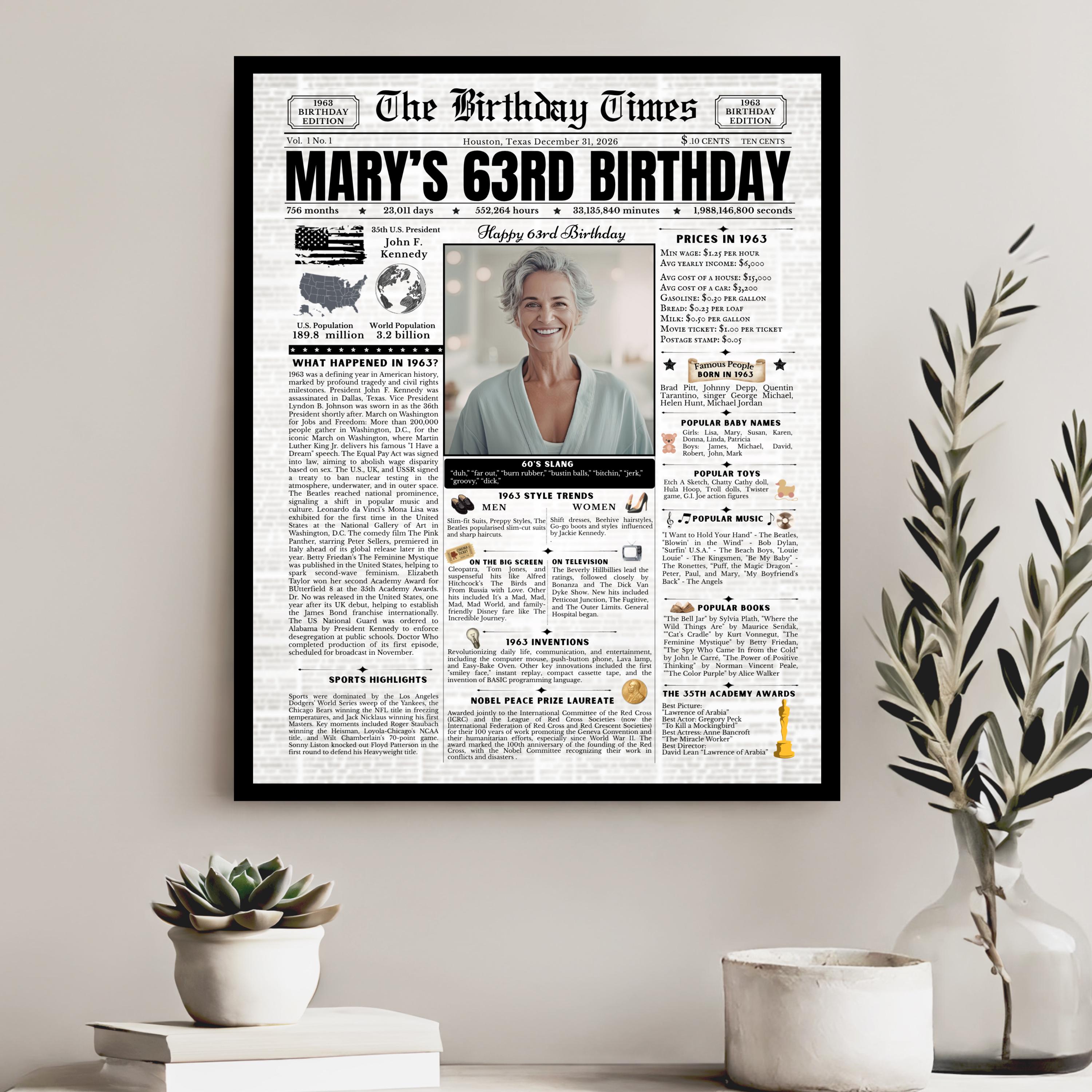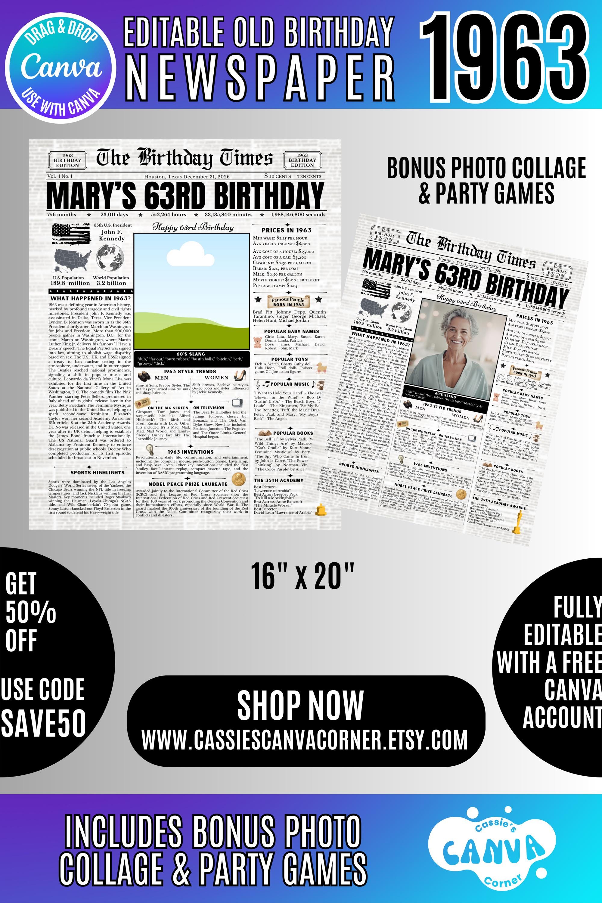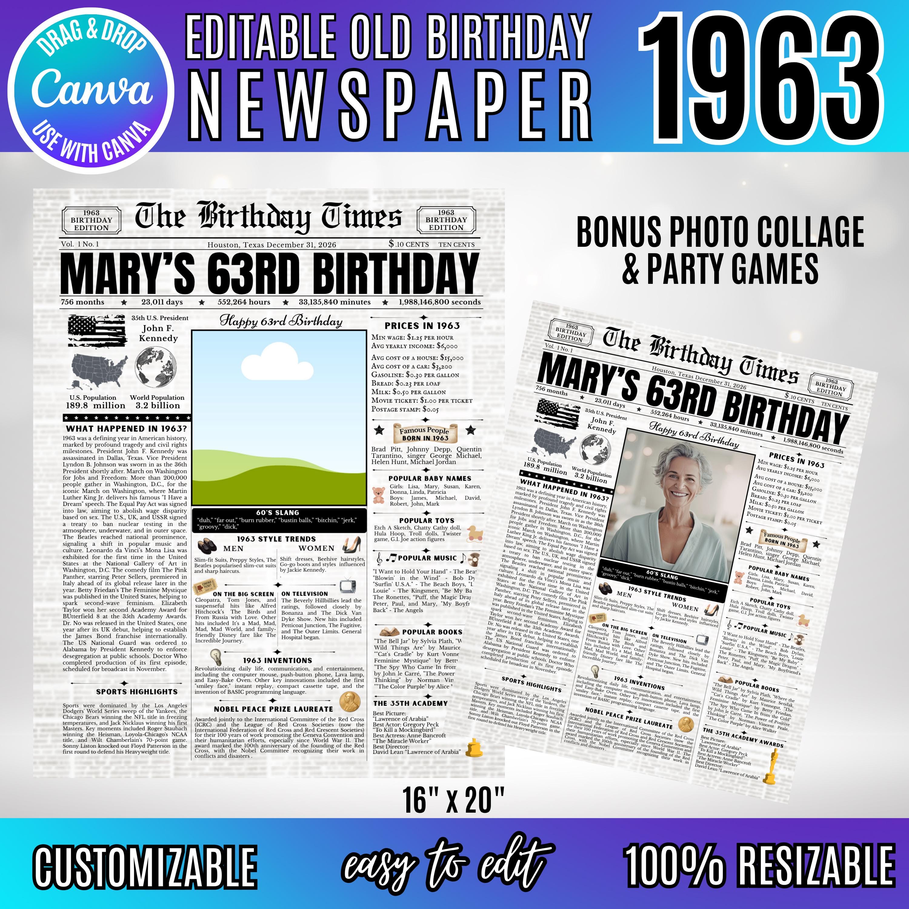 Editable Birthday Newspaper Template Canva | Custom Birth Year Facts Poster | Vintage Newspaper Birthday Sign | Photo Insert Party Decor Printable, 1963 Birthday Card, 63rd Birthday