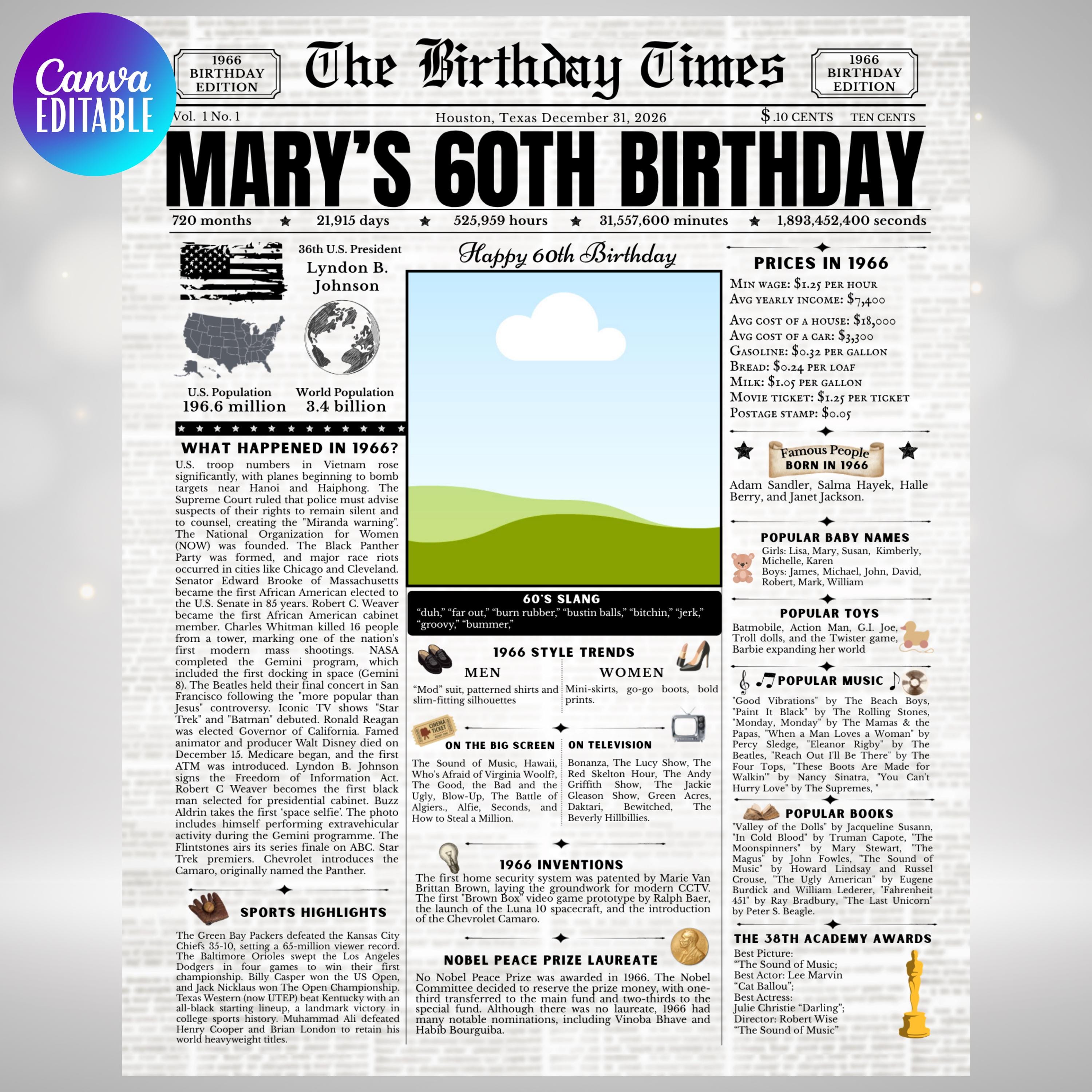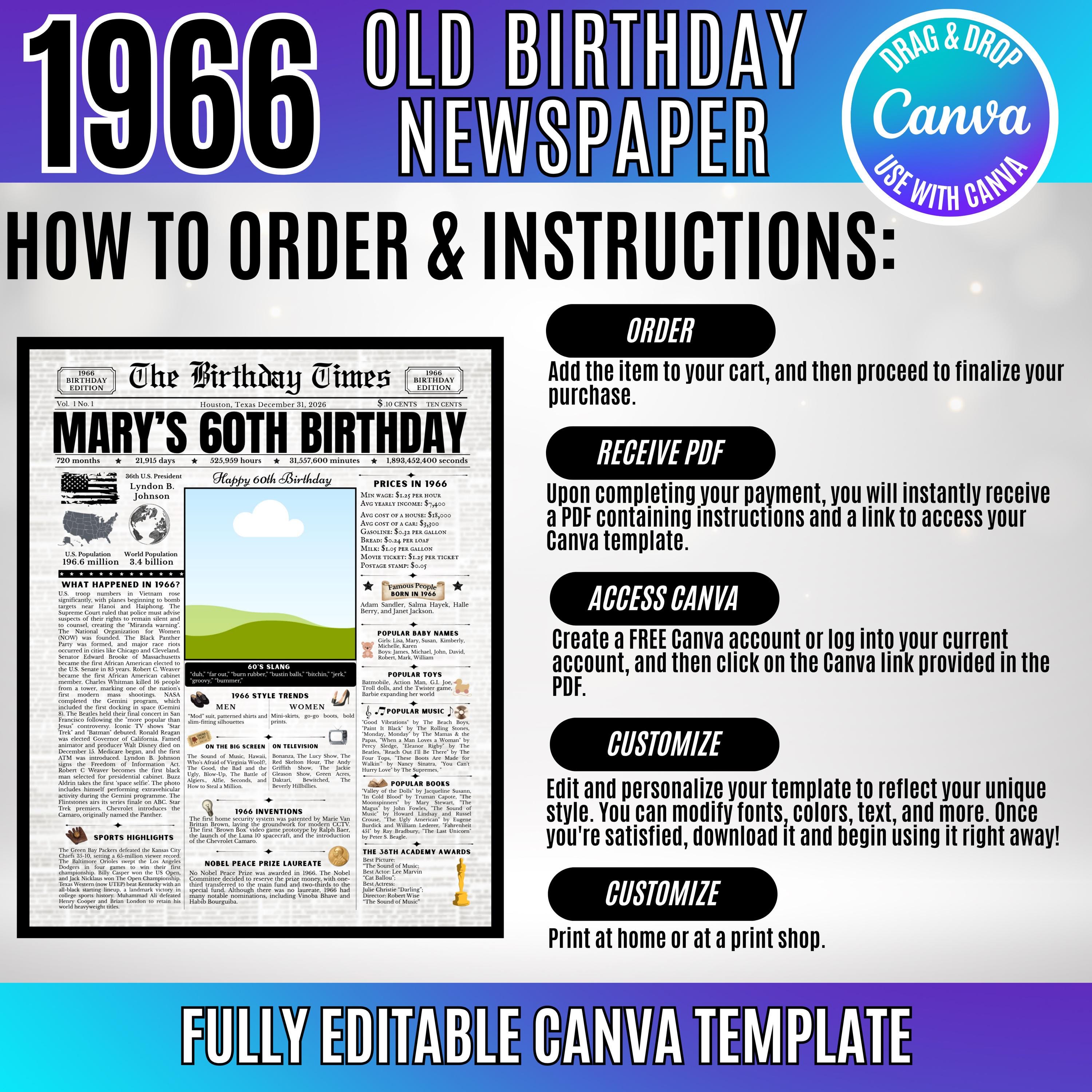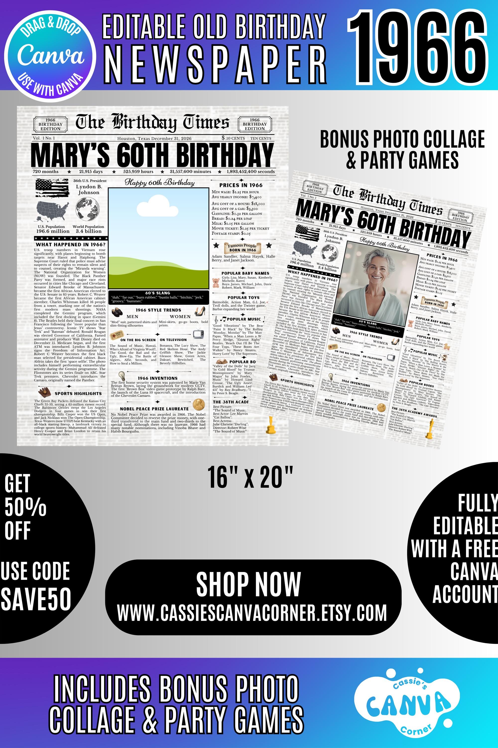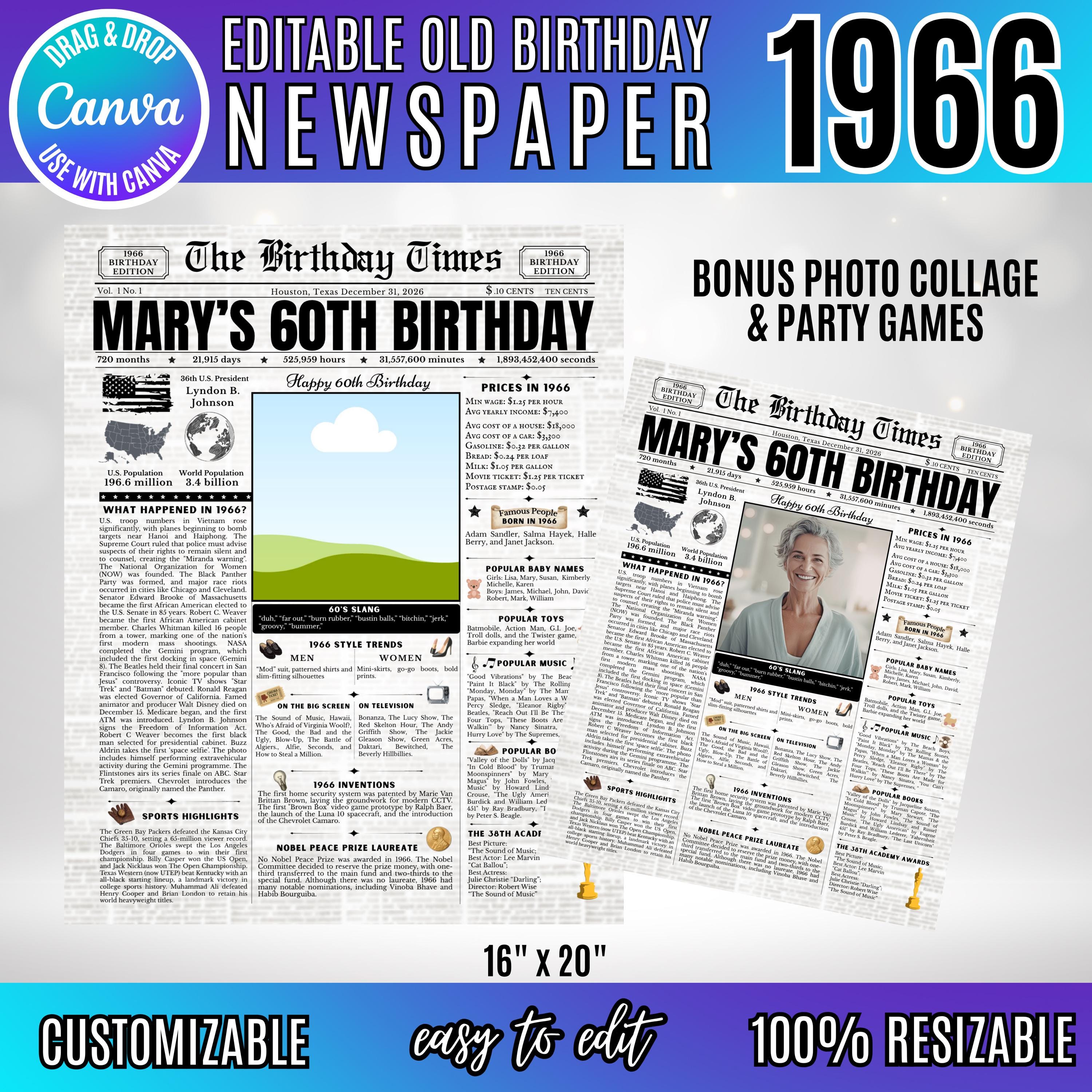 Editable Birthday Newspaper Template Canva | Custom Birth Year Facts Poster | Vintage Newspaper Birthday Sign | Photo Insert Party Decor Printable, 1966 Birthday Card, 60th Birthday