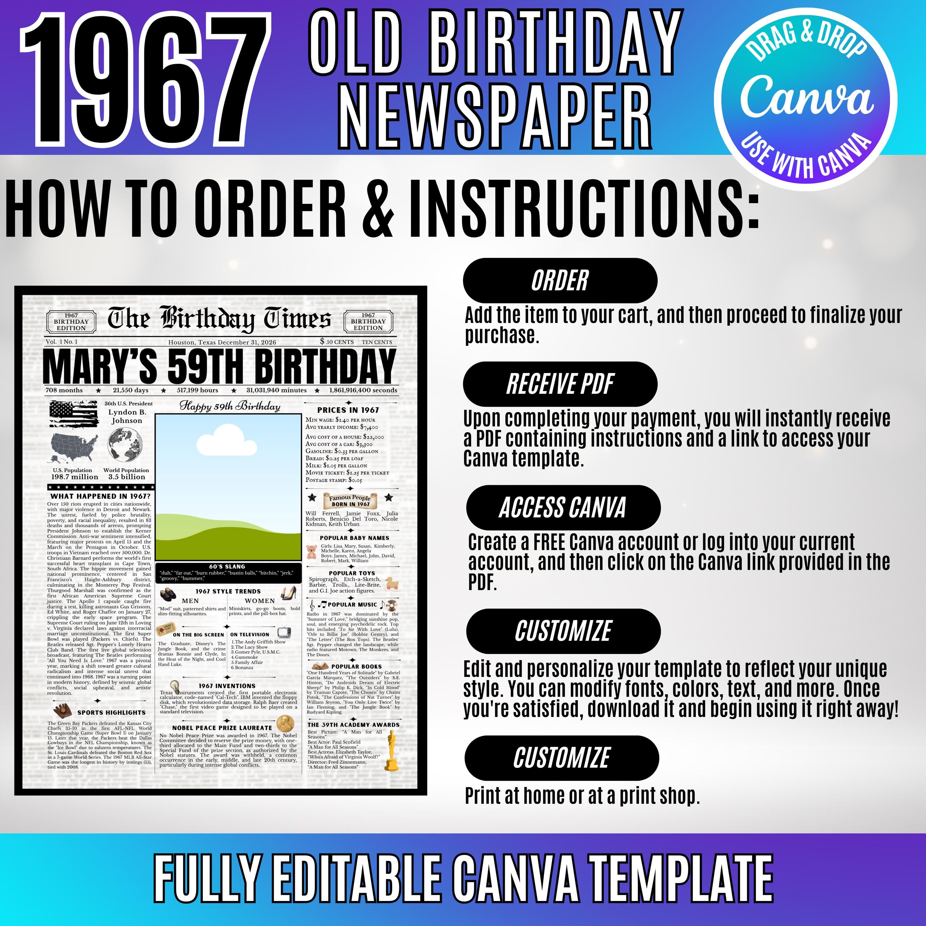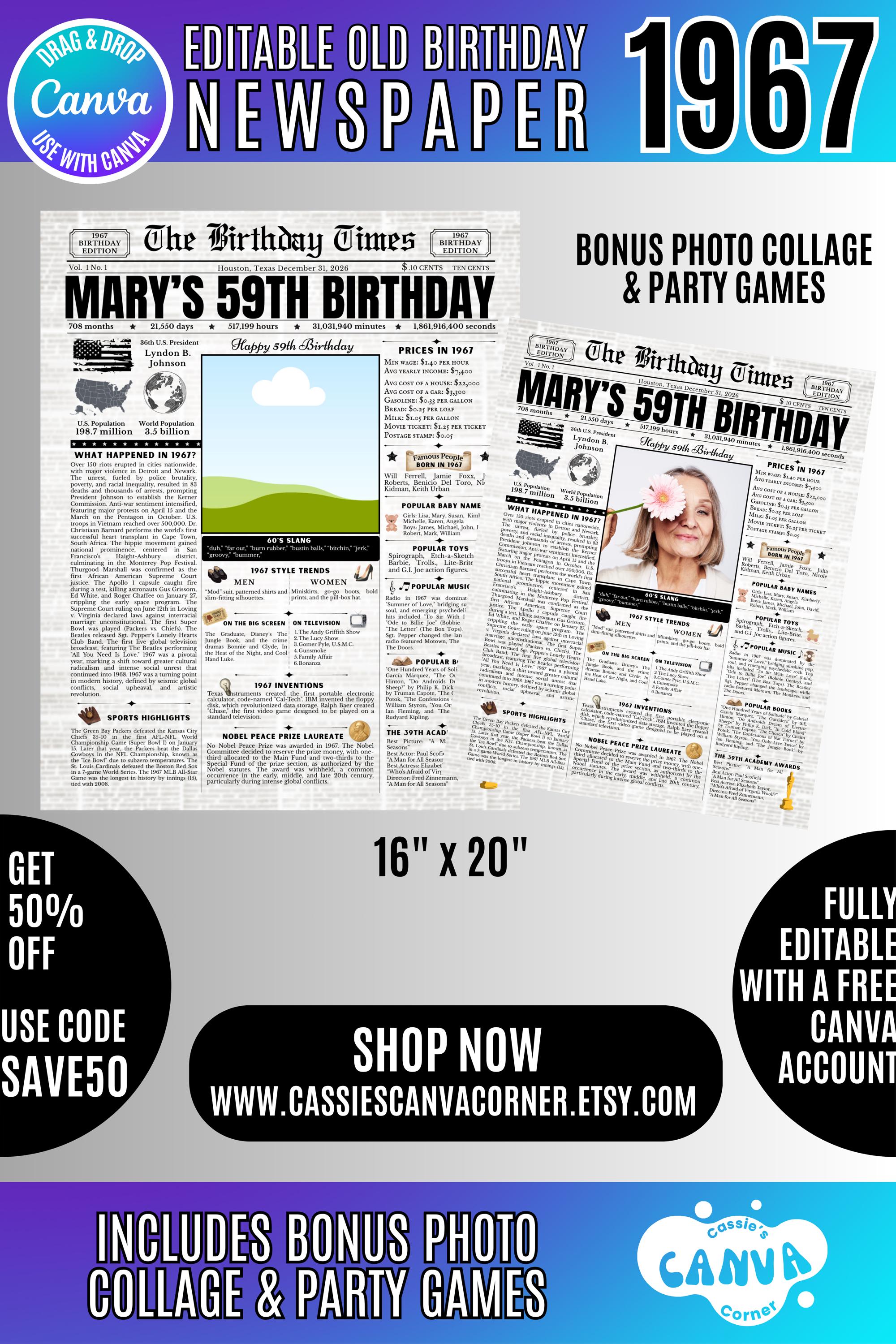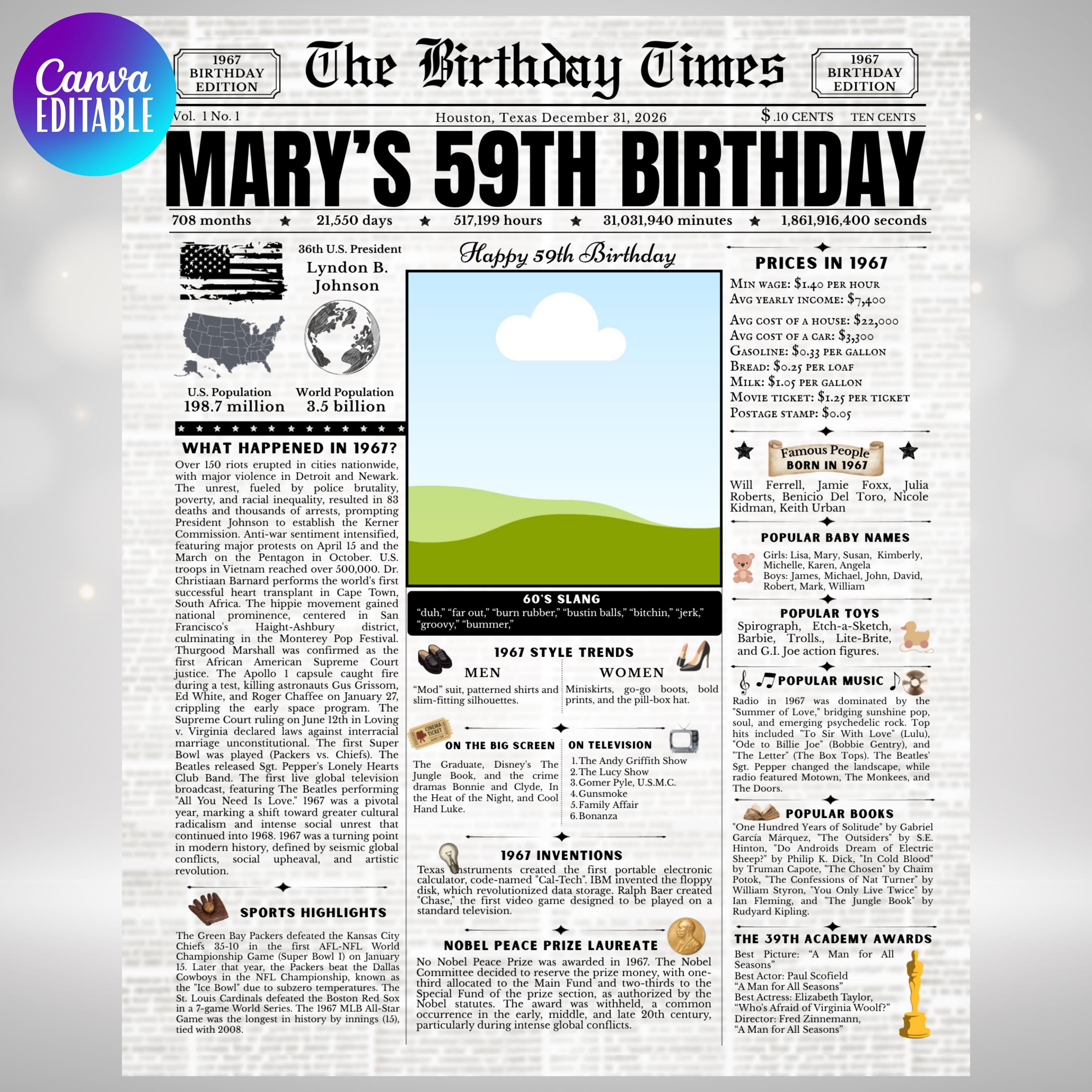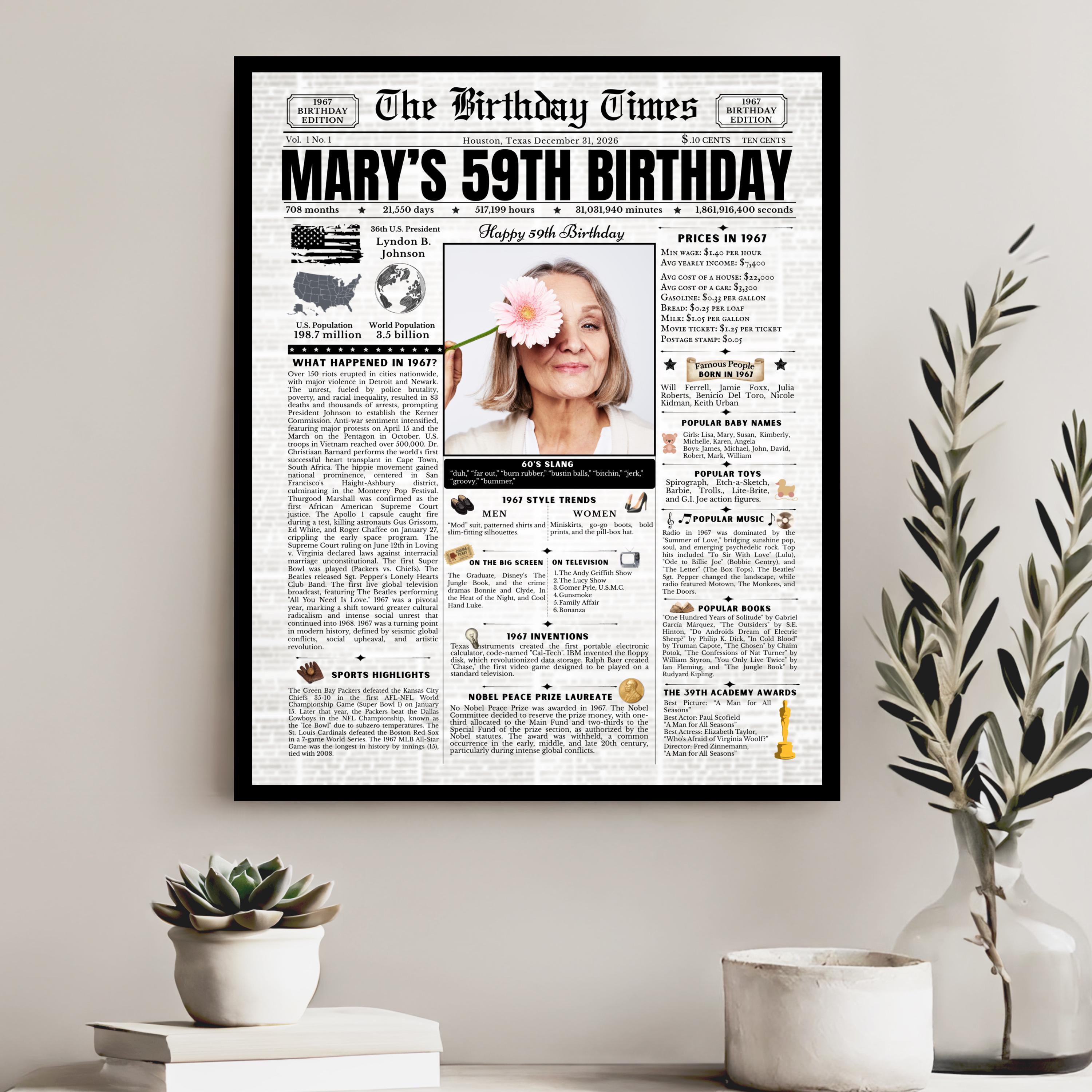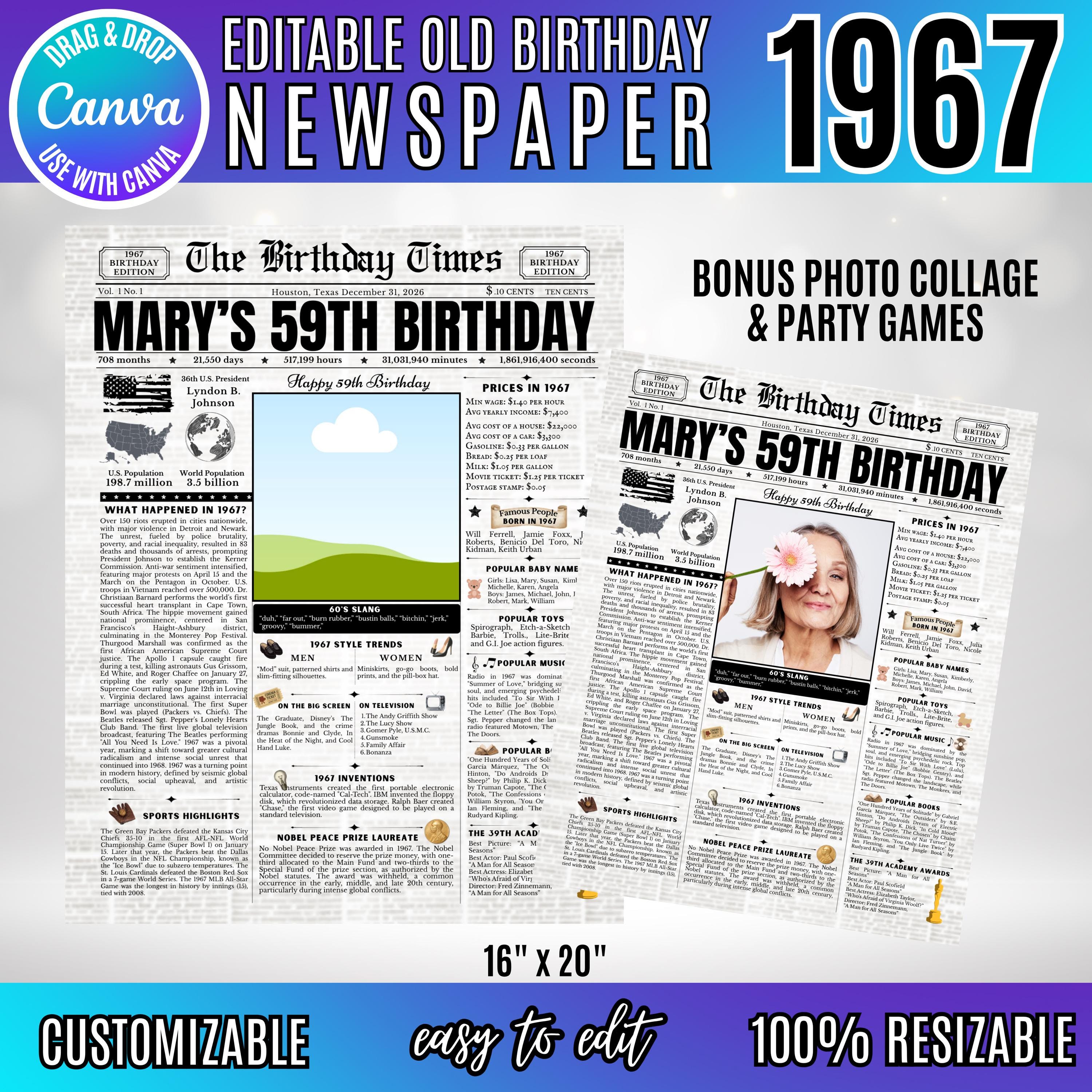 Editable Birthday Newspaper Template Canva | Custom Birth Year Facts Poster | Vintage Newspaper Birthday Sign | Photo Insert Party Decor Printable, 1967 Birthday Card, 59th Birthday
