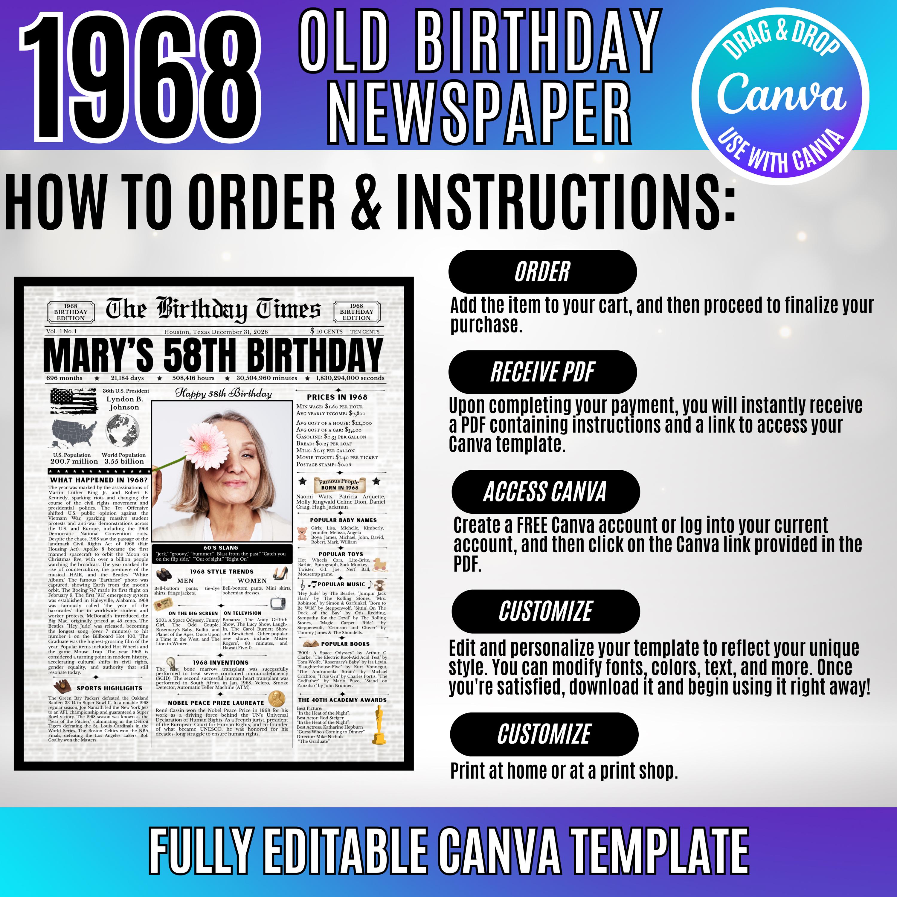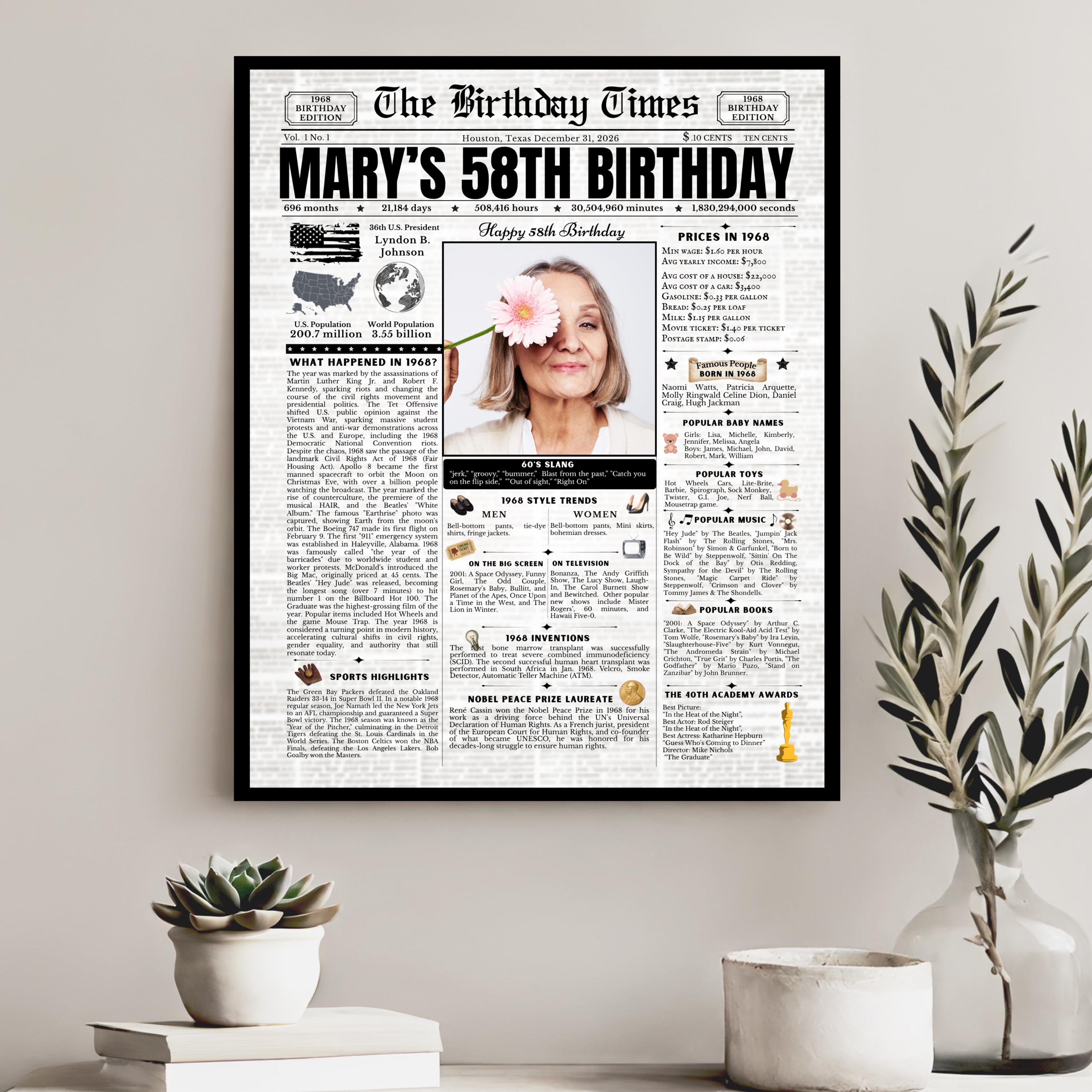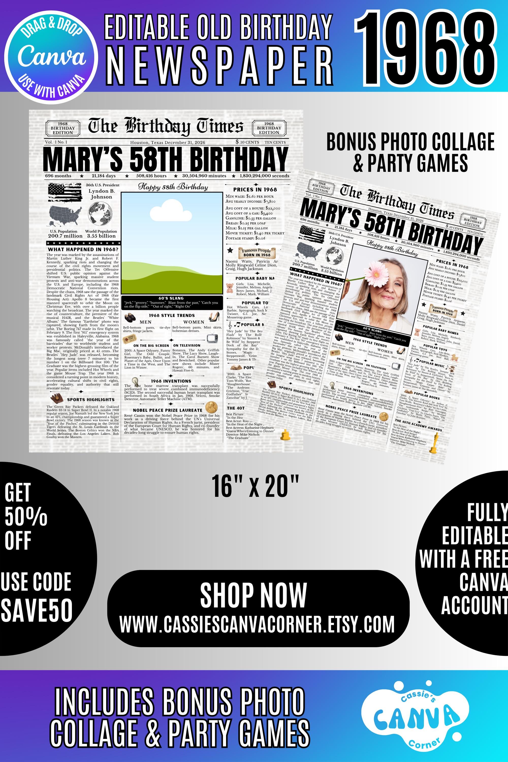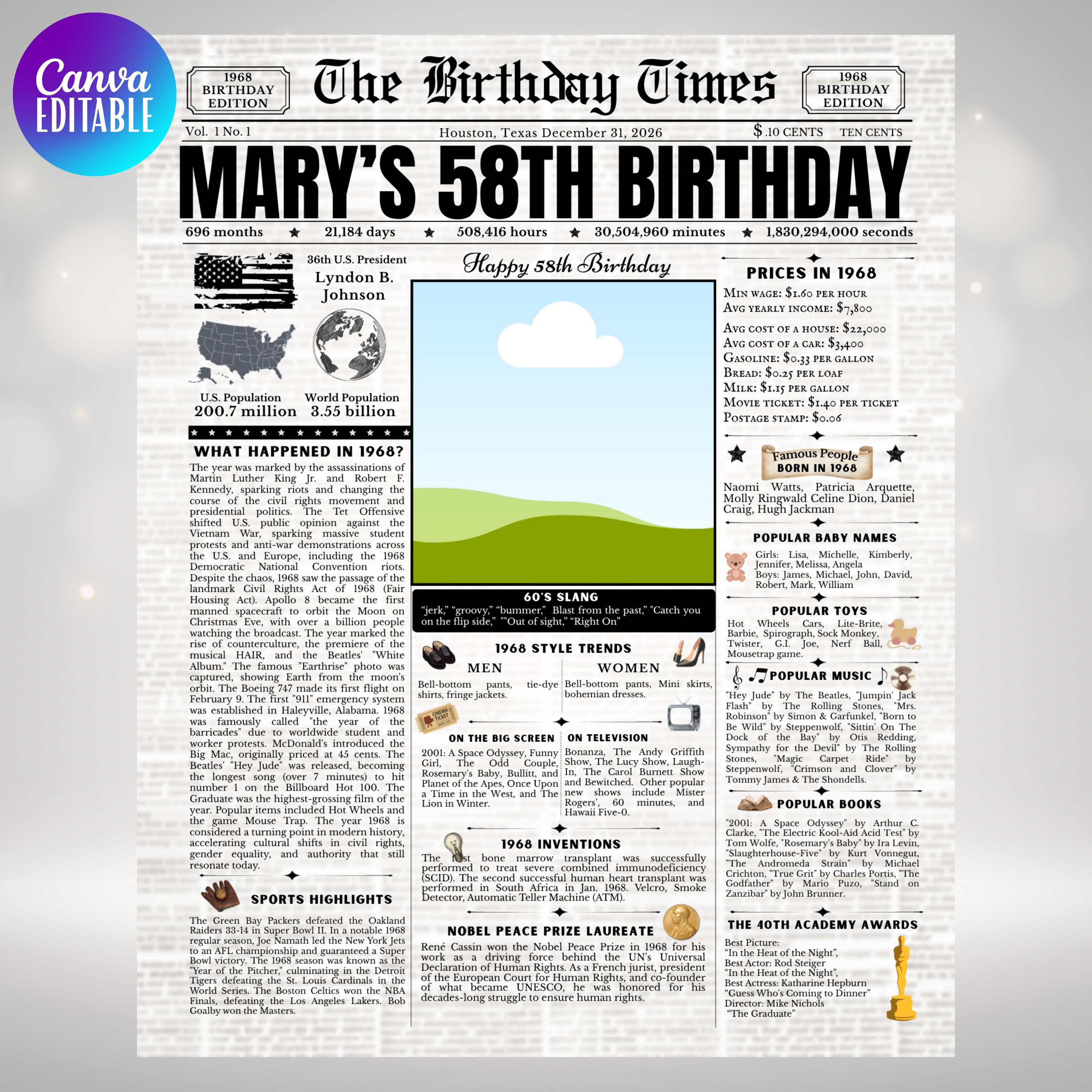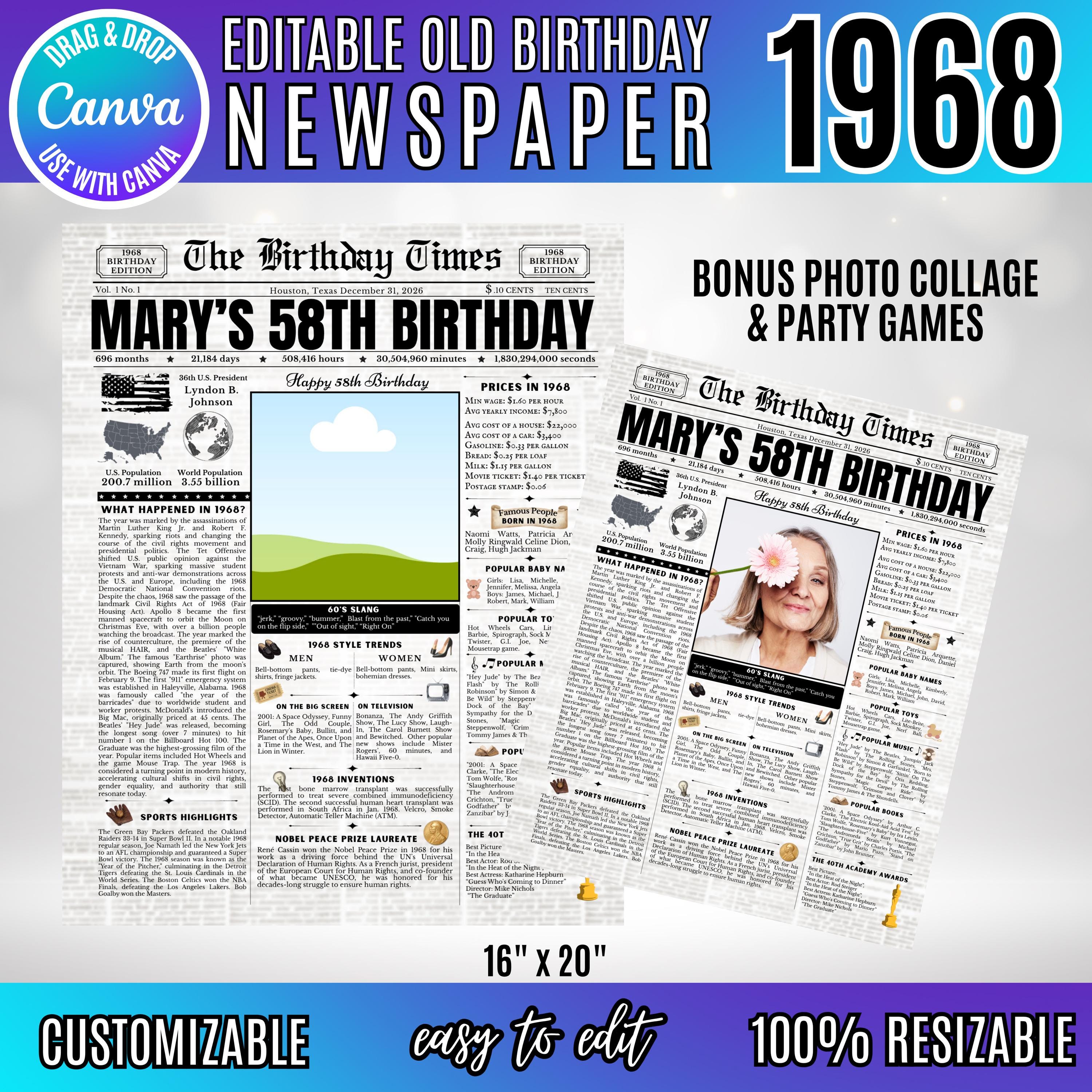 Editable Birthday Newspaper Template Canva | Custom Birth Year Facts Poster | Vintage Newspaper Birthday Sign | Photo Insert Party Decor Printable, 1968 Birthday Card, 58th Birthday