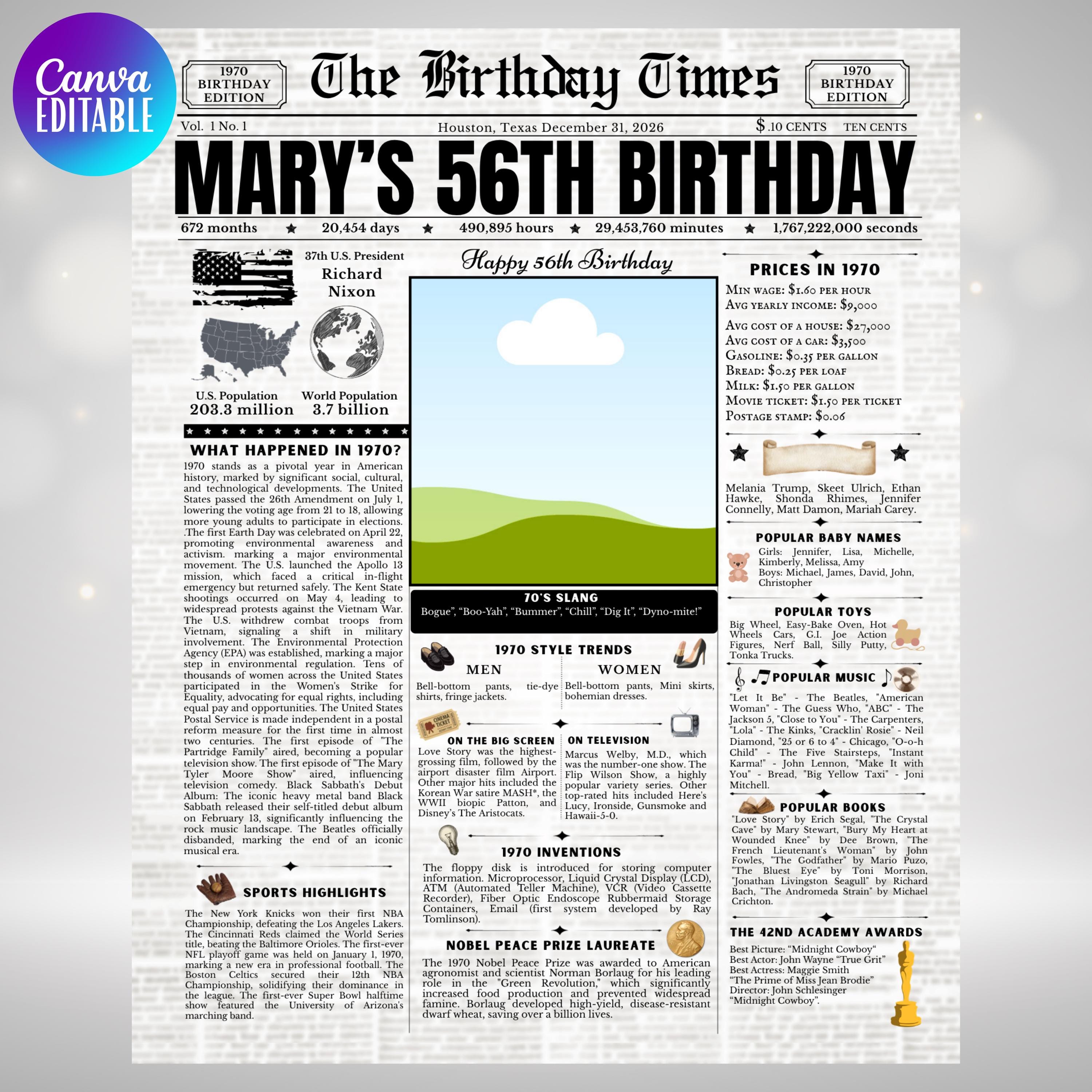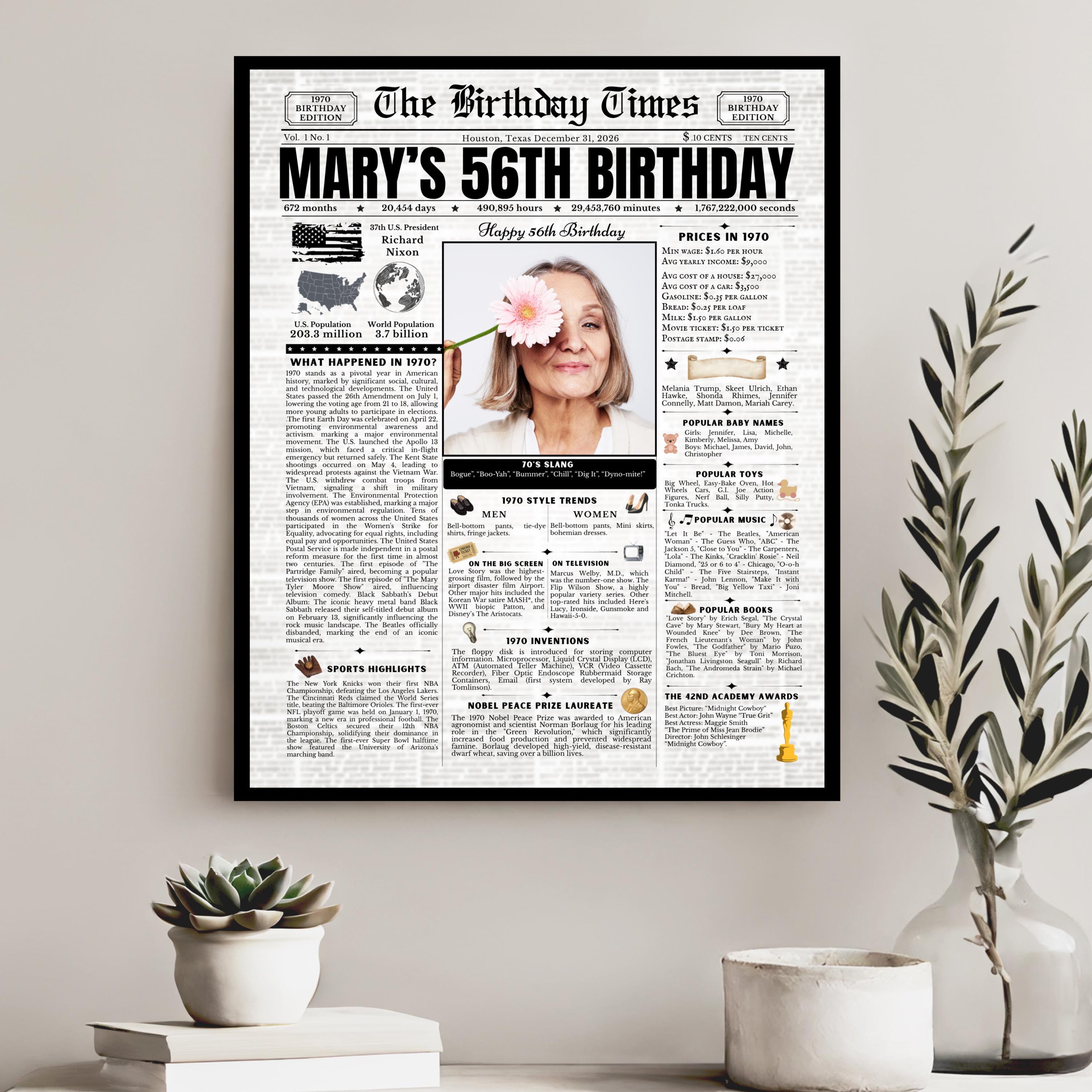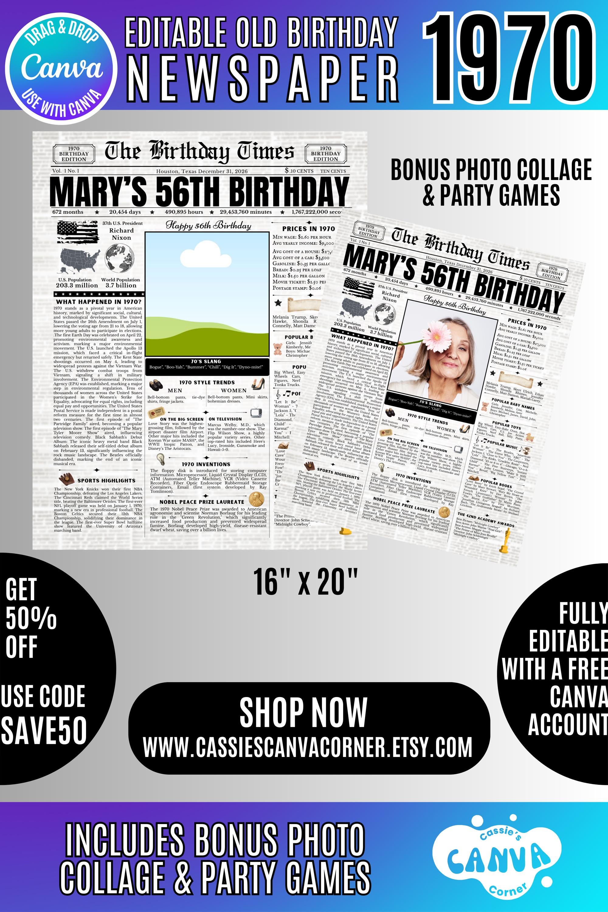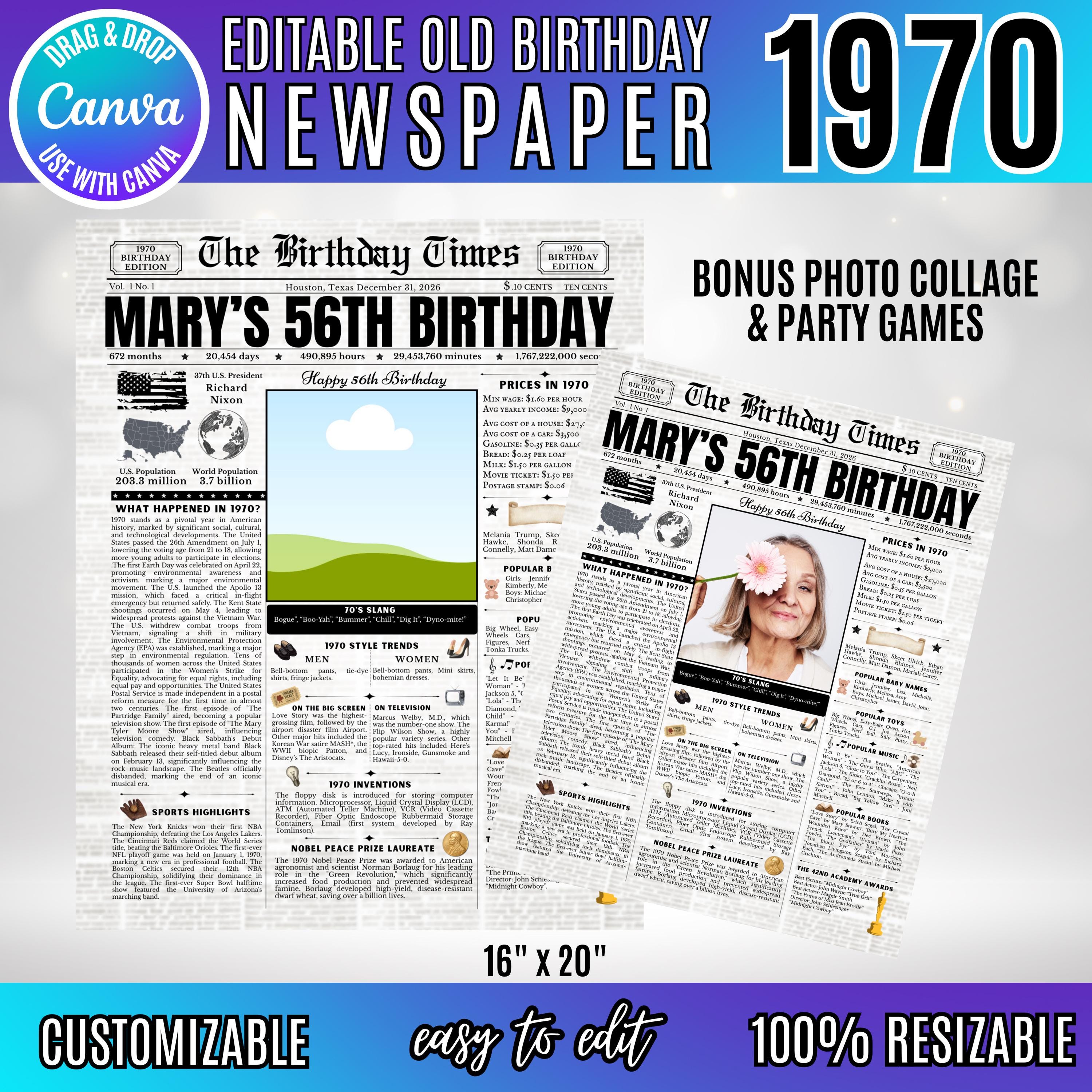 Editable Birthday Newspaper Template Canva | Custom Birth Year Facts Poster | Vintage Newspaper Birthday Sign | Photo Insert Party Decor Printable, 1970 Birthday Card, 56th Birthday