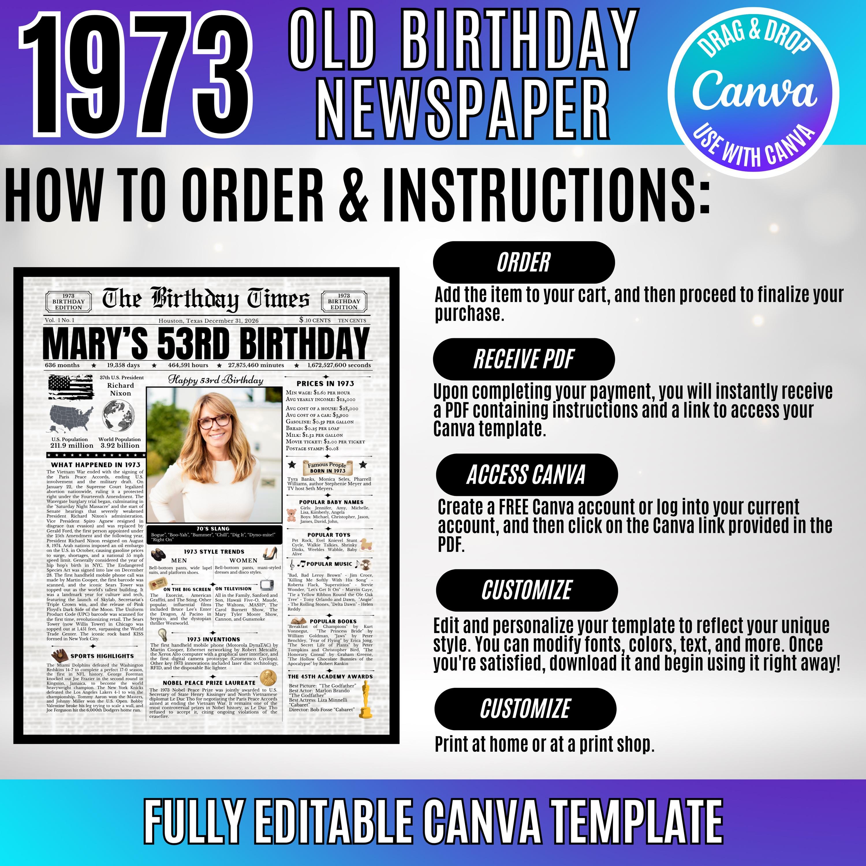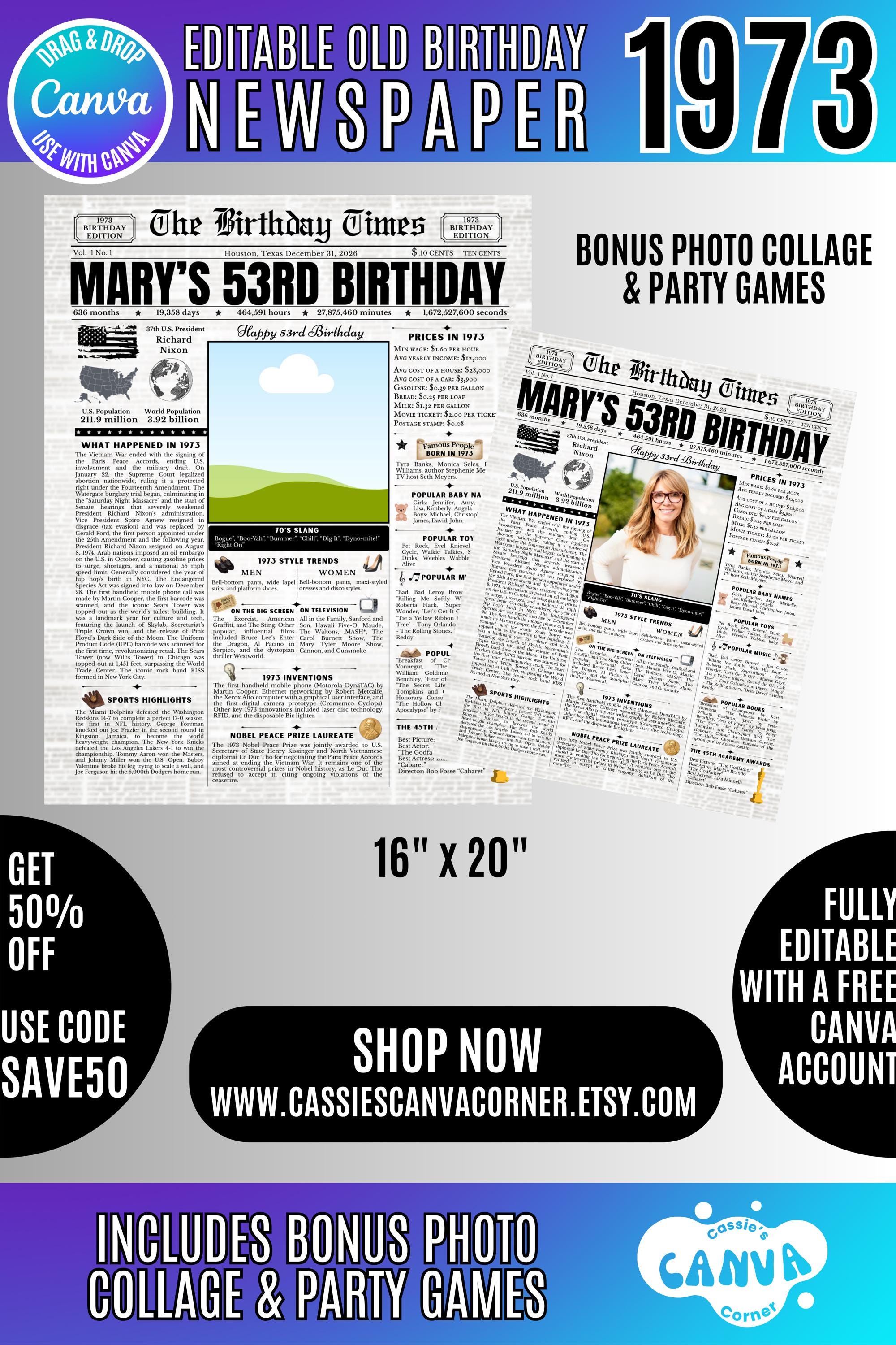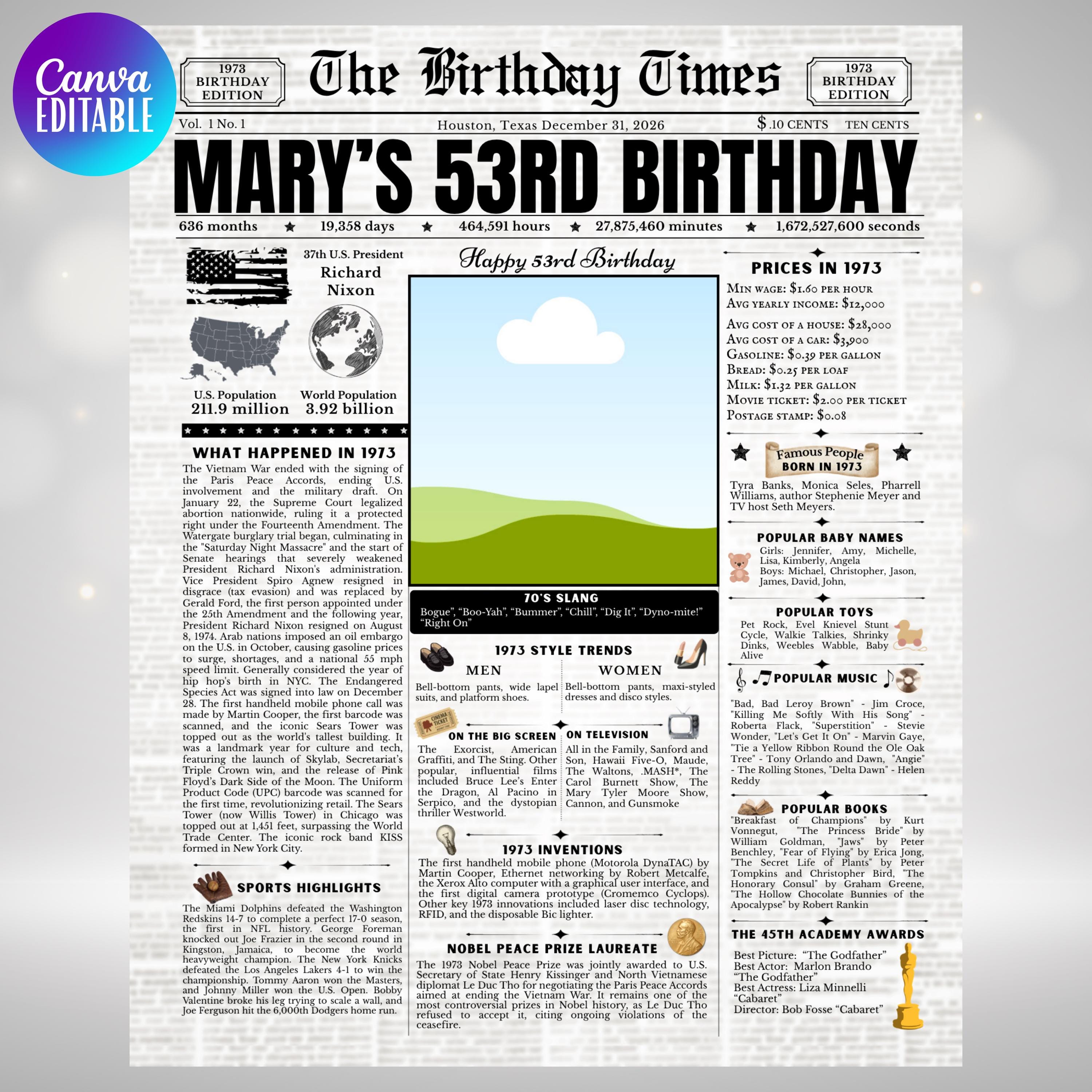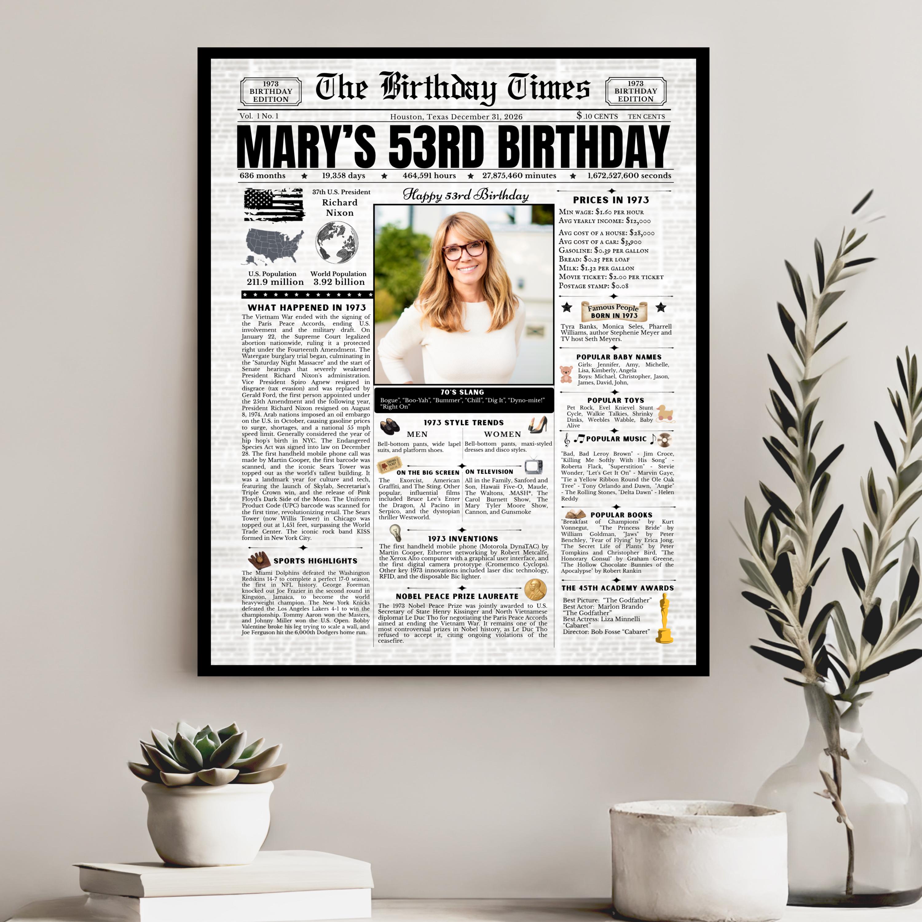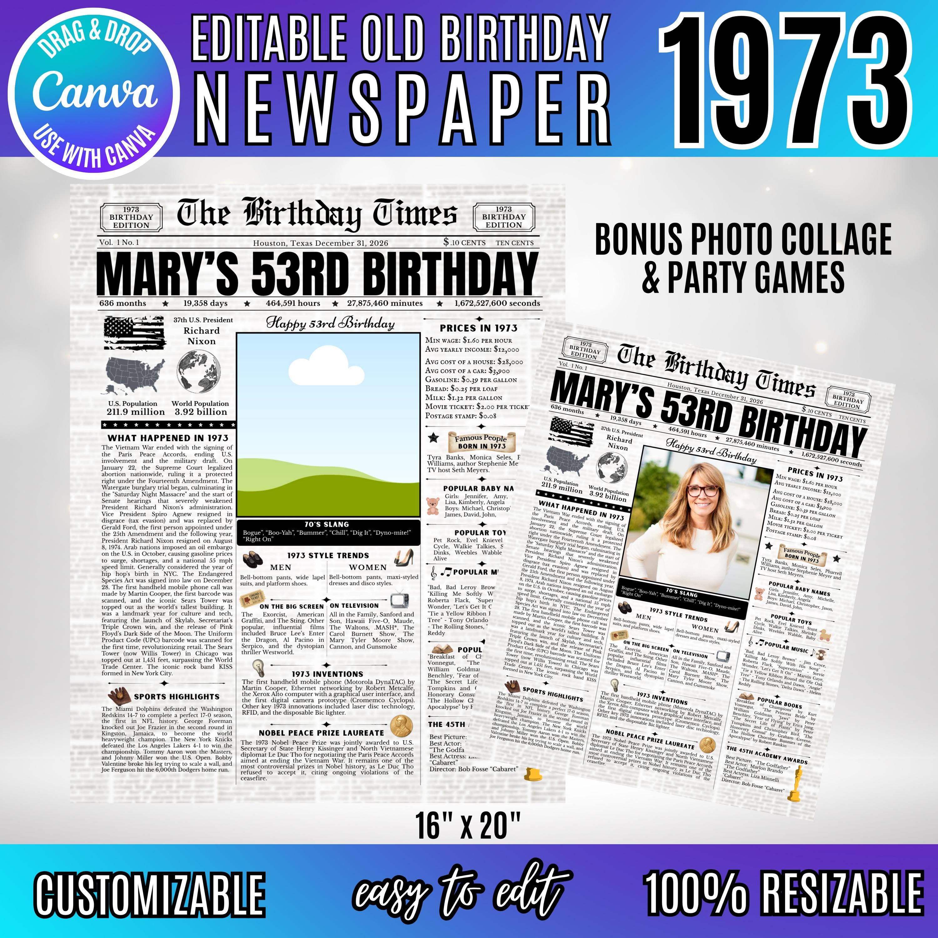 Editable Birthday Newspaper Template Canva | Custom Birth Year Facts Poster | Vintage Newspaper Birthday Sign | Photo Insert Party Decor Printable, 1973 Birthday Card, 53rd Birthday