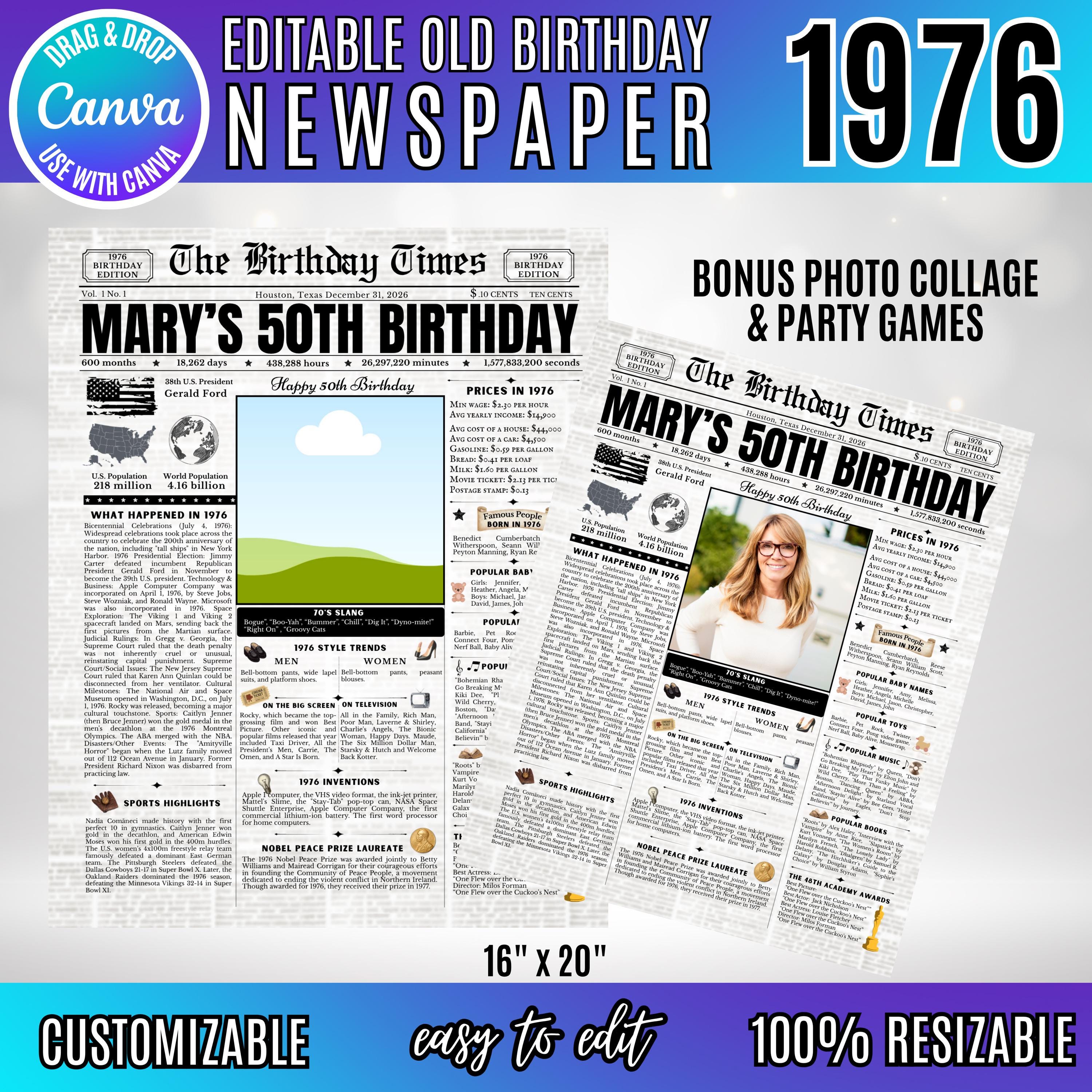 Editable Birthday Newspaper Template Canva | Custom Birth Year Facts Poster | Vintage Newspaper Birthday Sign | Photo Insert Party Decor Printable, 1976 Birthday Card, 50th Birthday
