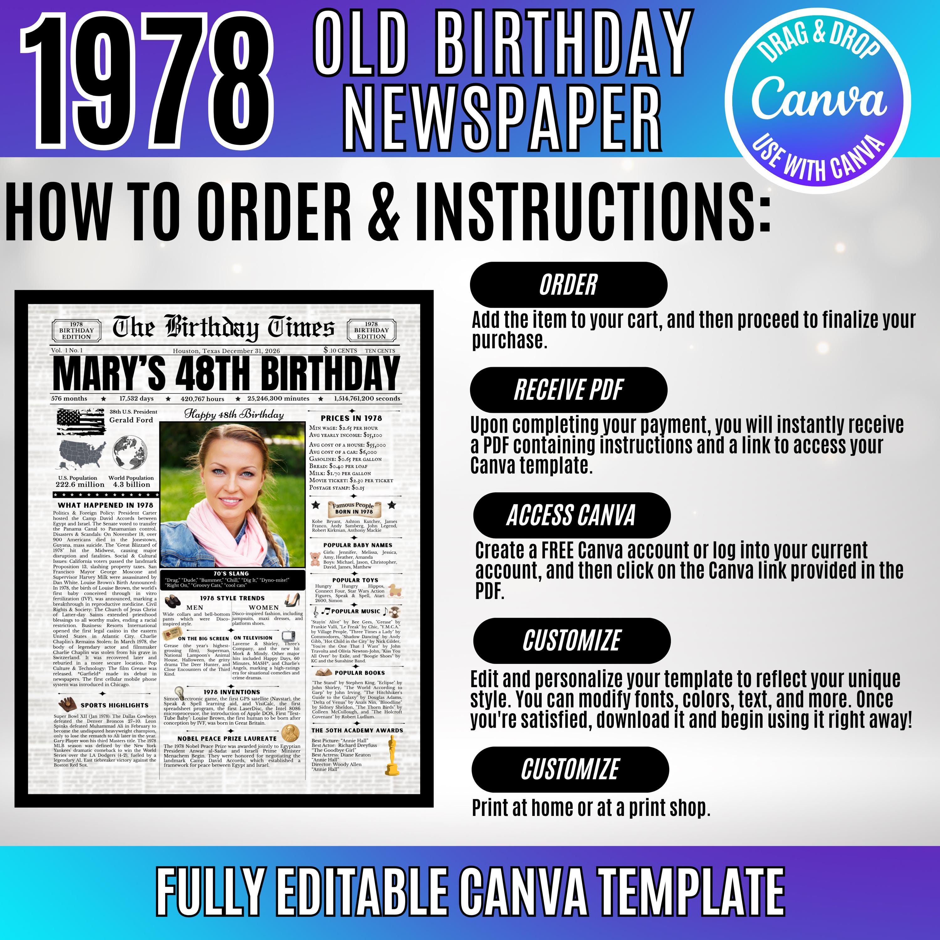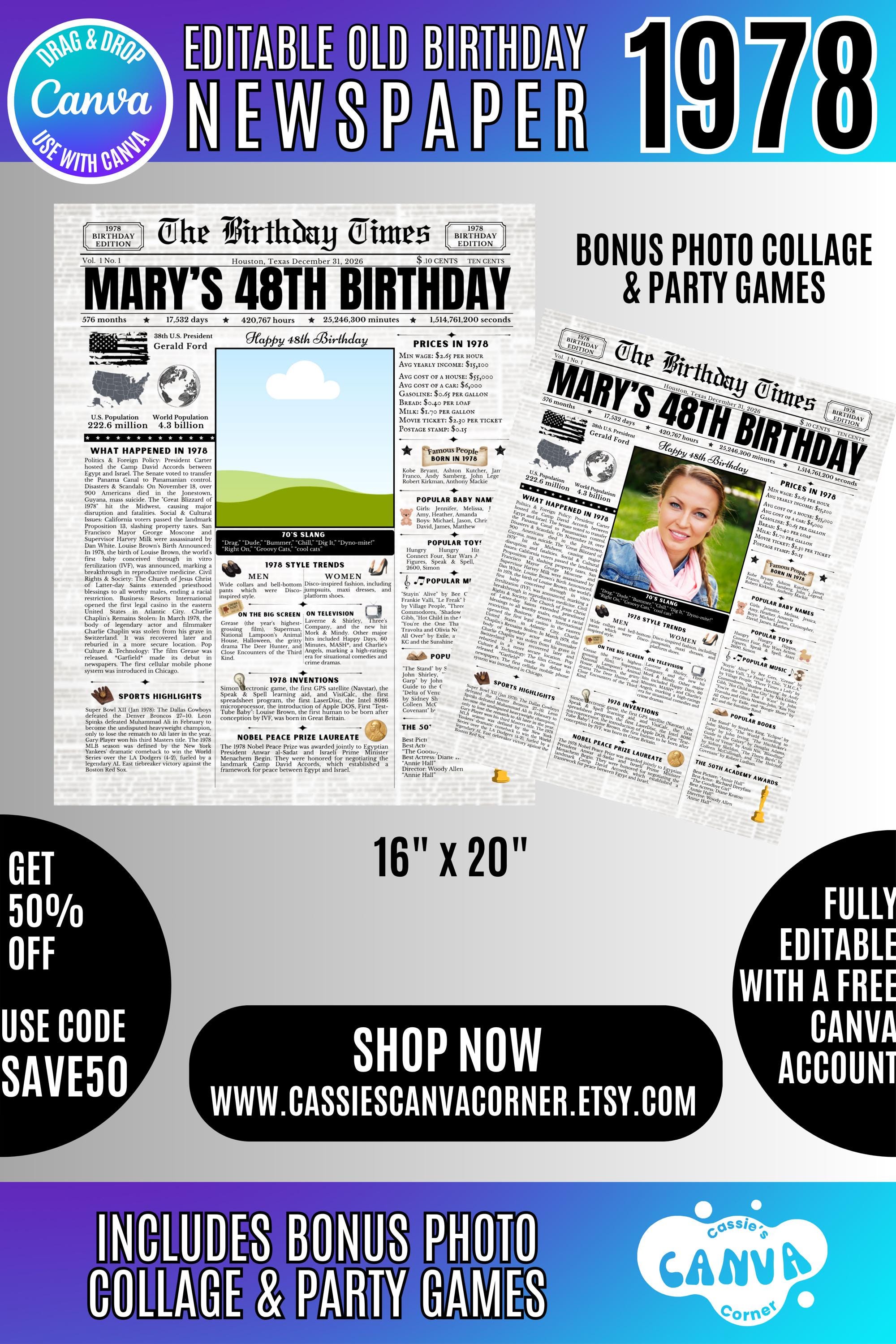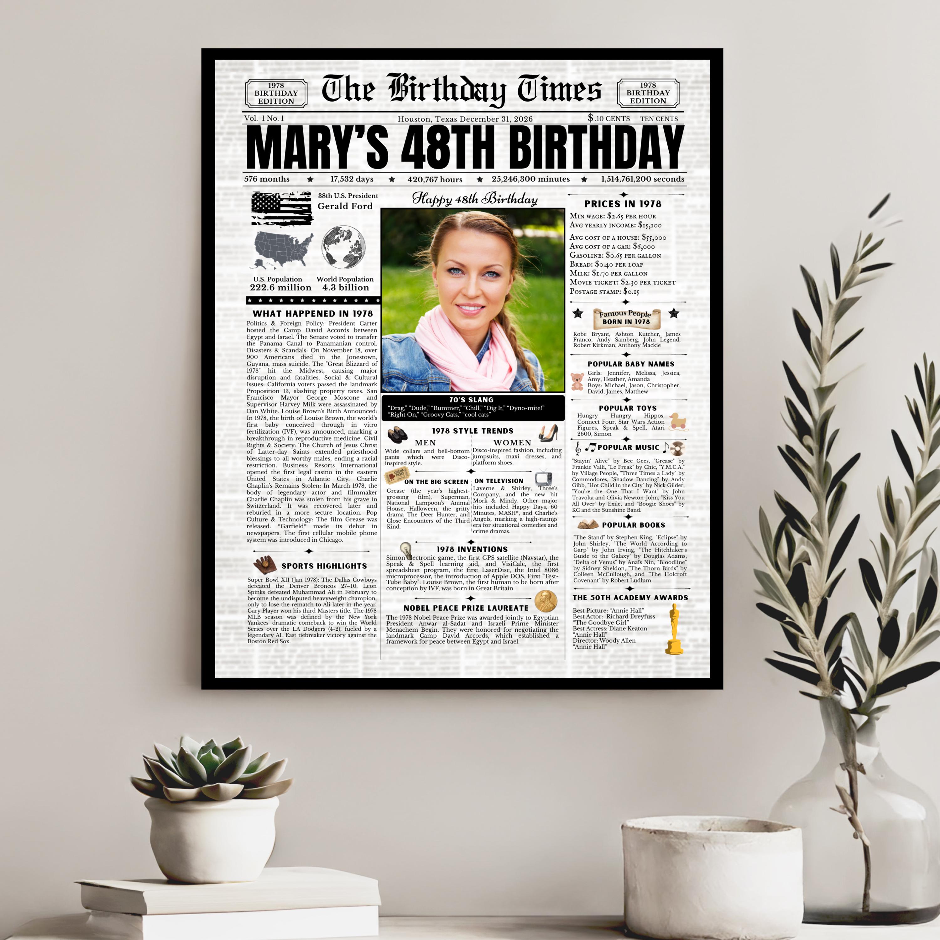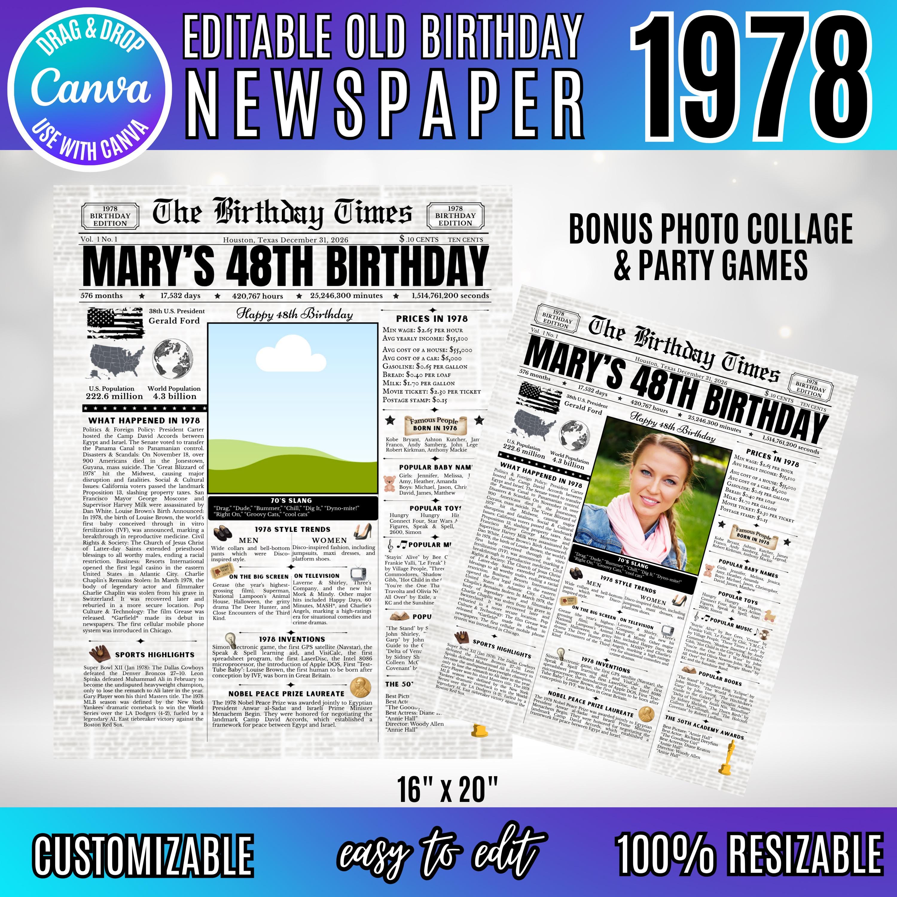 Editable Birthday Newspaper Template Canva | Custom Birth Year Facts Poster | Vintage Newspaper Birthday Sign | Photo Insert Party Decor Printable, 1978 Birthday Card, 48th Birthday