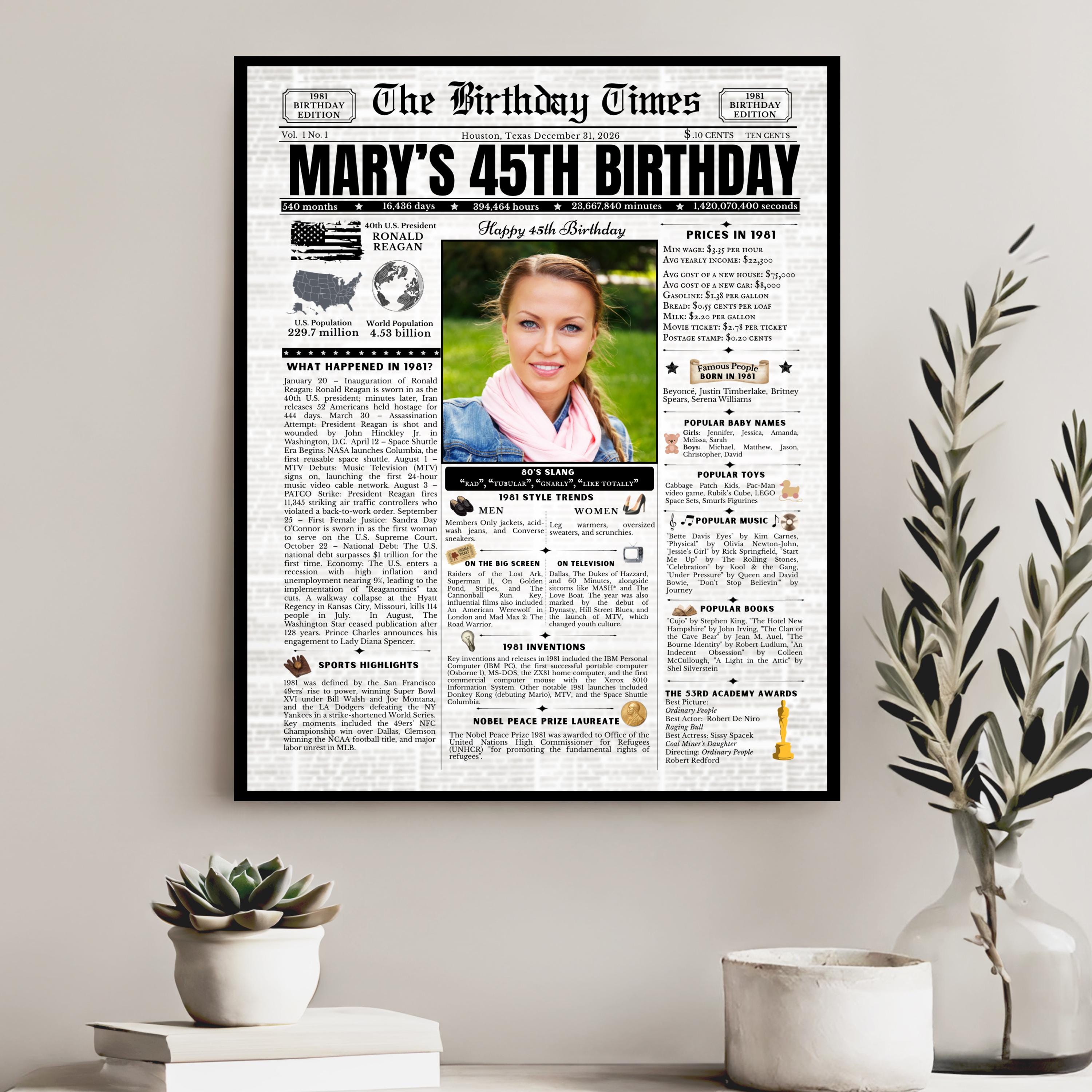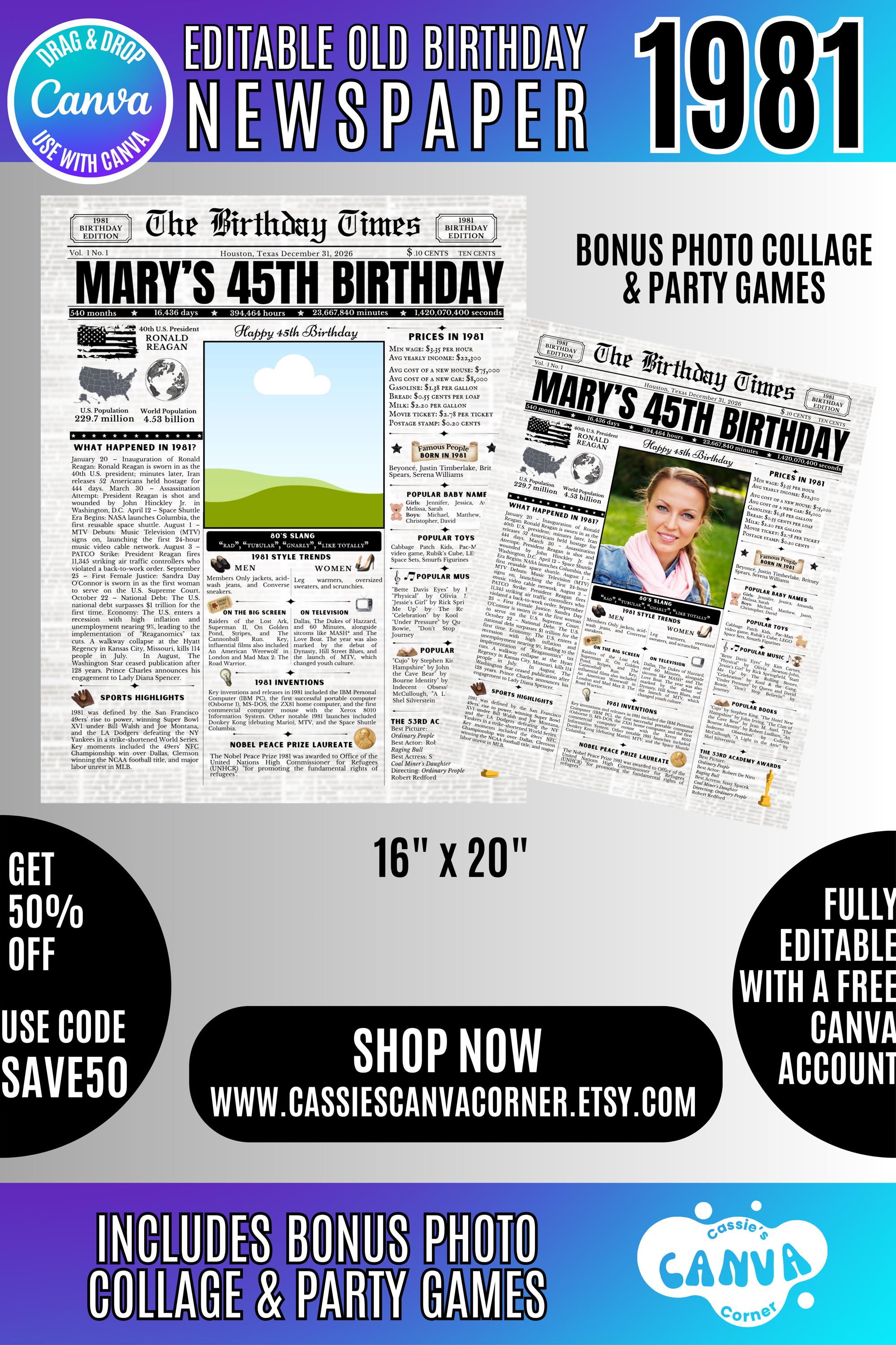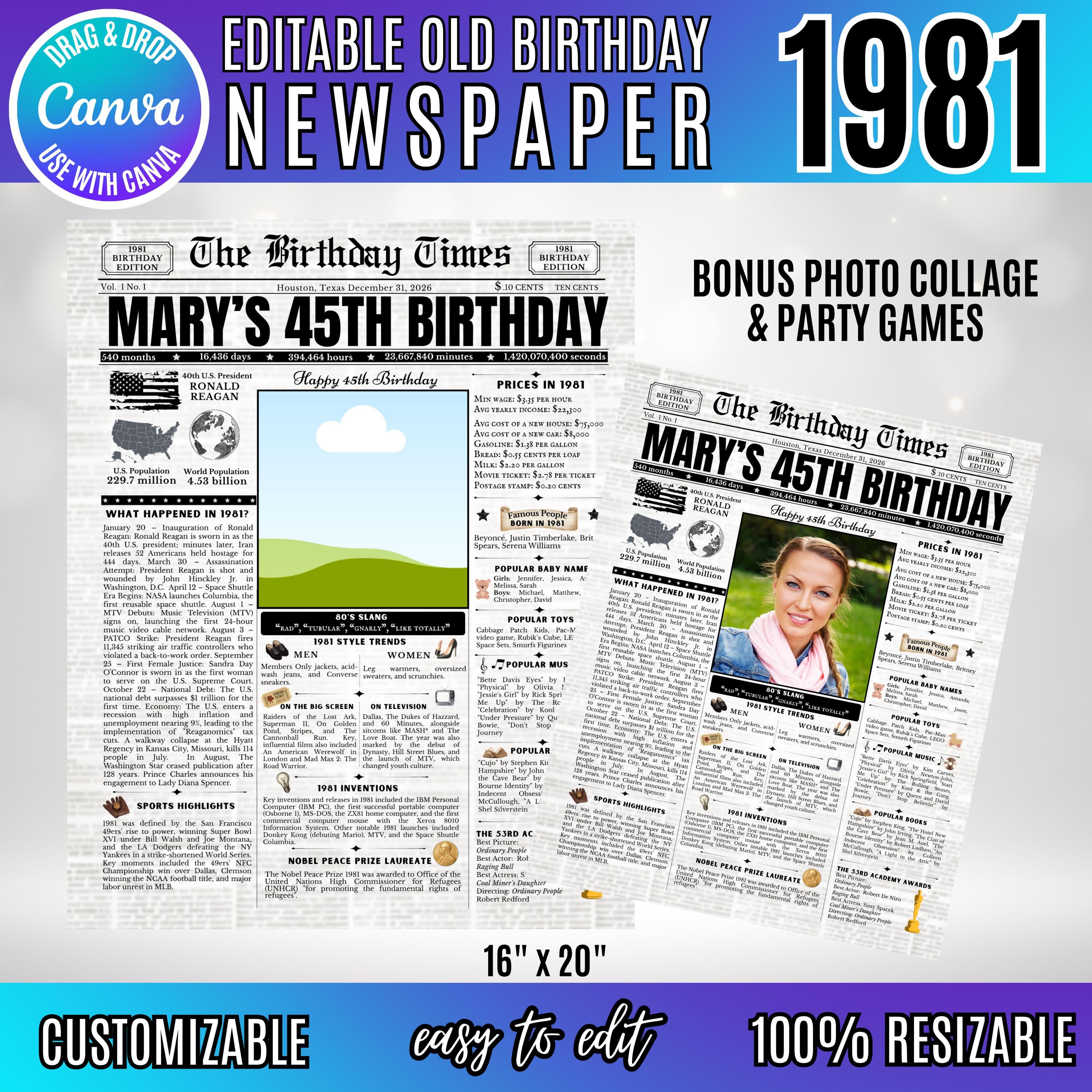 Editable Birthday Newspaper Template Canva | Custom Birth Year Facts Poster | Vintage Newspaper Birthday Sign | Photo Insert Party Decor Printable, 1981 Birthday Card, 45th Birthday