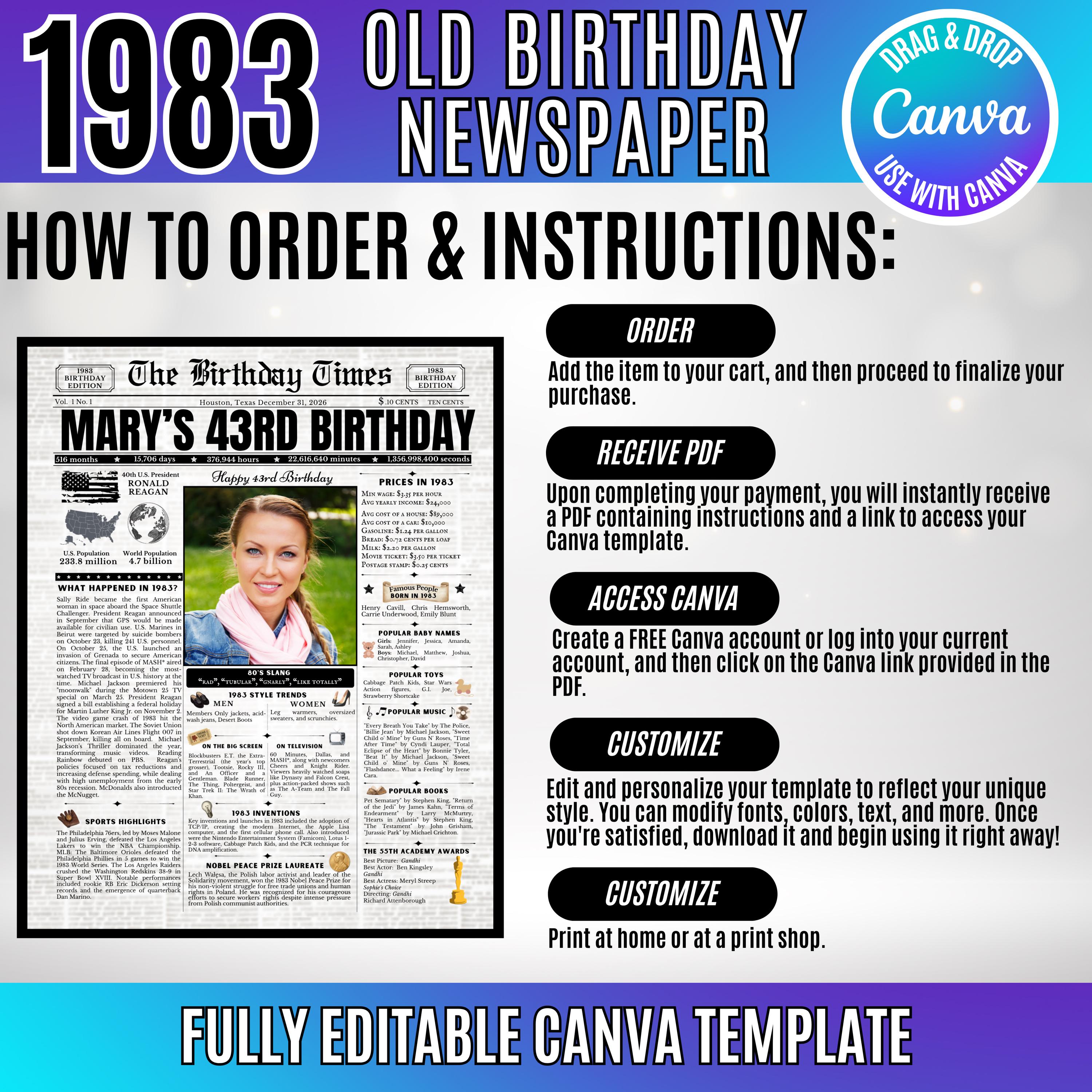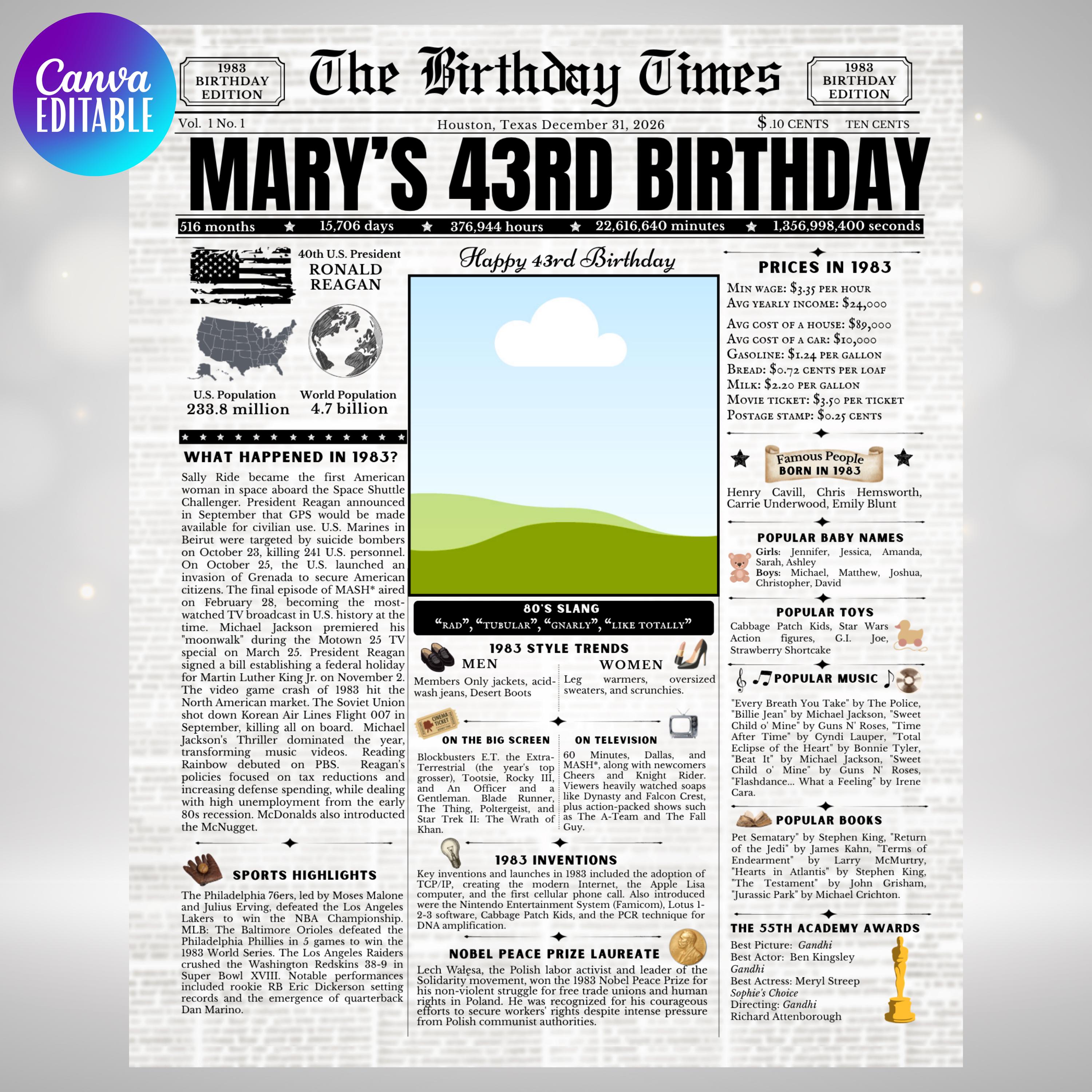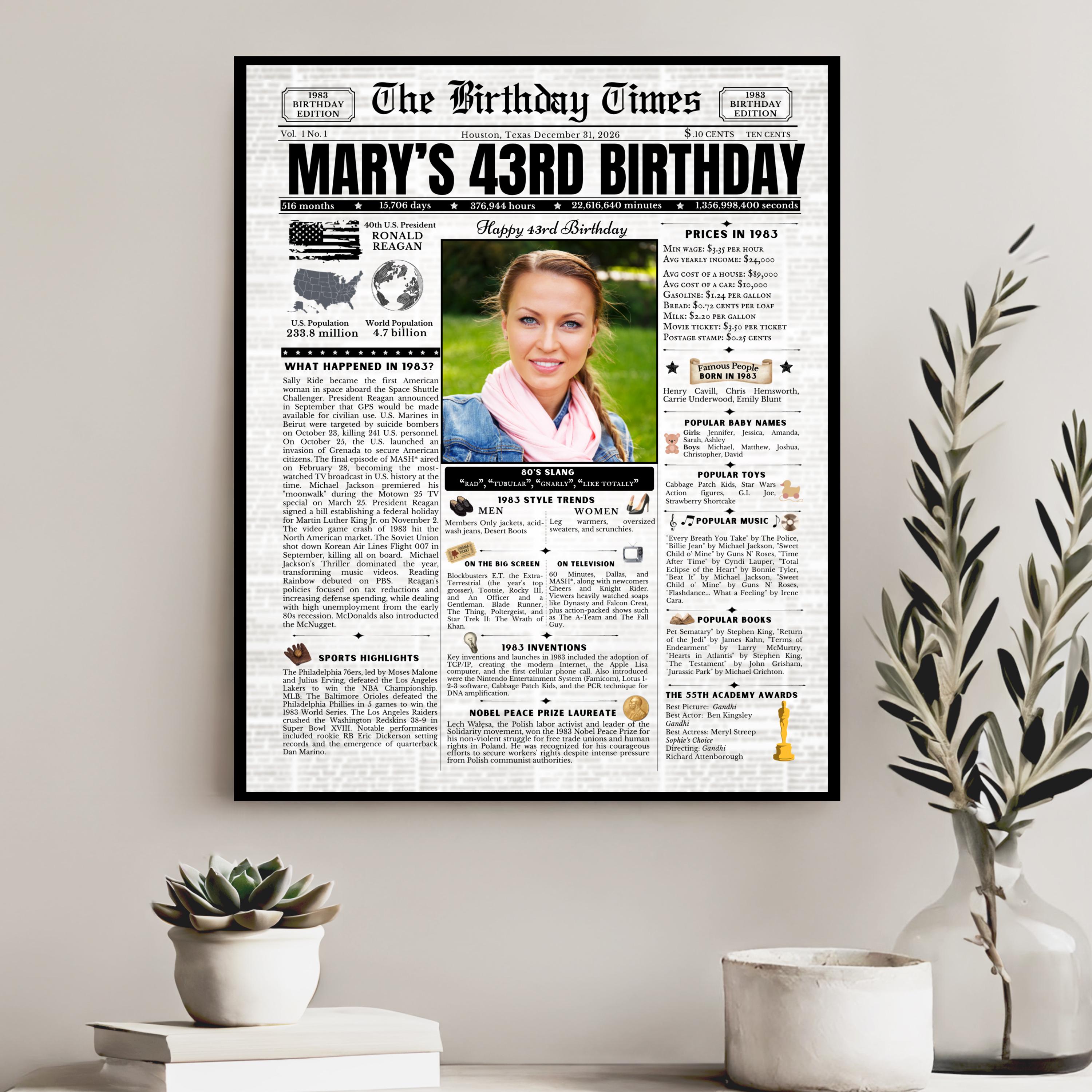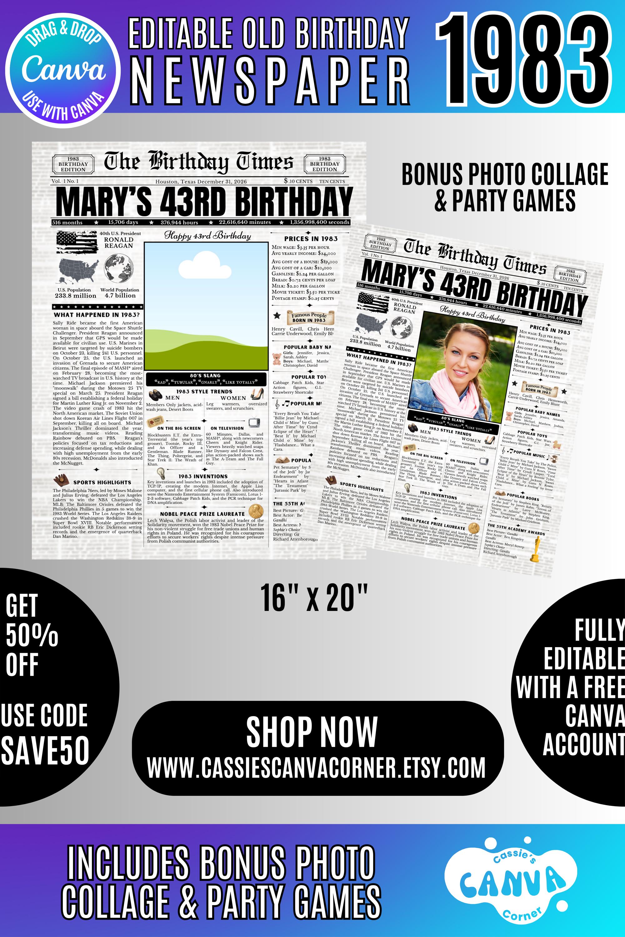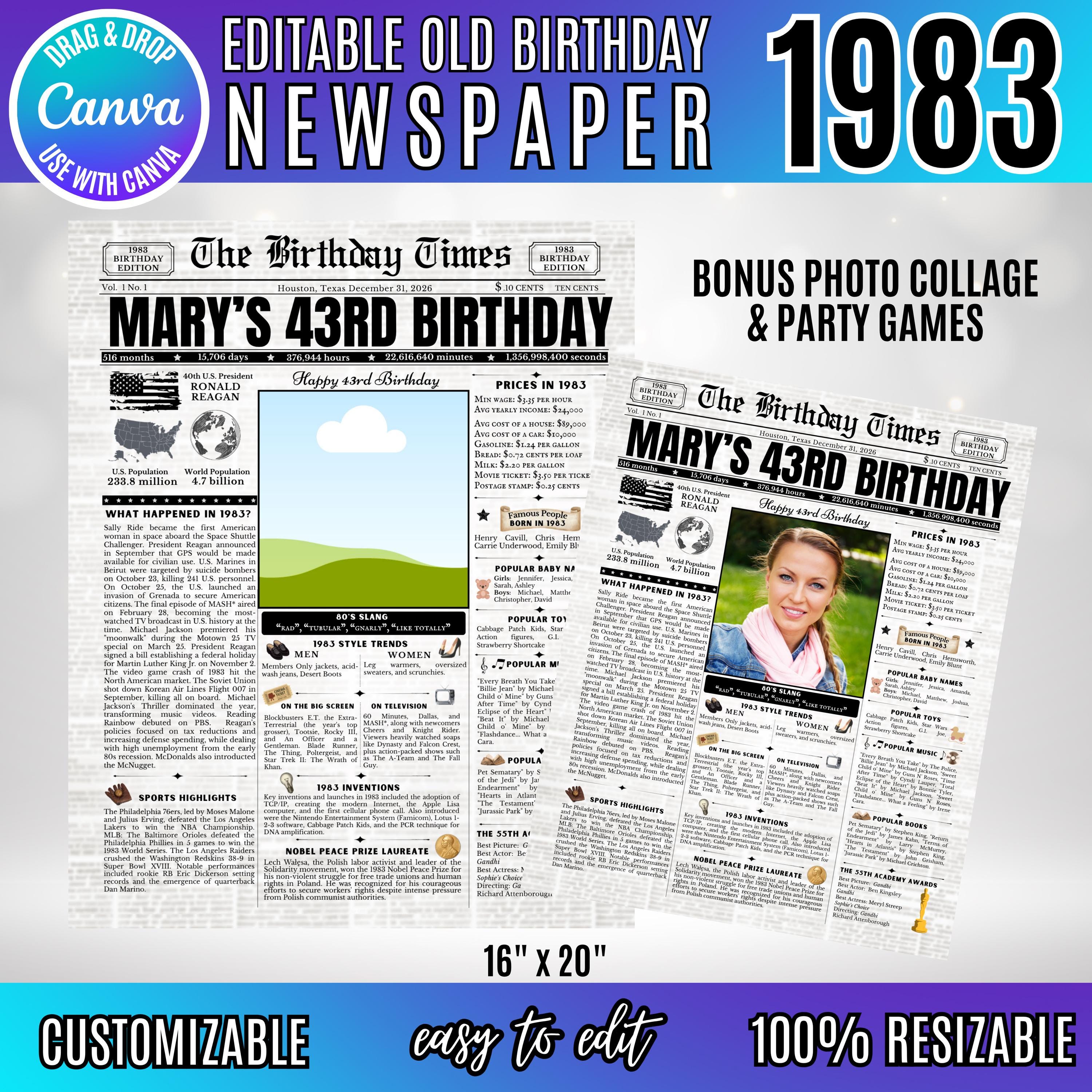 Editable Birthday Newspaper Template Canva | Custom Birth Year Facts Poster | Vintage Newspaper Birthday Sign | Photo Insert Party Decor Printable, 1983 Birthday Card, 43rd Birthday
