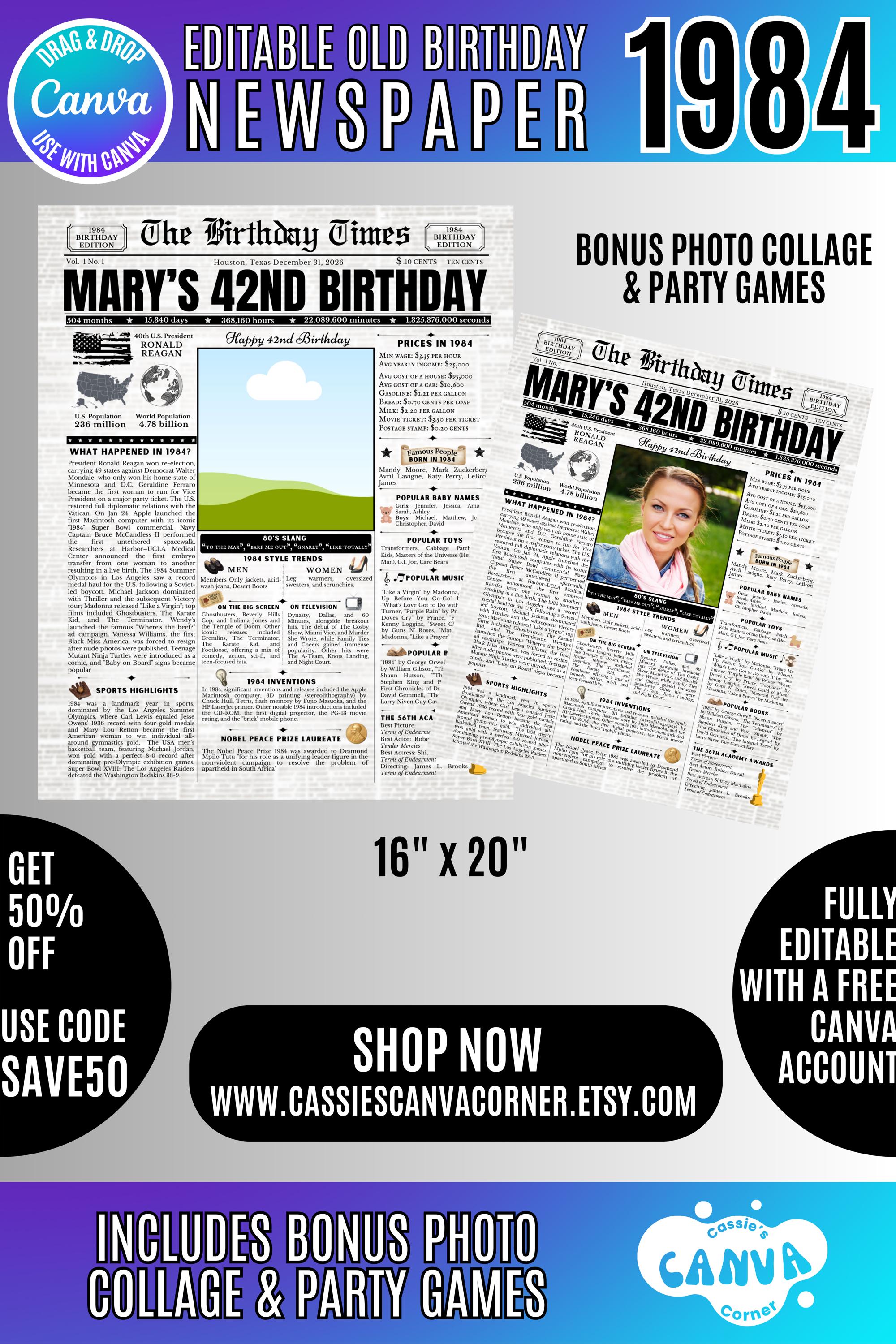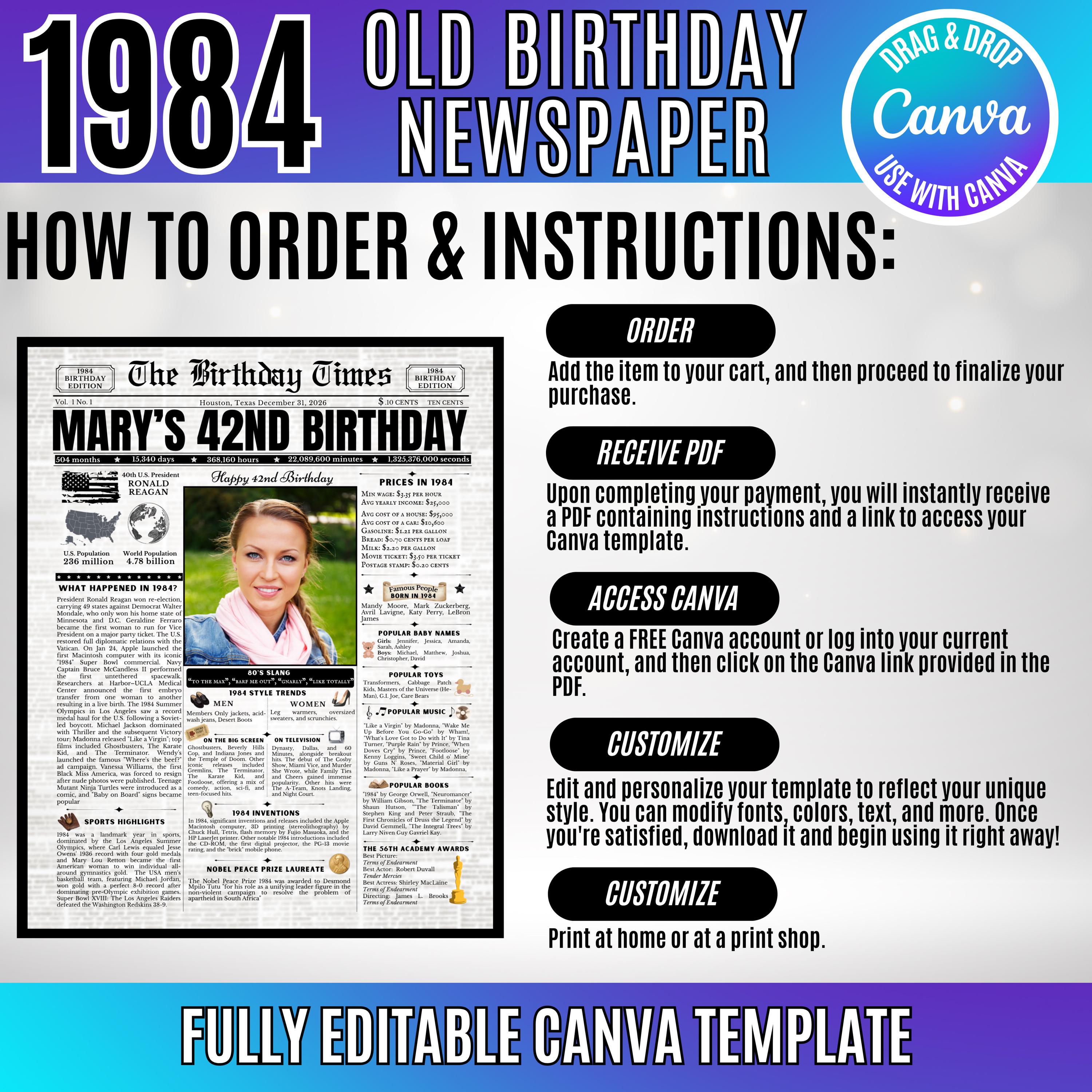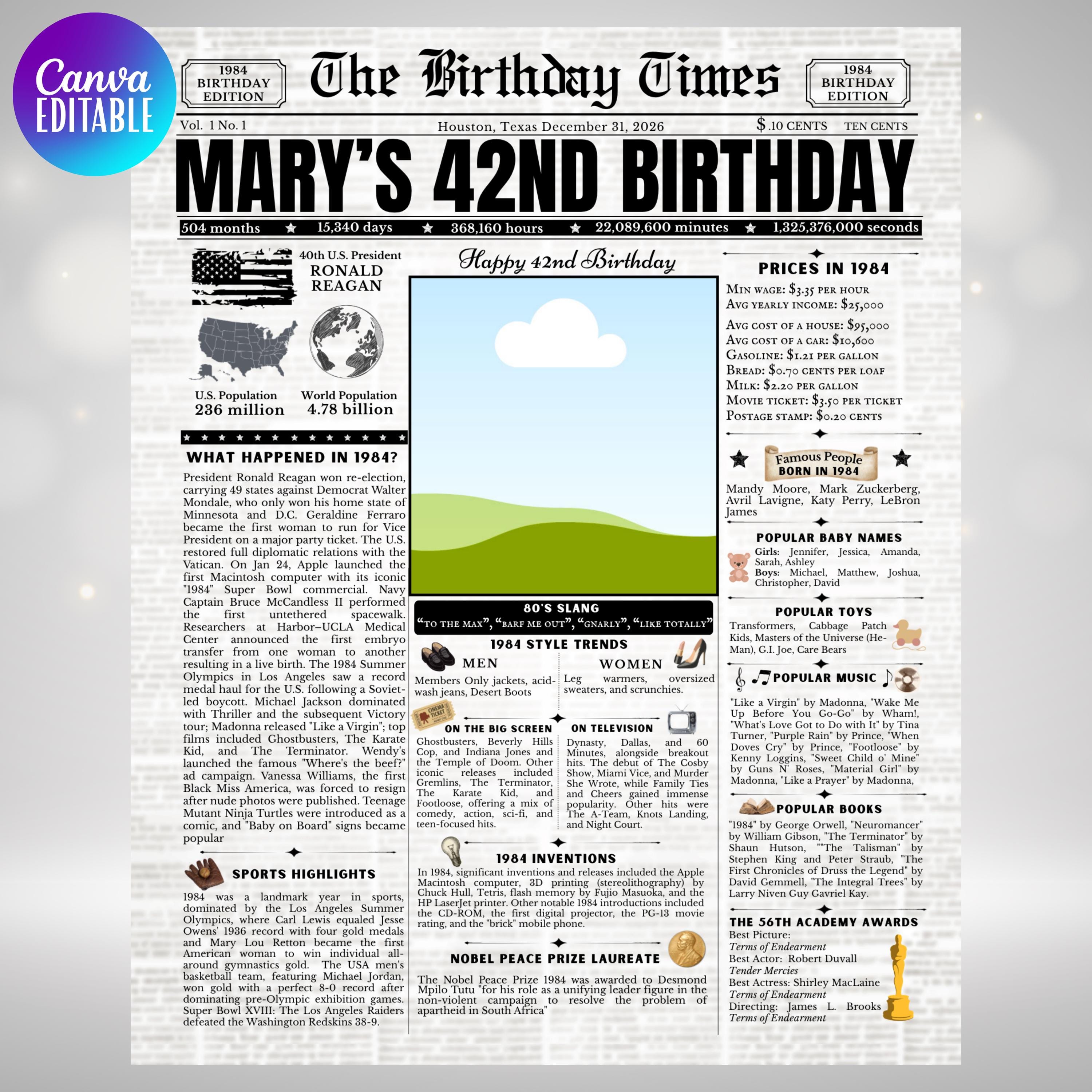 Editable Birthday Newspaper Template Canva | Custom Birth Year Facts Poster | Vintage Newspaper Birthday Sign | Photo Insert Party Decor Printable, 1984 Birthday Card, 42nd Birthday