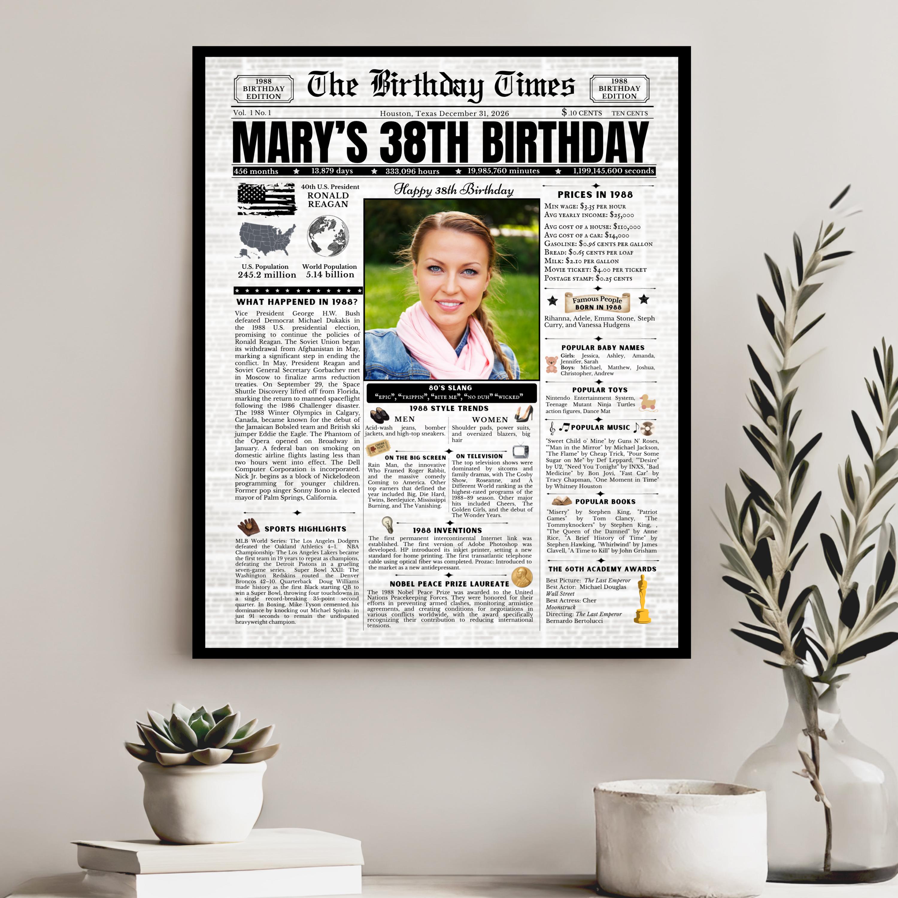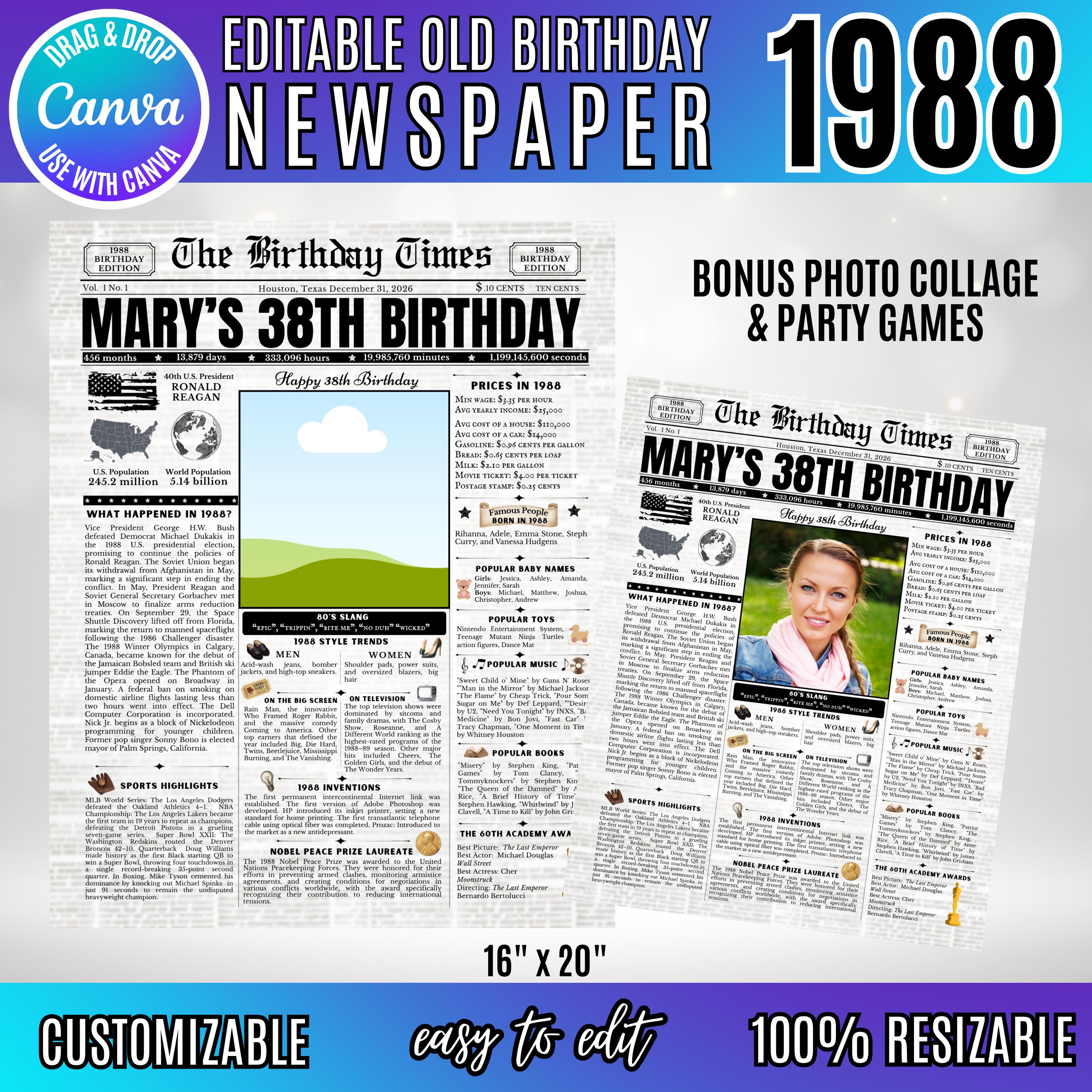 Editable Birthday Newspaper Template Canva | Custom Birth Year Facts Poster | Vintage Newspaper Birthday Sign | Photo Insert Party Decor Printable, 1988 Birthday Card, 38th Birthday