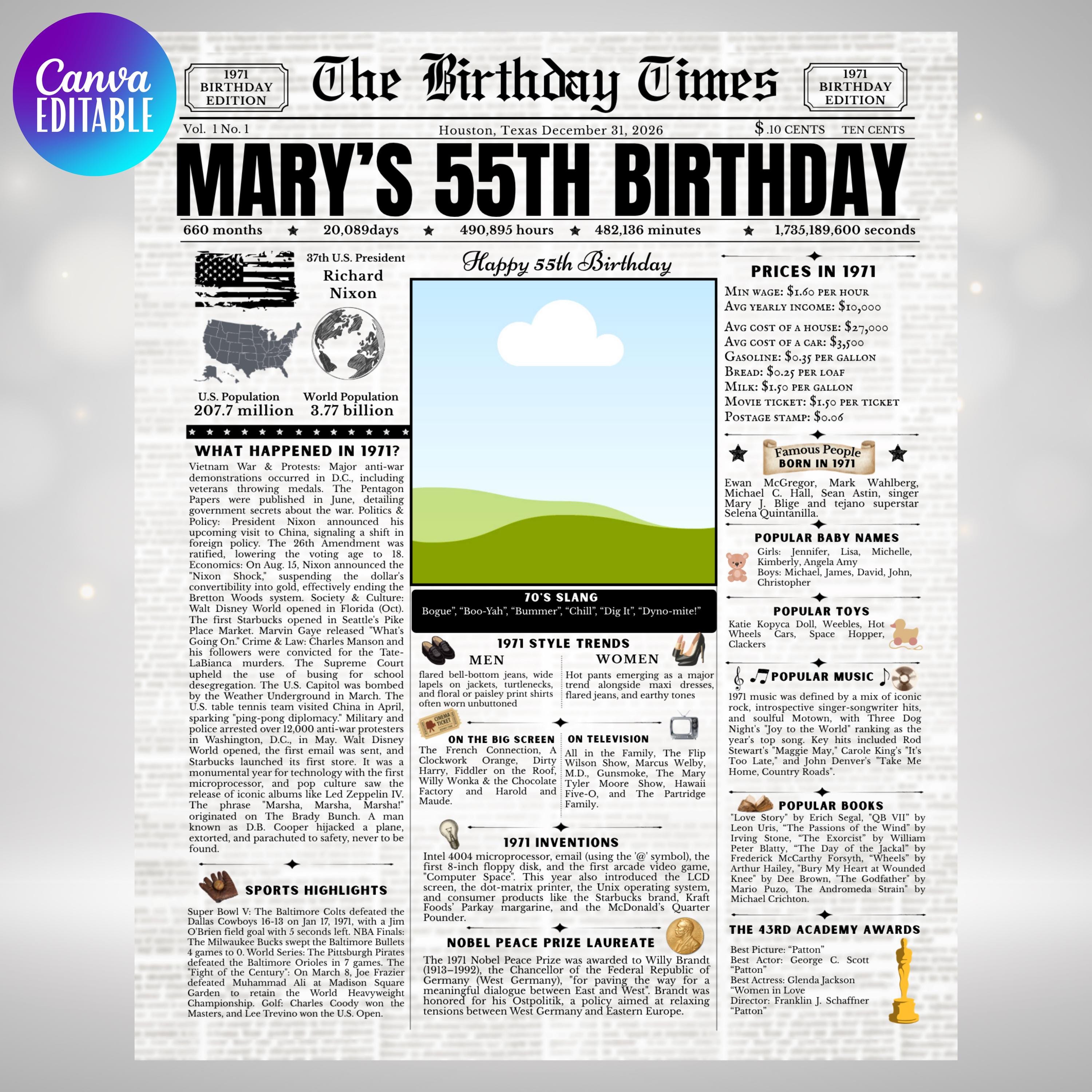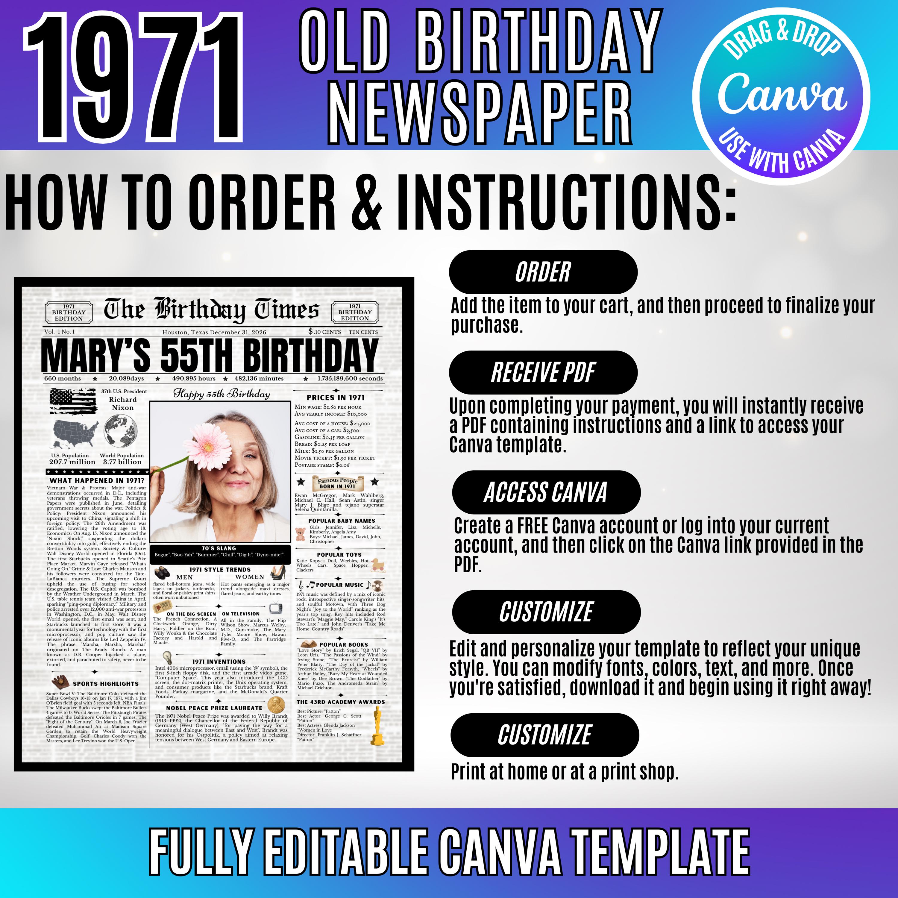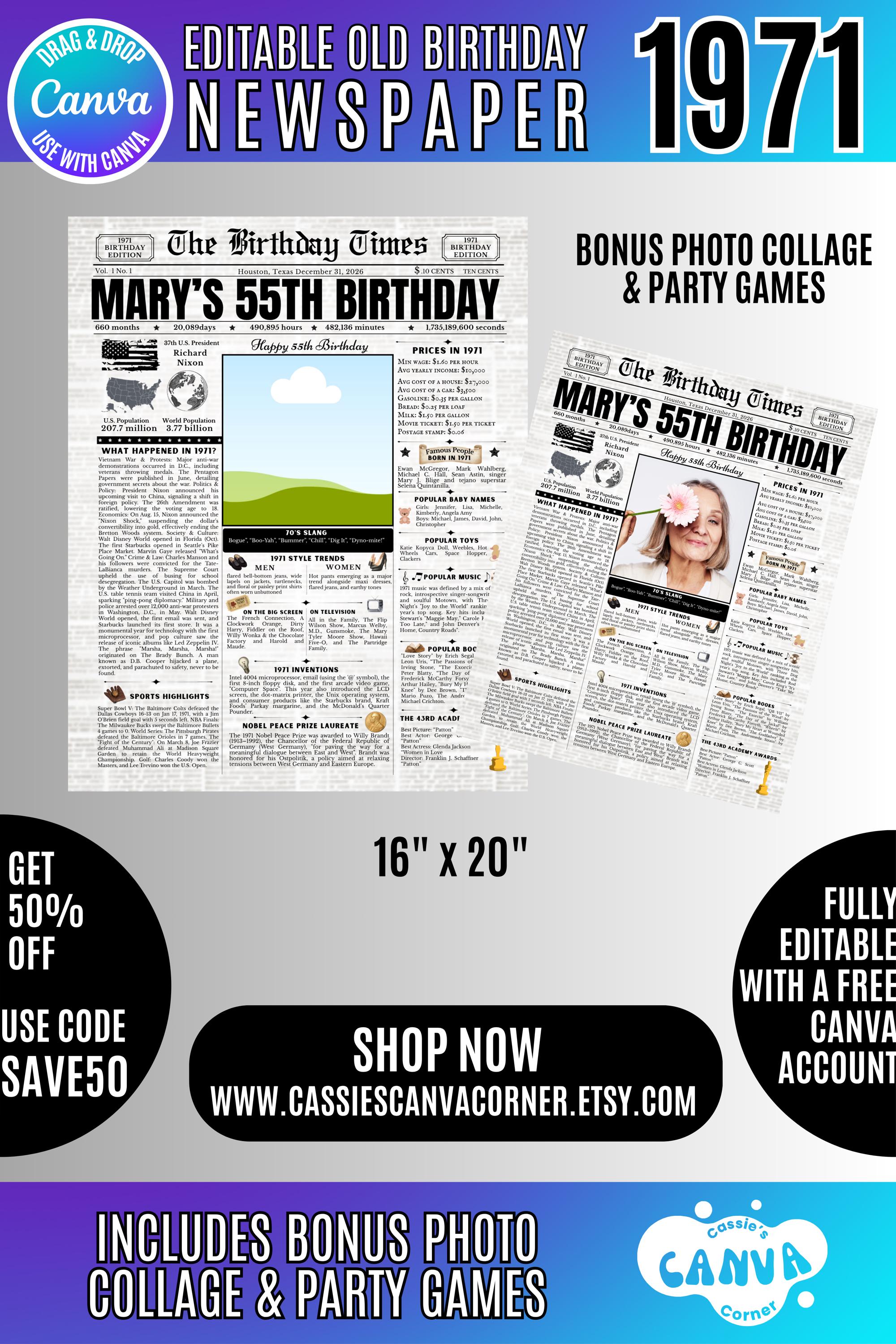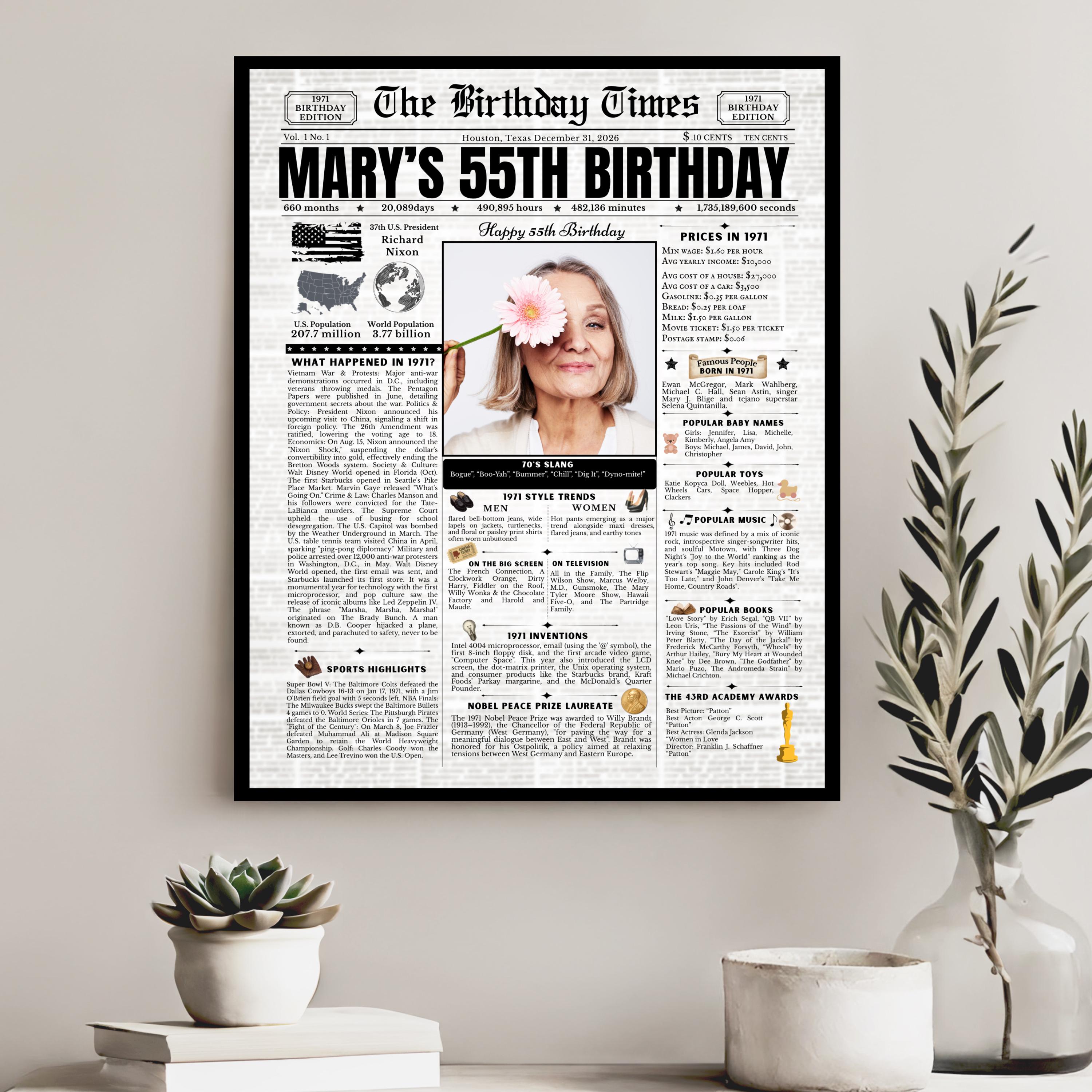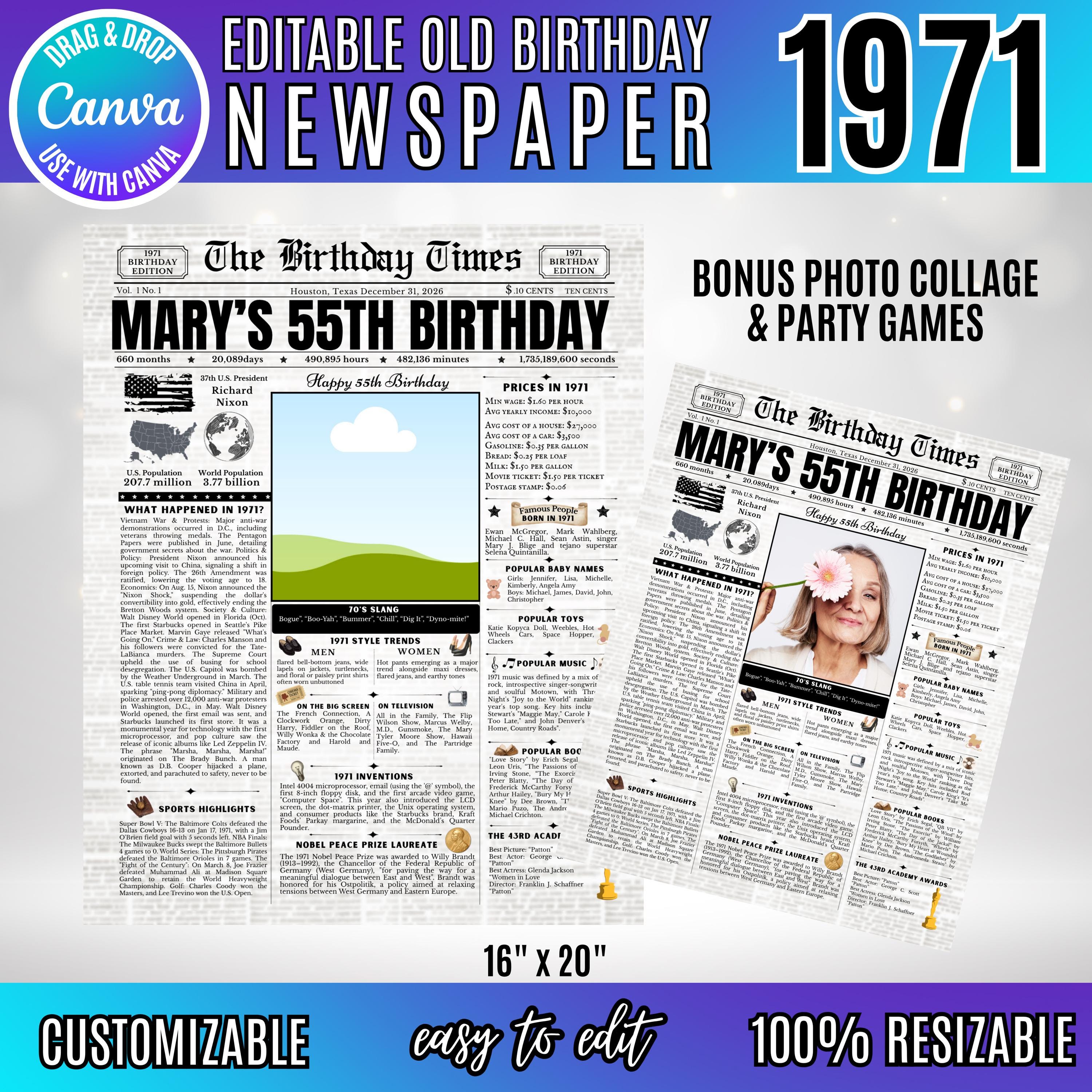 Editable Birthday Newspaper Template Canva | Custom Birth Year Facts Poster | Vintage Newspaper Birthday Sign | Photo Insert Party Decor Printable, 1971 Birthday Card, 55th Birthday