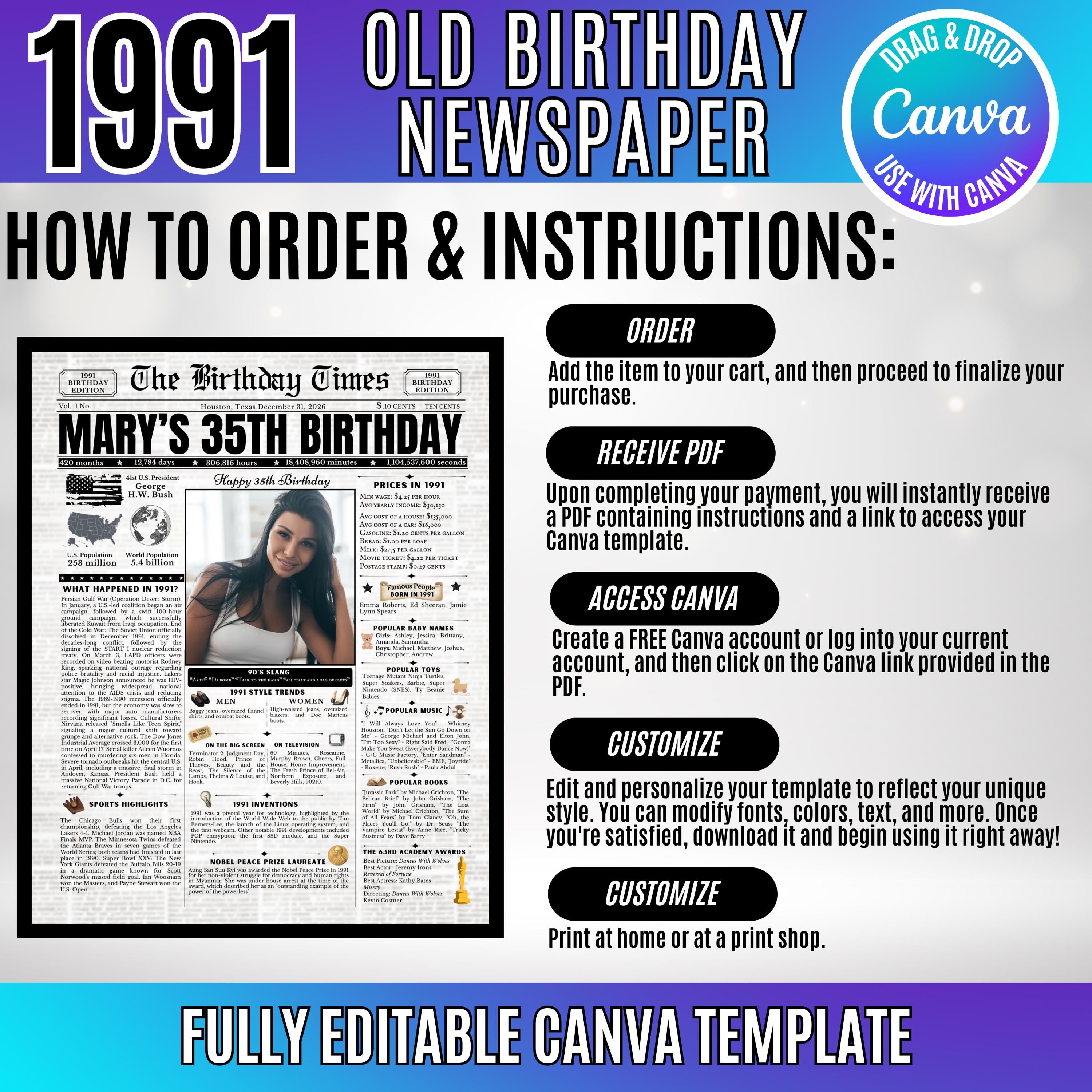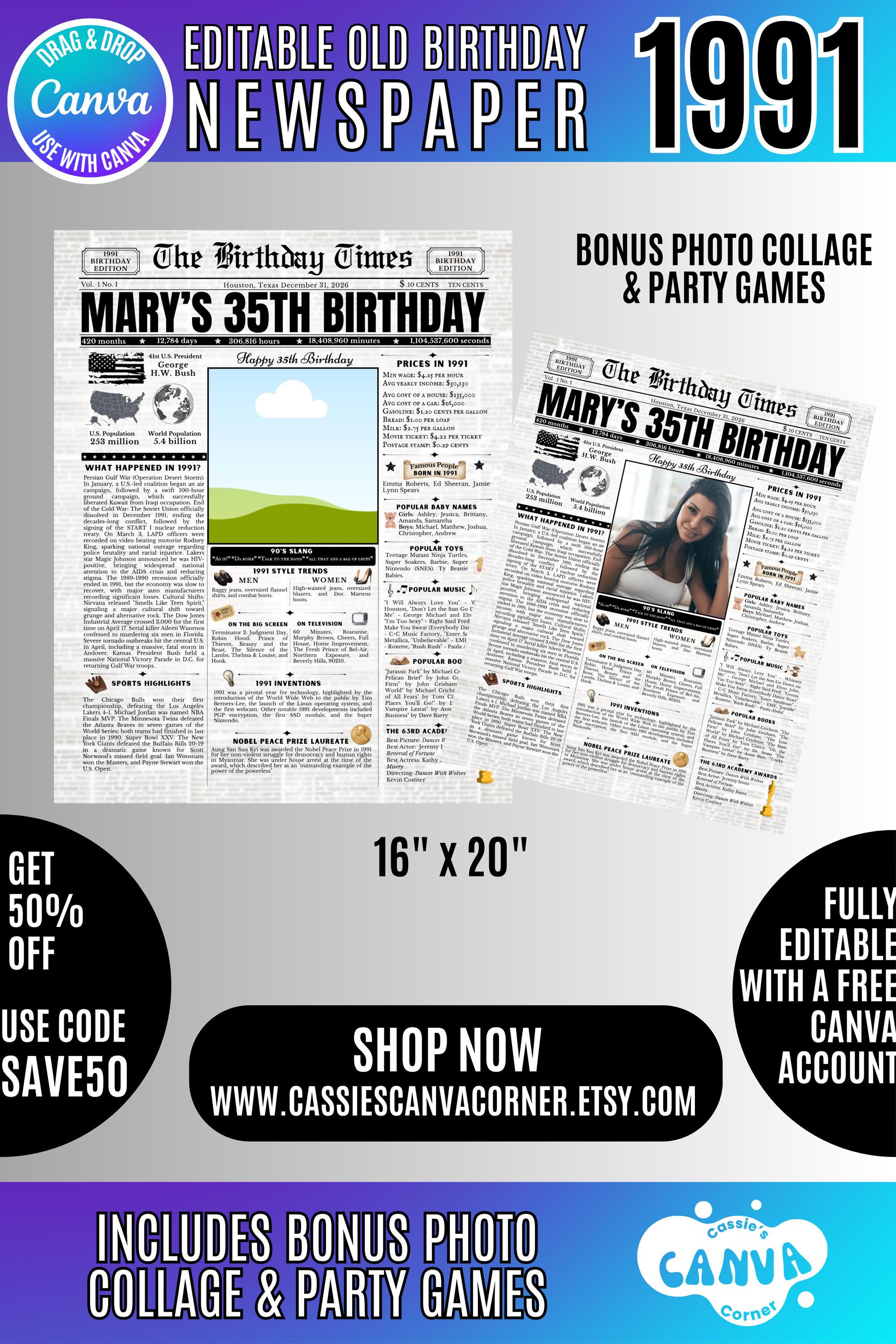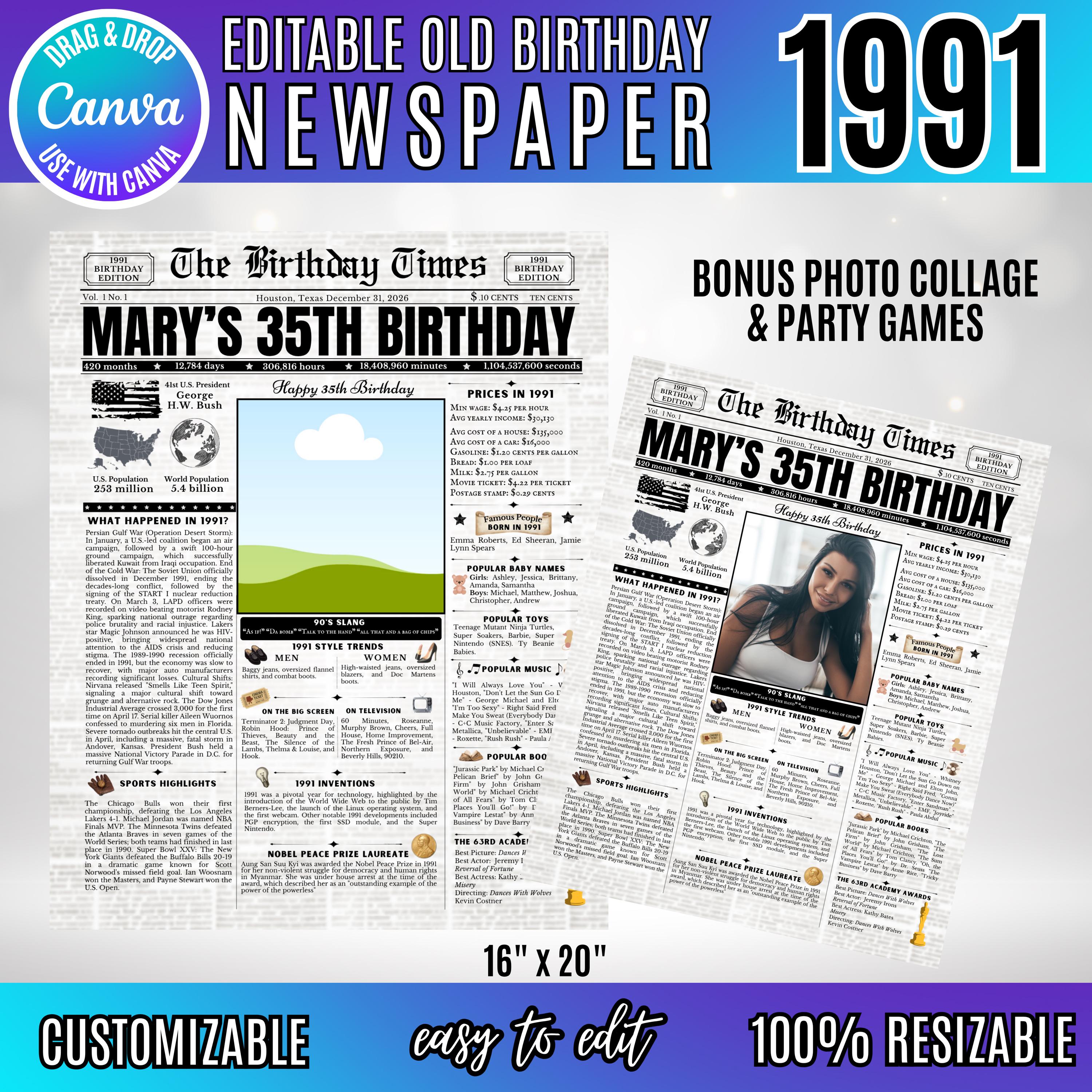 Editable Birthday Newspaper Template Canva | Custom Birth Year Facts Poster | Vintage Newspaper Birthday Sign | Photo Insert Party Decor Printable, 1991 Birthday Card, 35th Birthday