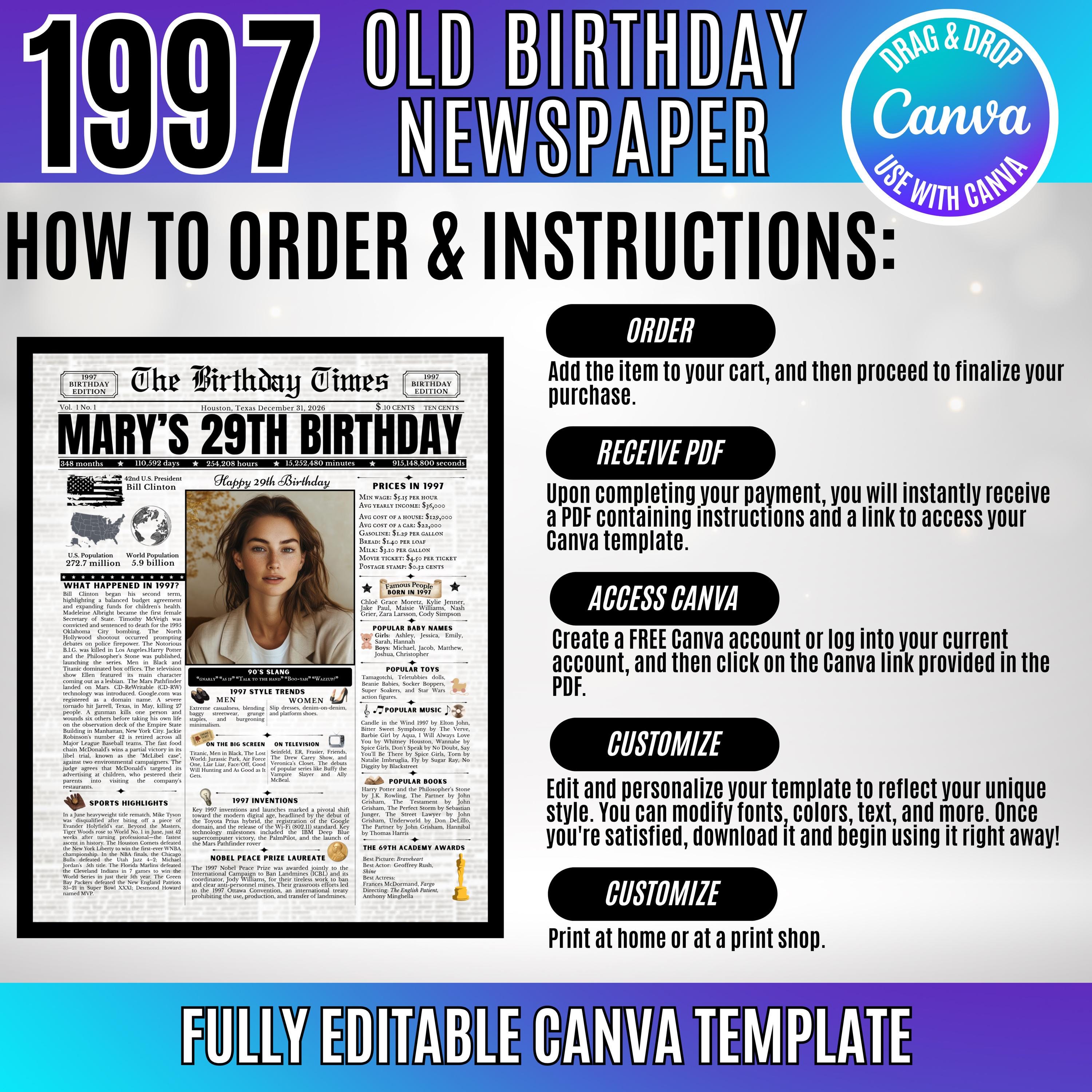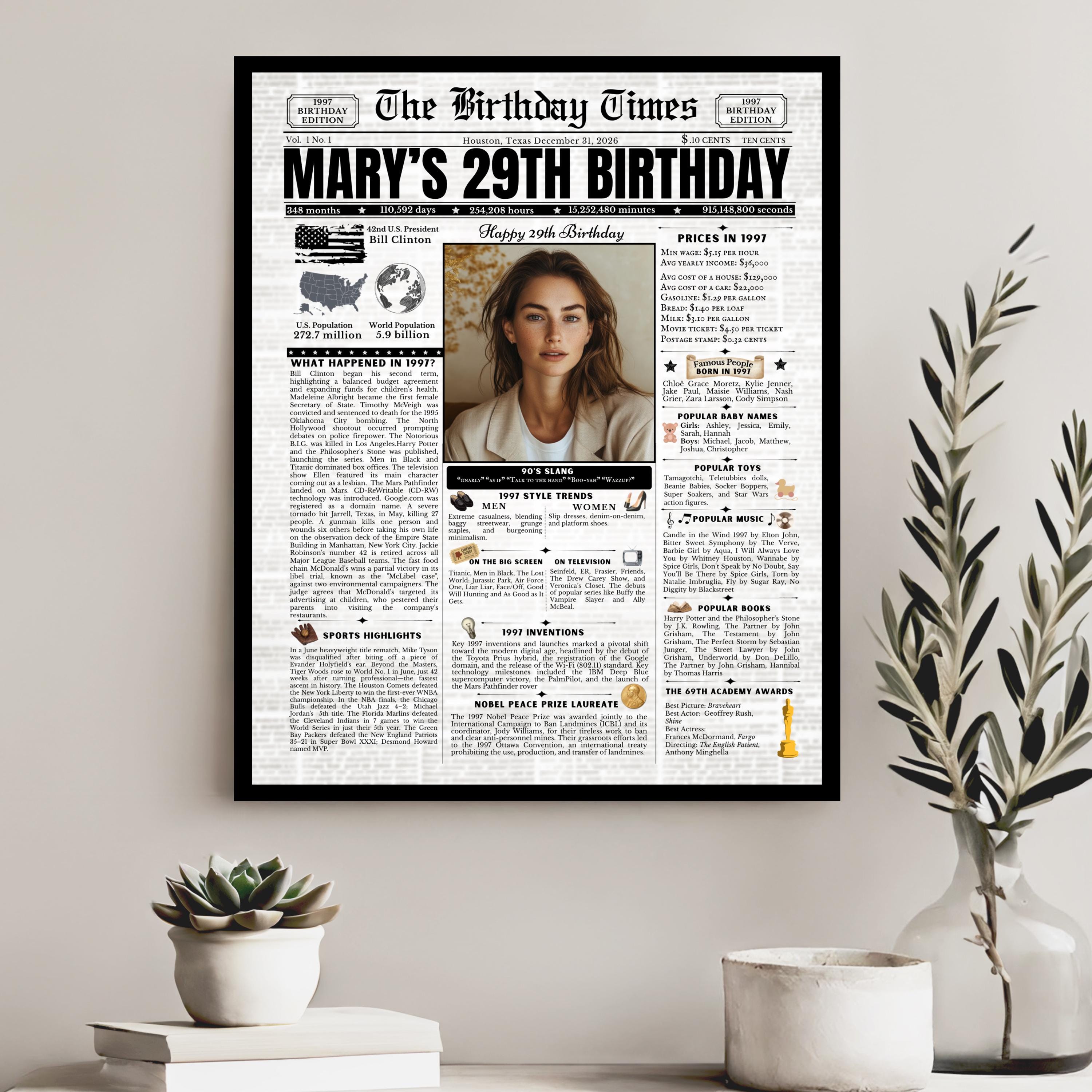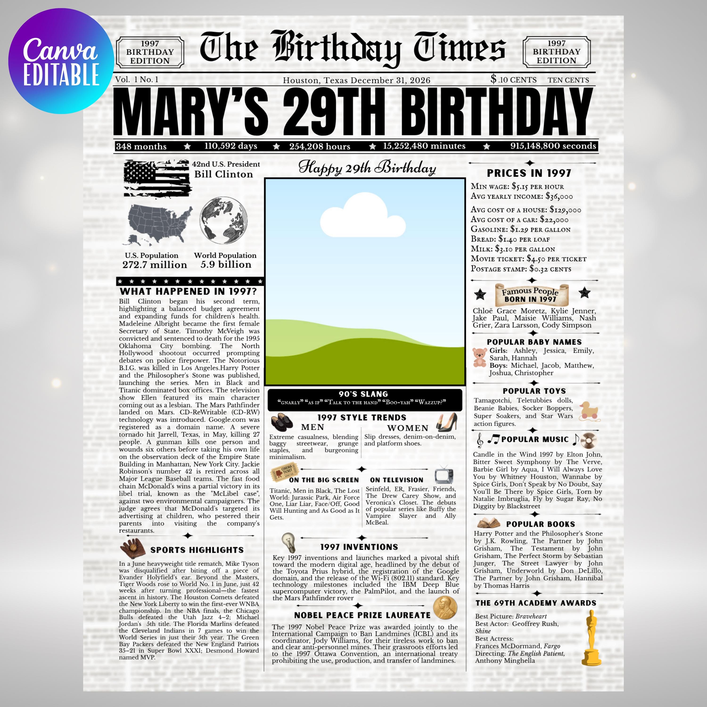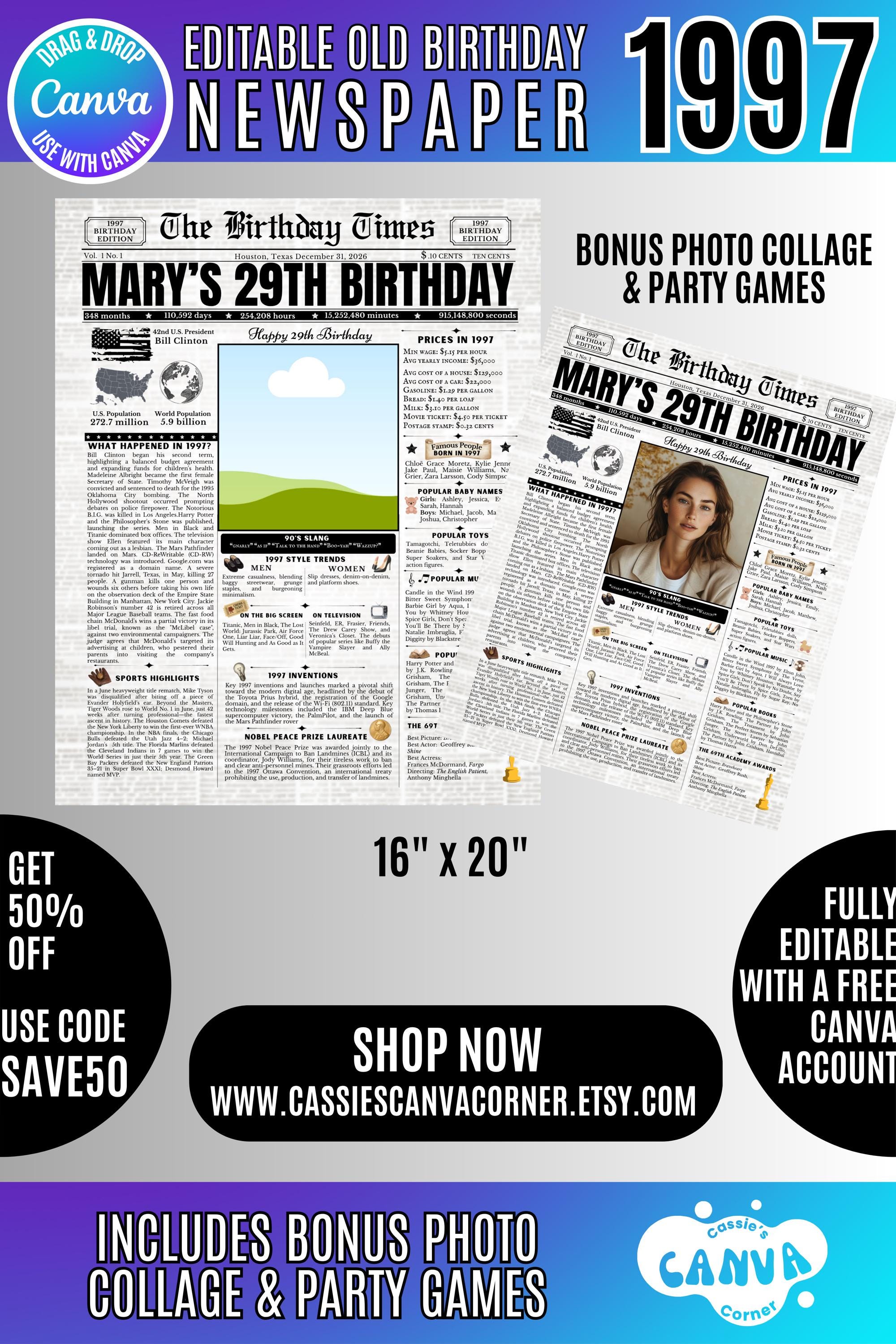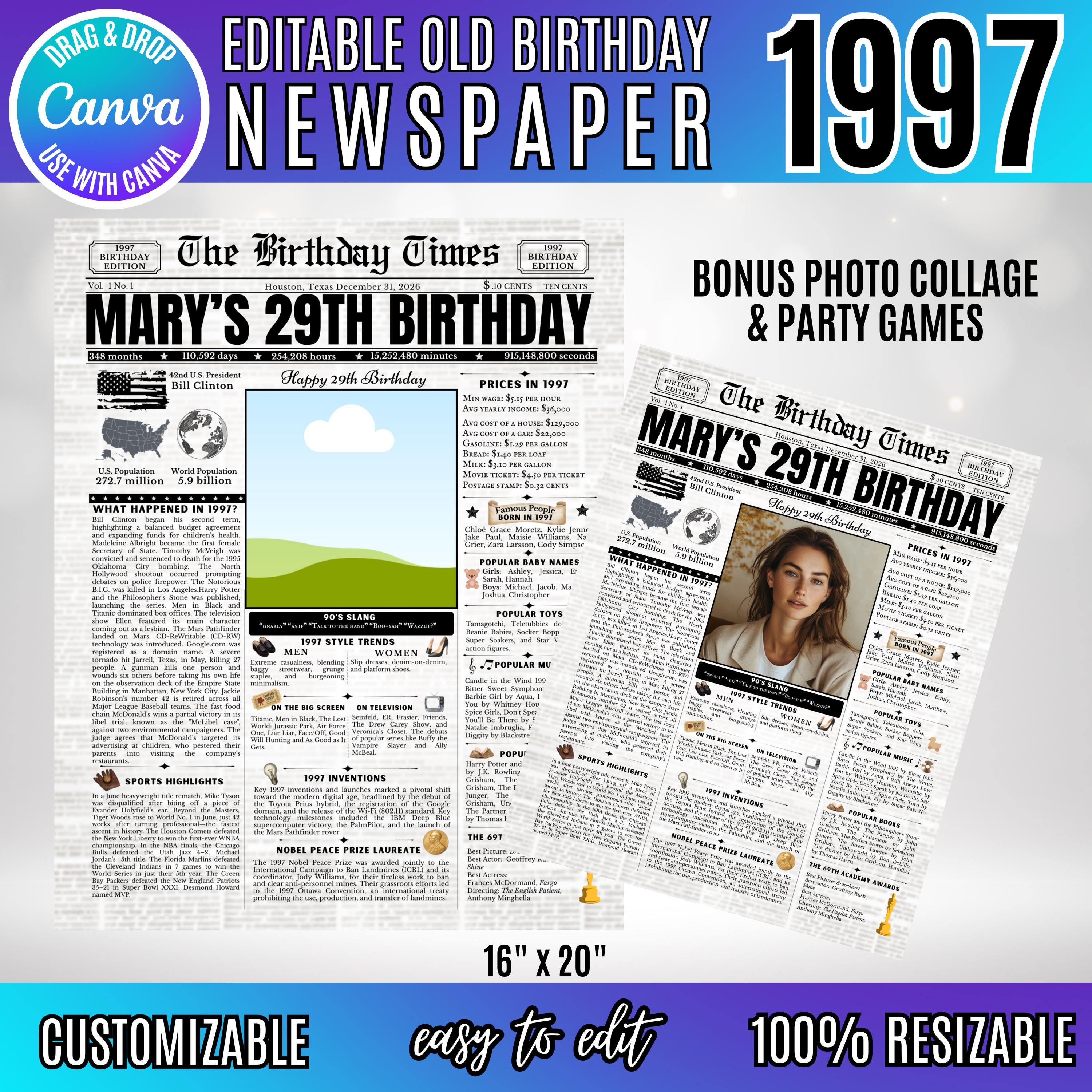 Editable Birthday Newspaper Template Canva | Custom Birth Year Facts Poster | Vintage Newspaper Birthday Sign | Photo Insert Party Decor Printable, 1997 Birthday Card, 29th Birthday