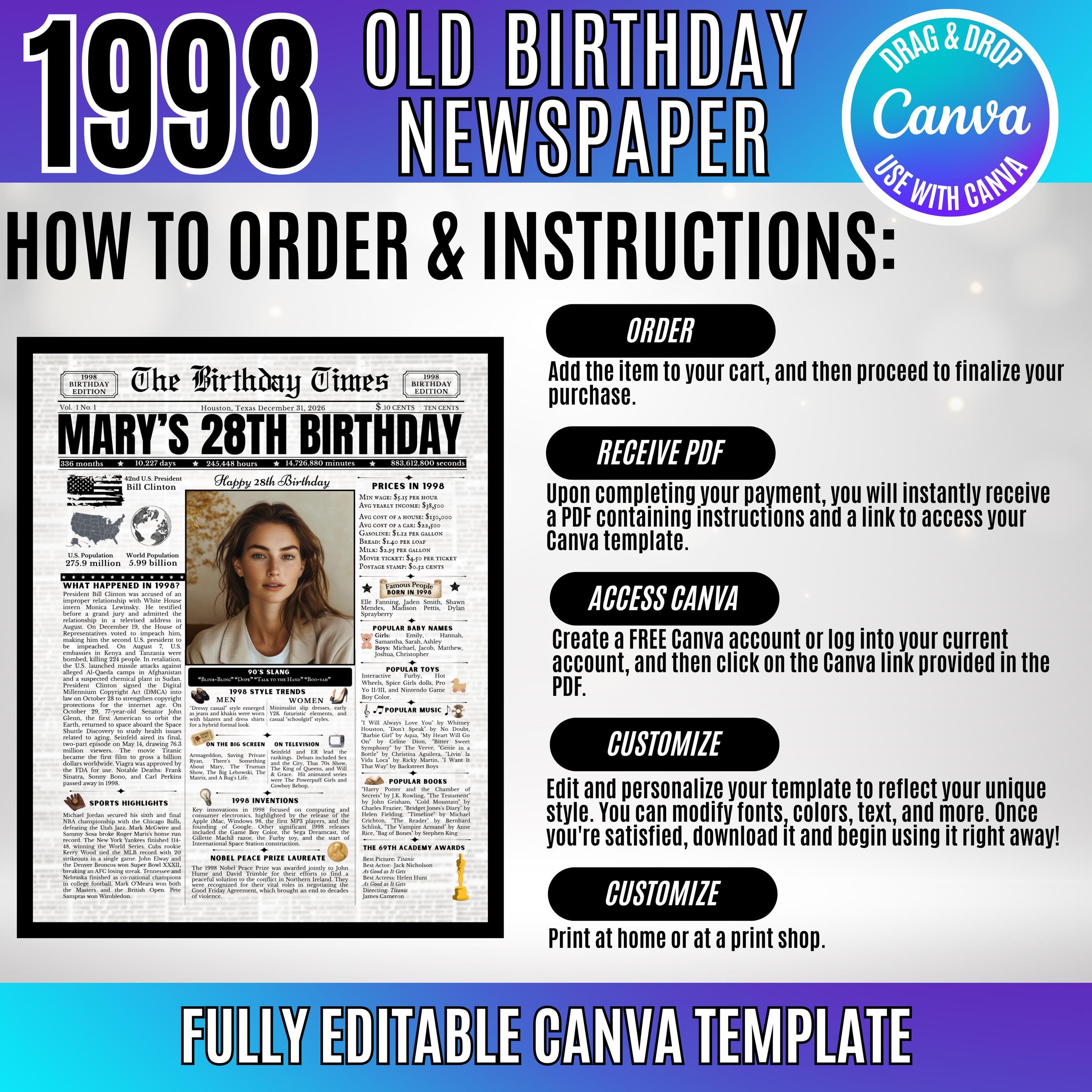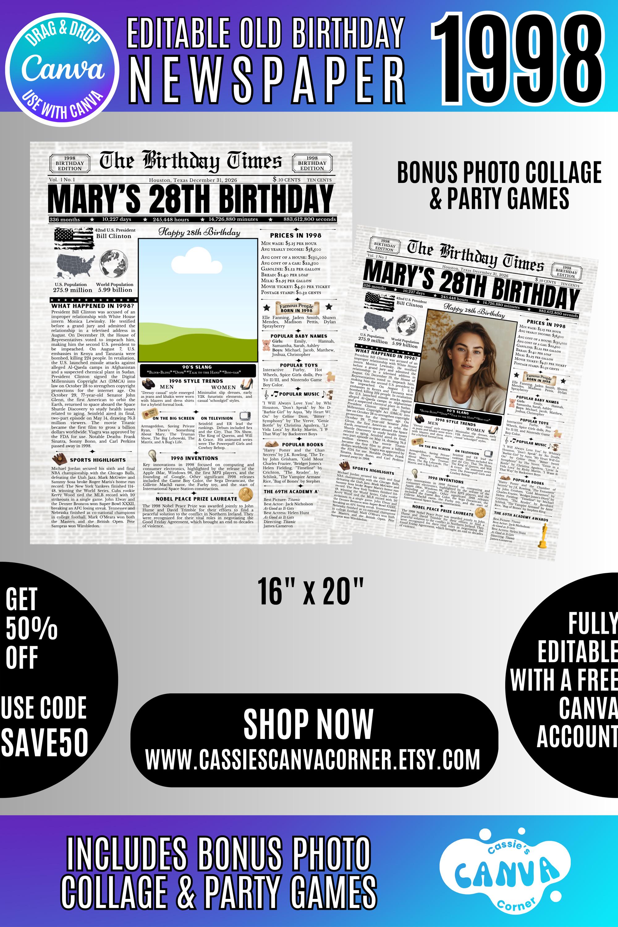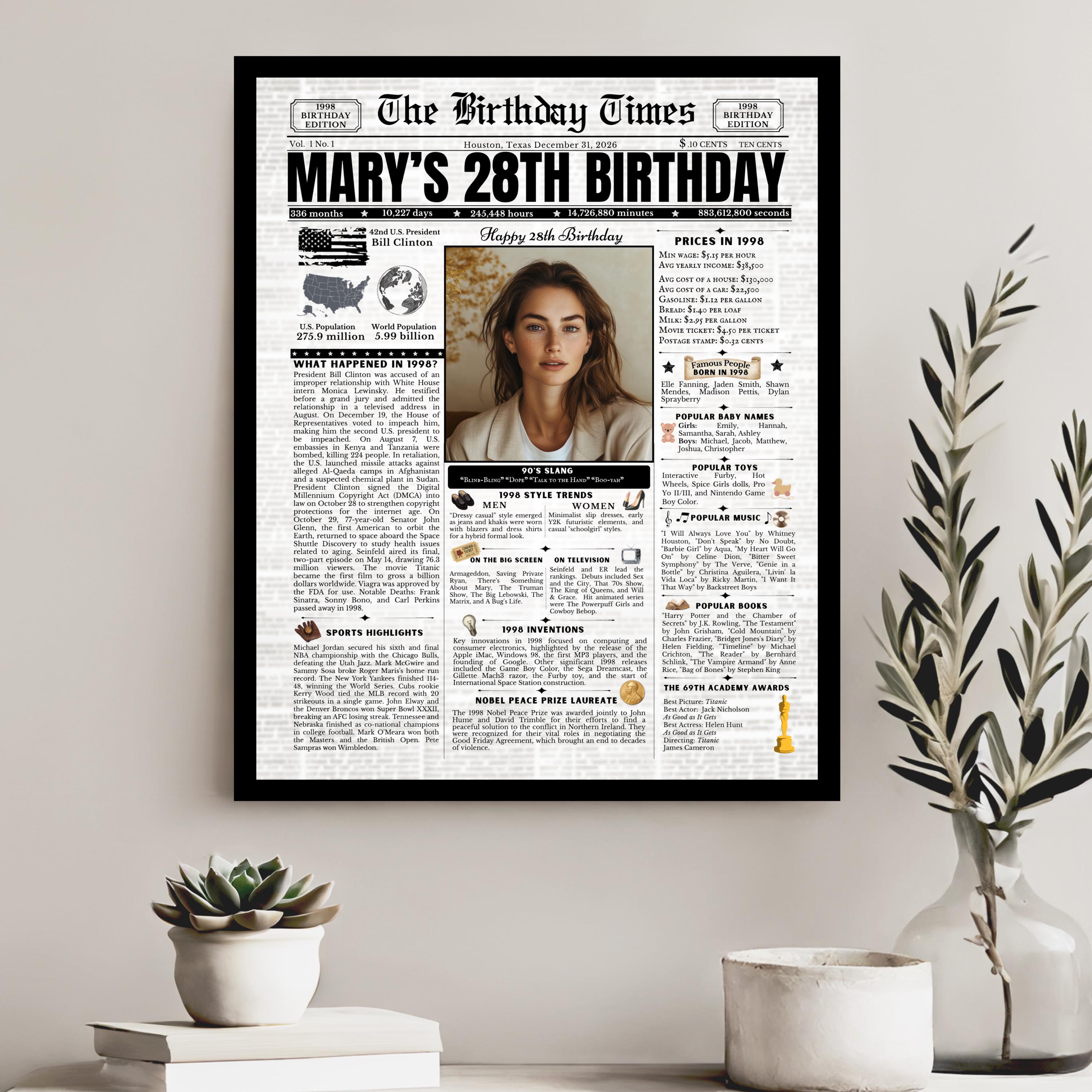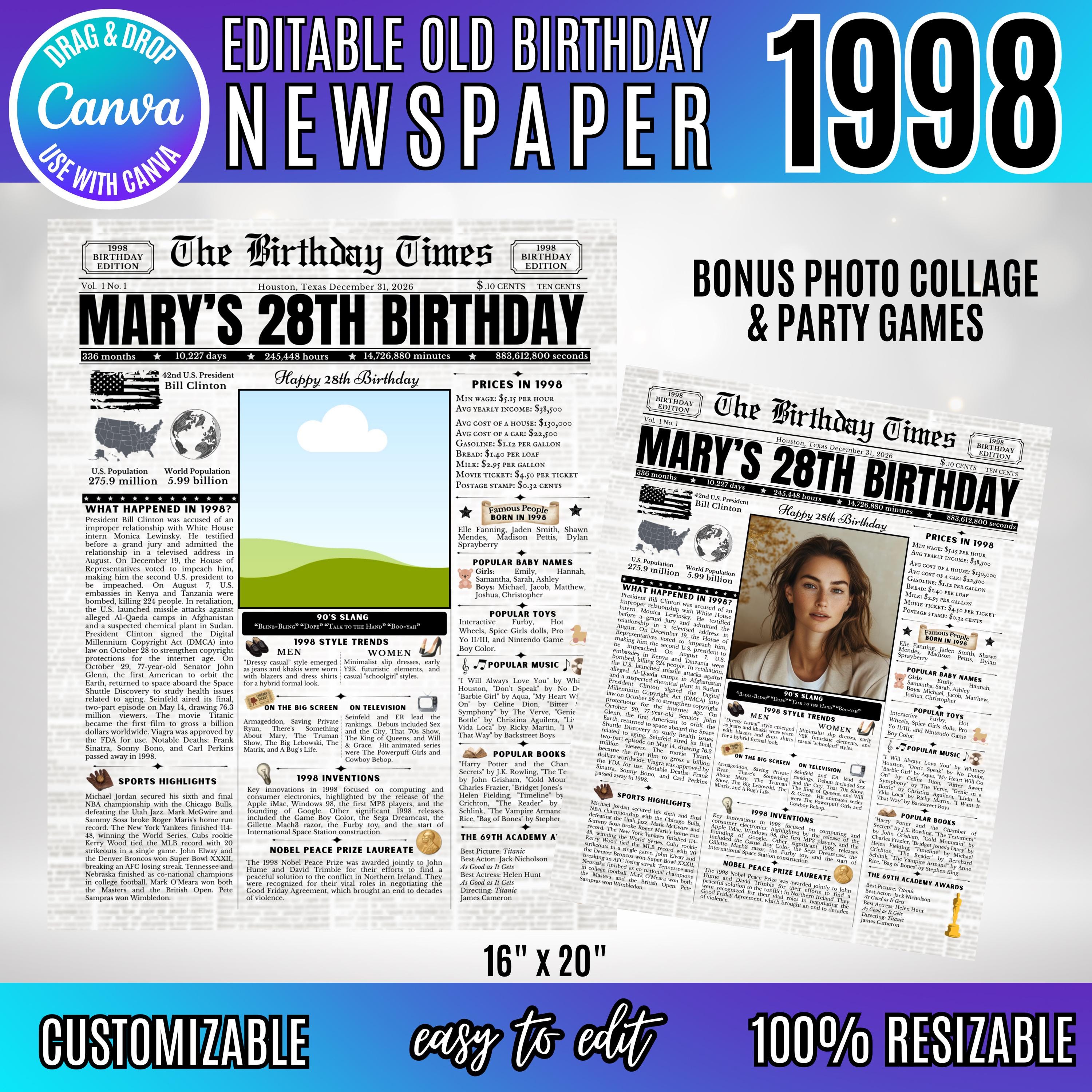 Editable Birthday Newspaper Template Canva | Custom Birth Year Facts Poster | Vintage Newspaper Birthday Sign | Photo Insert Party Decor Printable, 1998 Birthday Card, 28th Birthday
