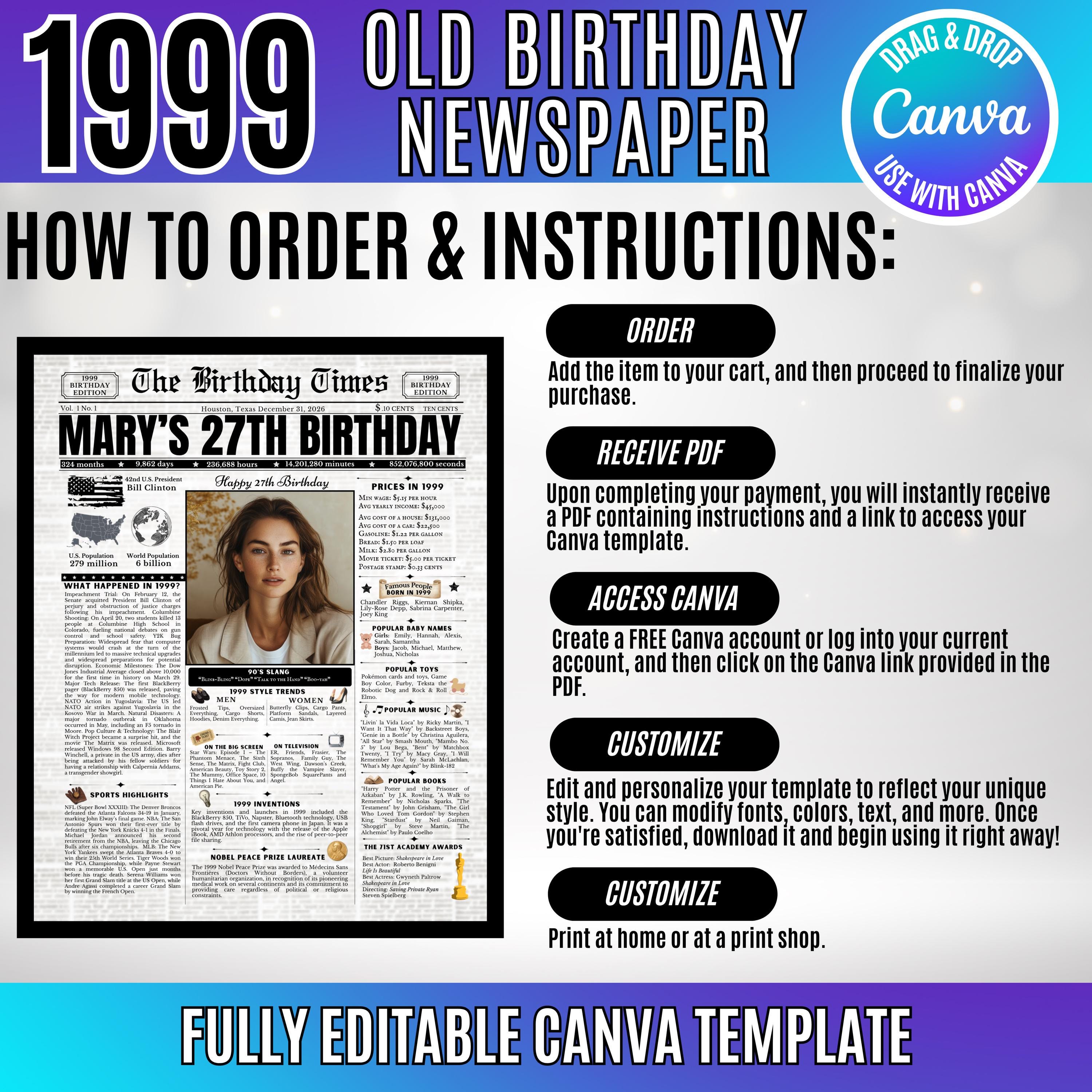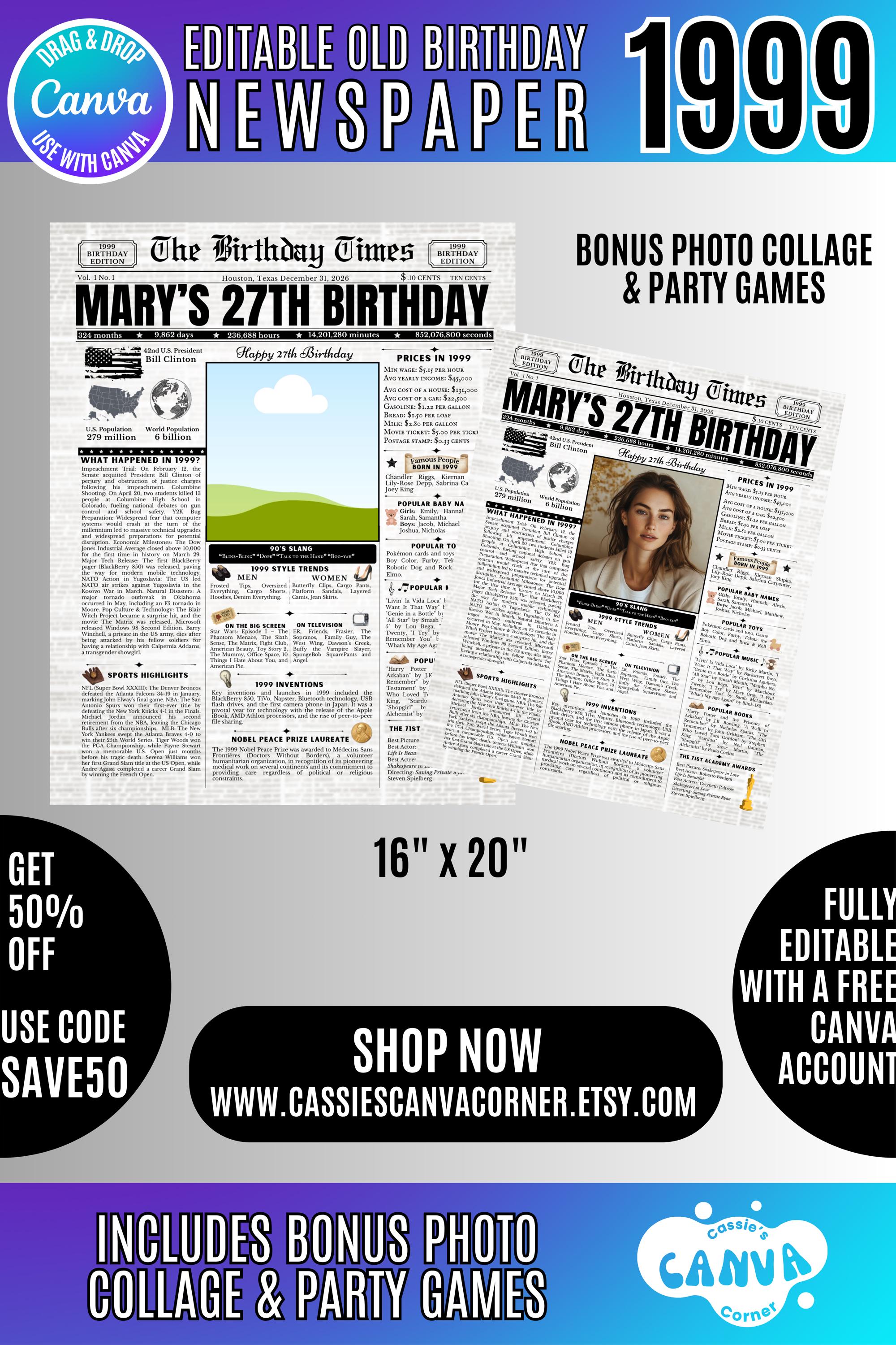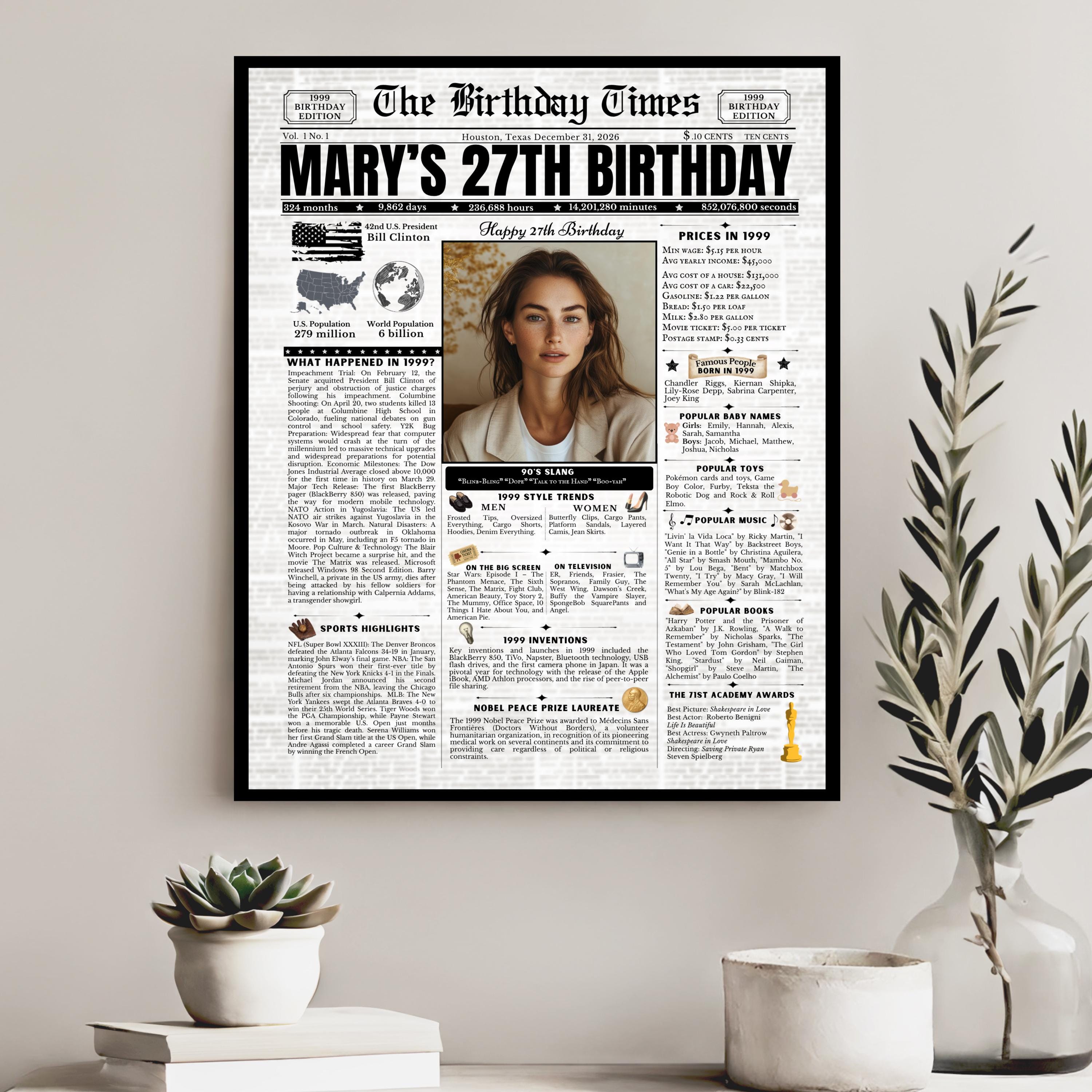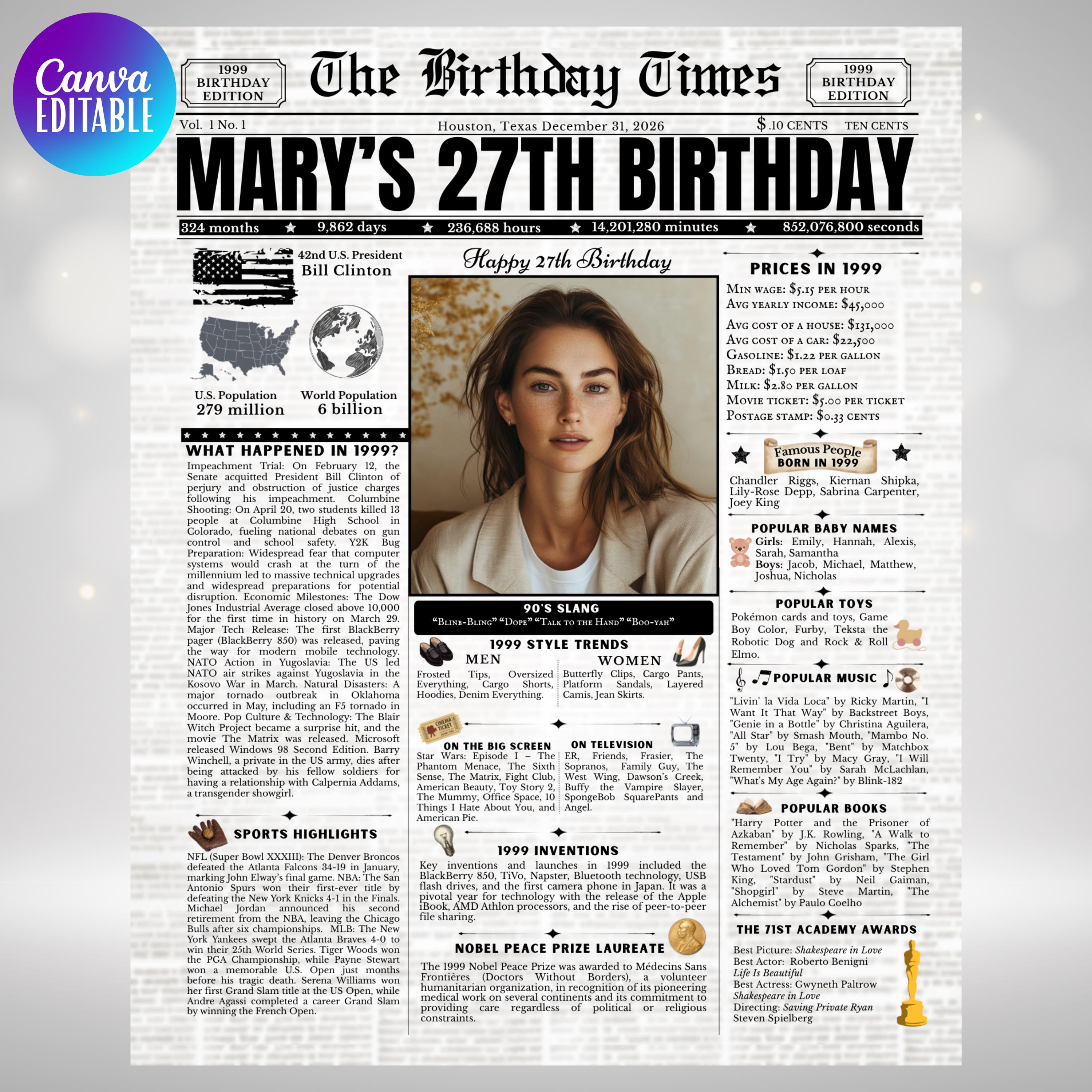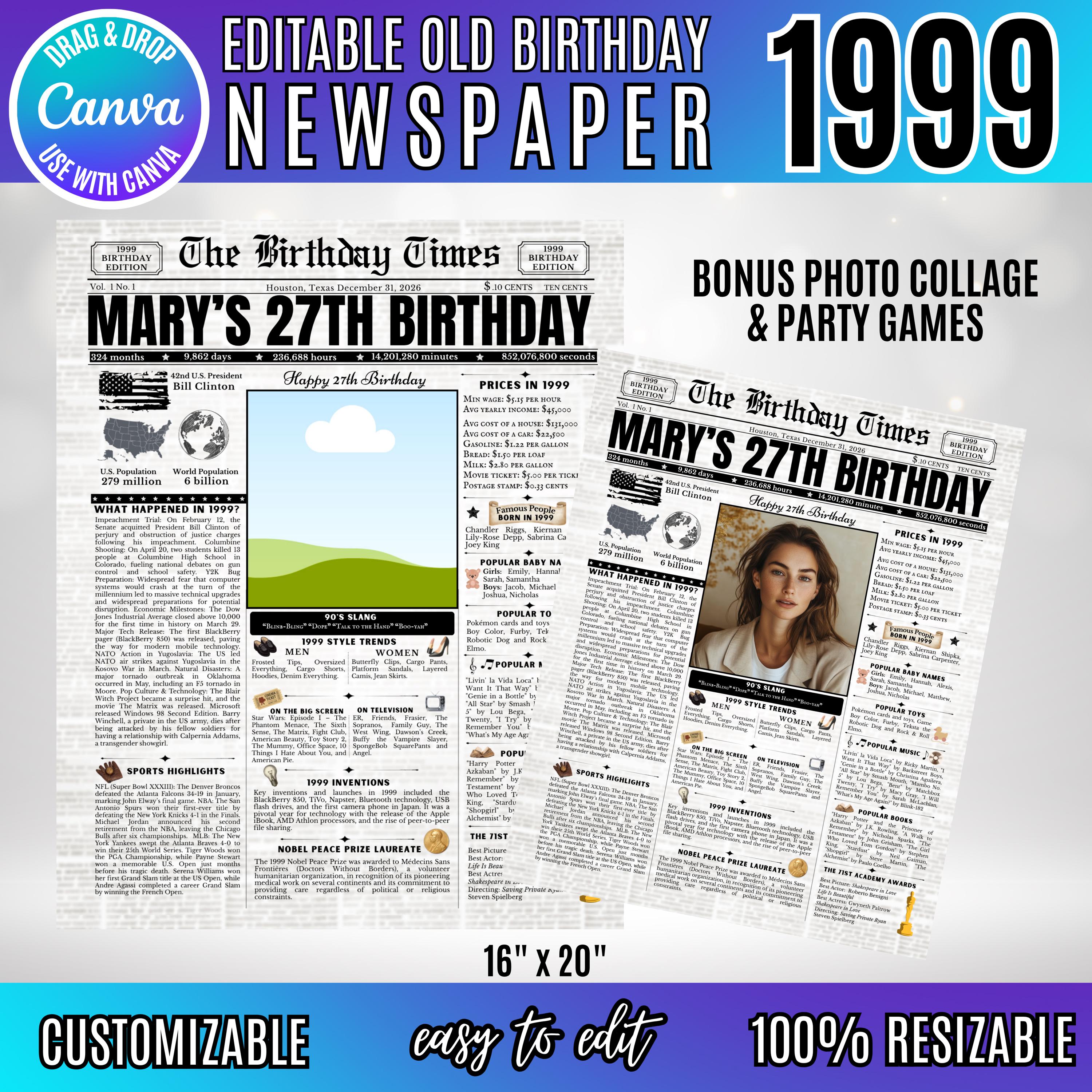 Editable Birthday Newspaper Template Canva | Custom Birth Year Facts Poster | Vintage Newspaper Birthday Sign | Photo Insert Party Decor Printable, 1999 Birthday Card, 27th Birthday