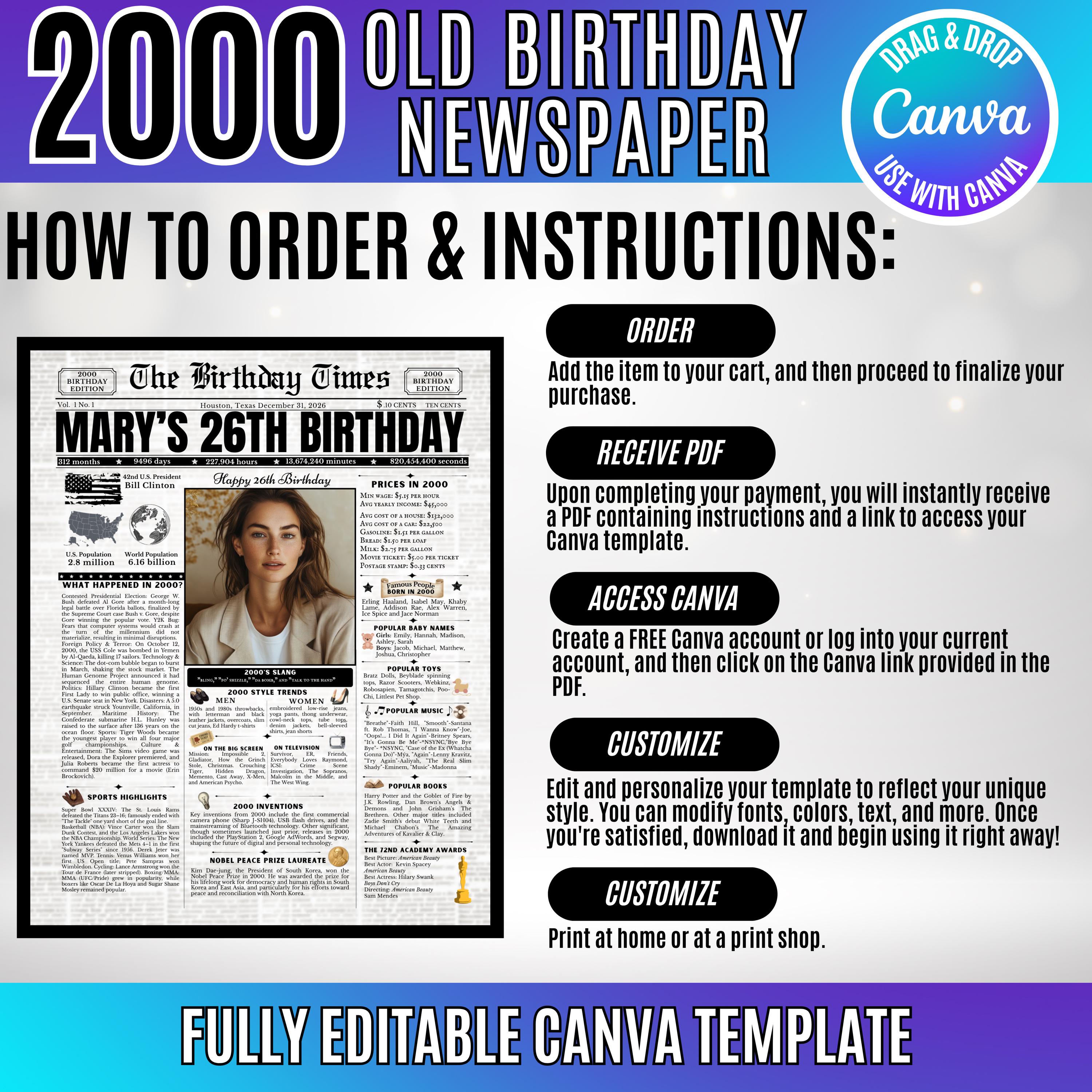 Editable Birthday Newspaper Template Canva | Custom Birth Year Facts Poster | Vintage Newspaper Birthday Sign | Photo Insert Party Decor Printable, 2000 Birthday Card, 26th Birthday