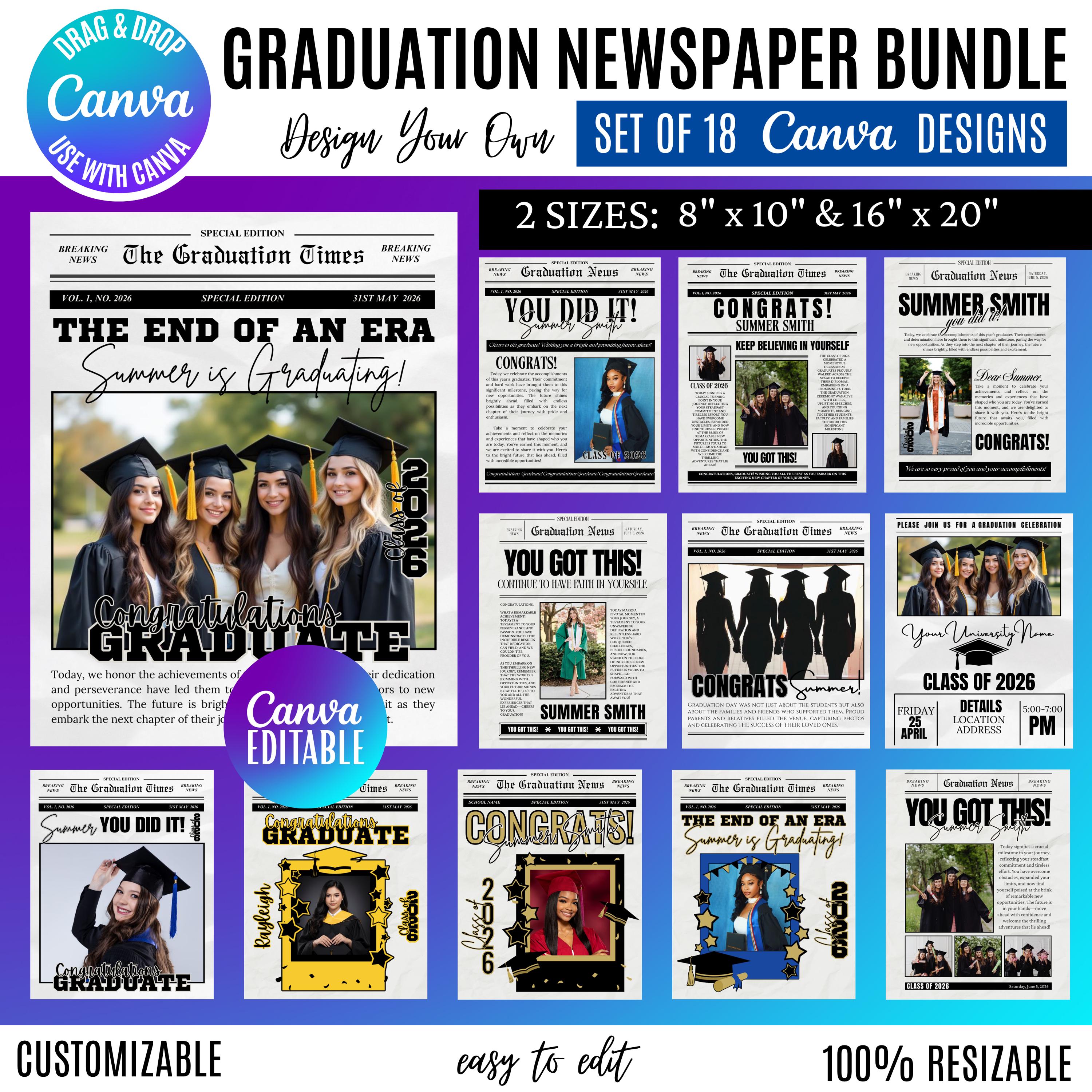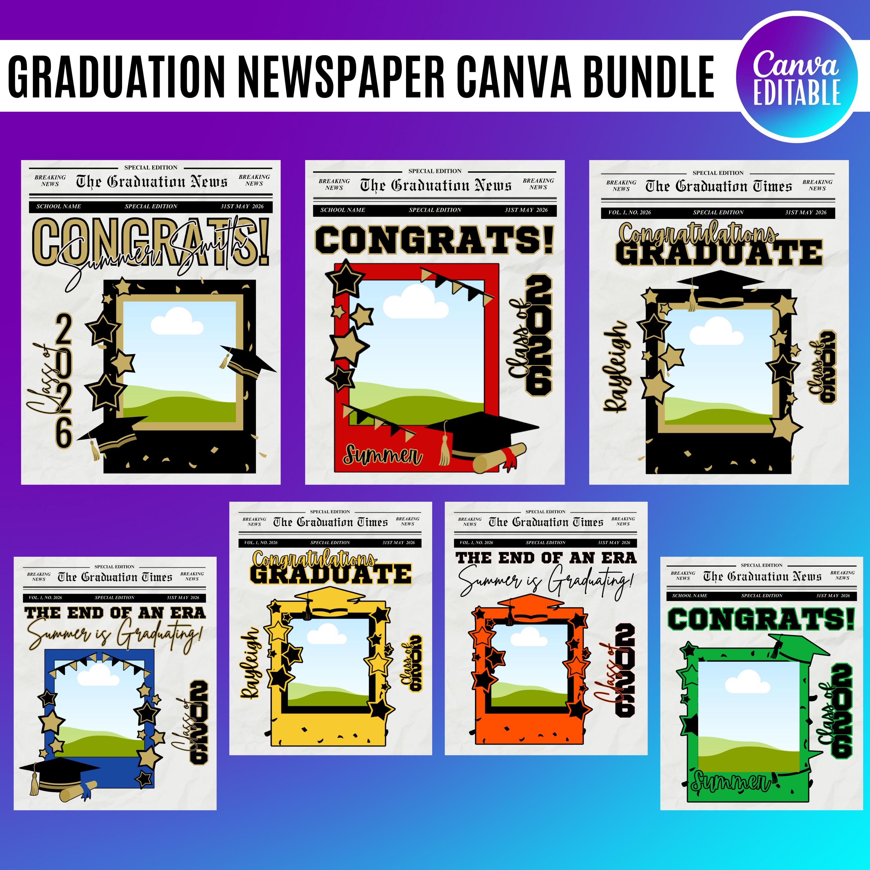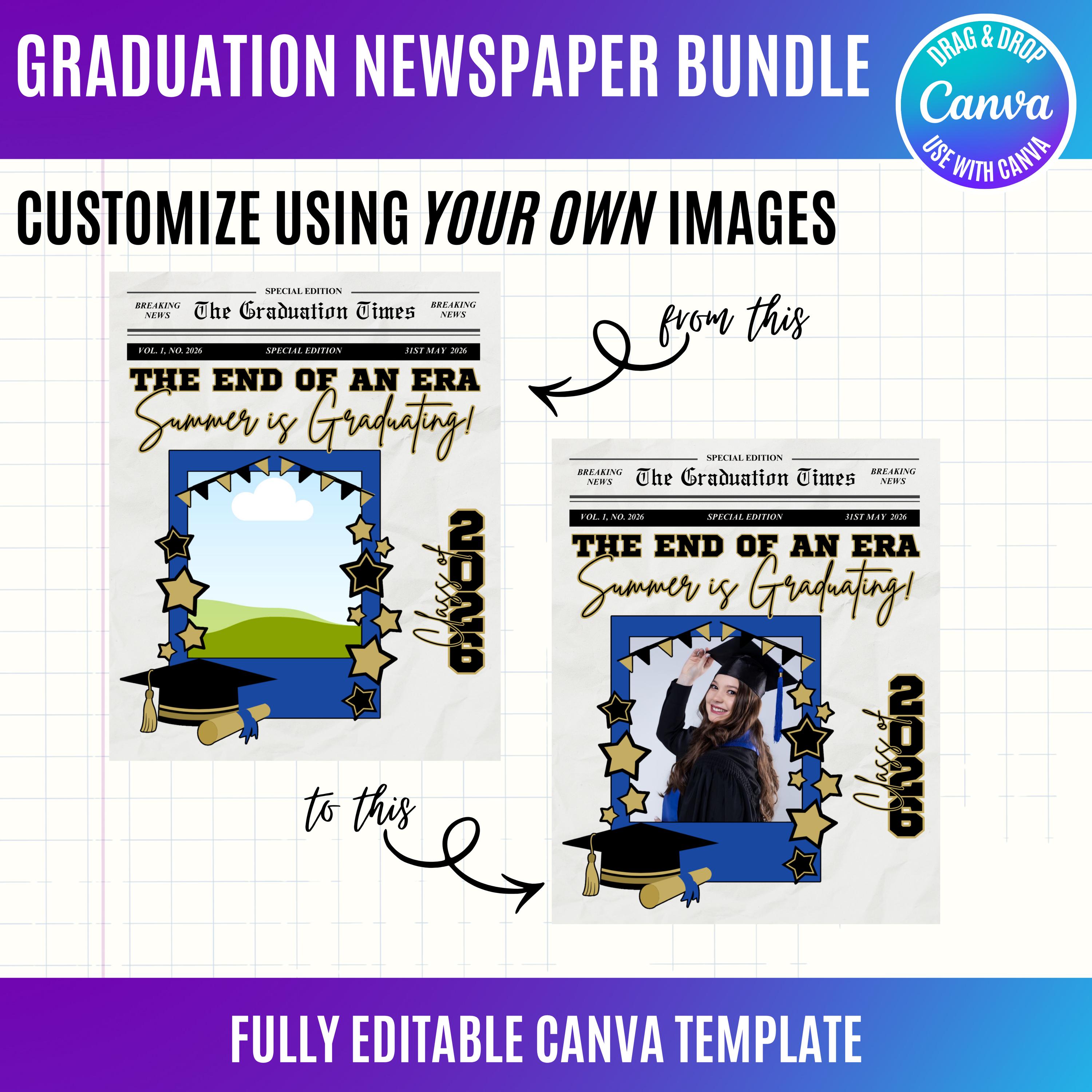 Graduation Newspaper Template Bundle | 18 Editable Canva Designs | Photo Insert Graduation Poster | Senior 2026 Keepsake | Custom Grad Announcement, Graduation Design Bundle 2026
