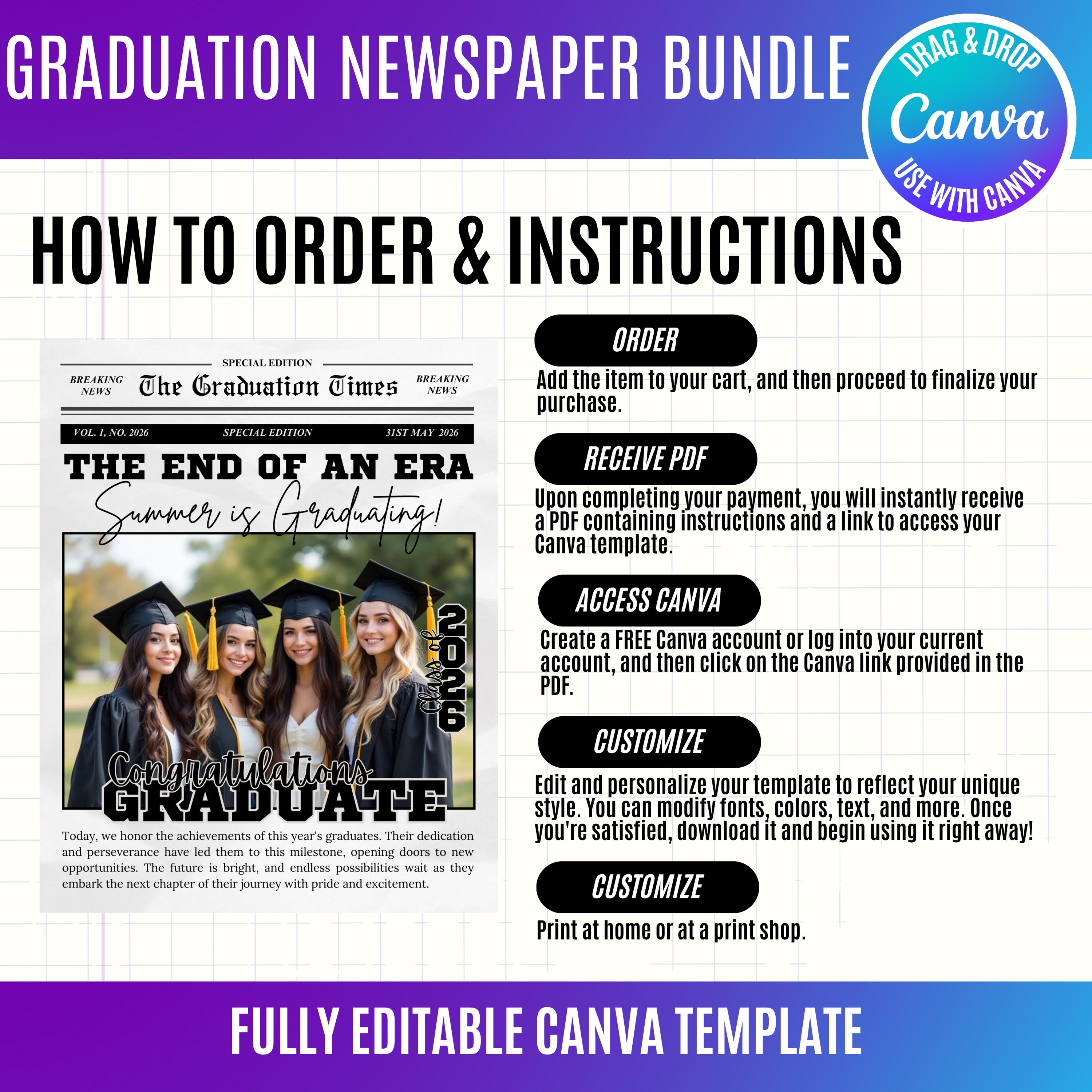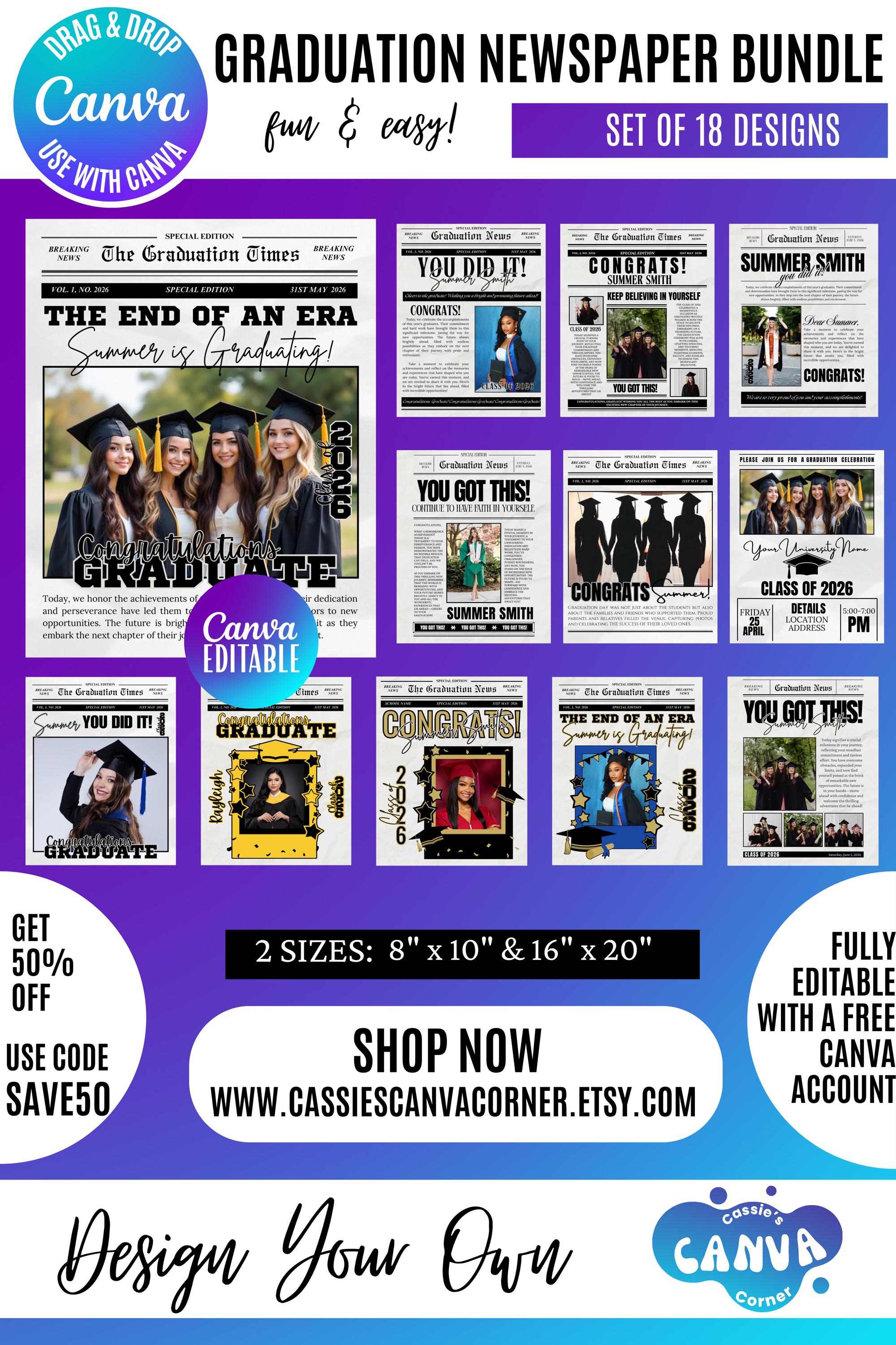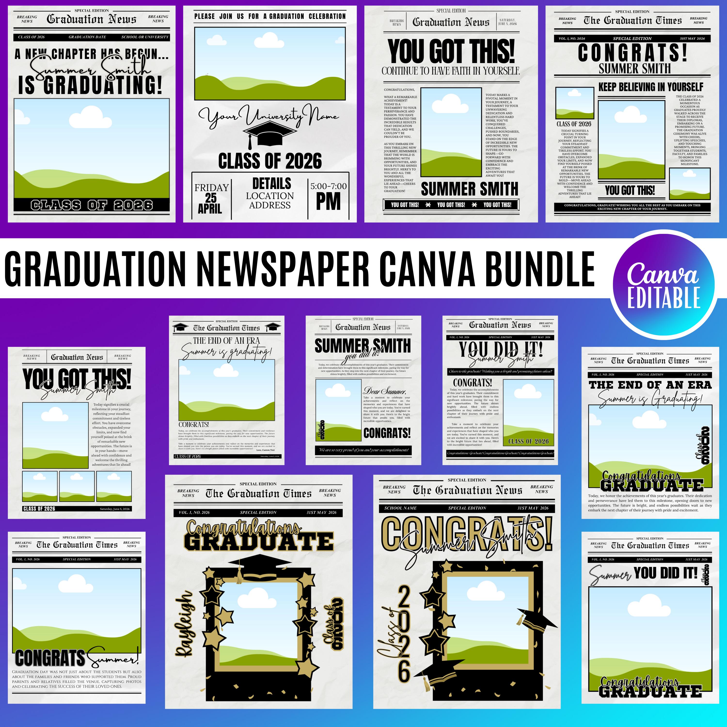 Graduation Newspaper Template Bundle | 18 Editable Canva Designs | Photo Insert Graduation Poster | Senior 2026 Keepsake | Custom Grad Announcement, Graduation Design Bundle 2026