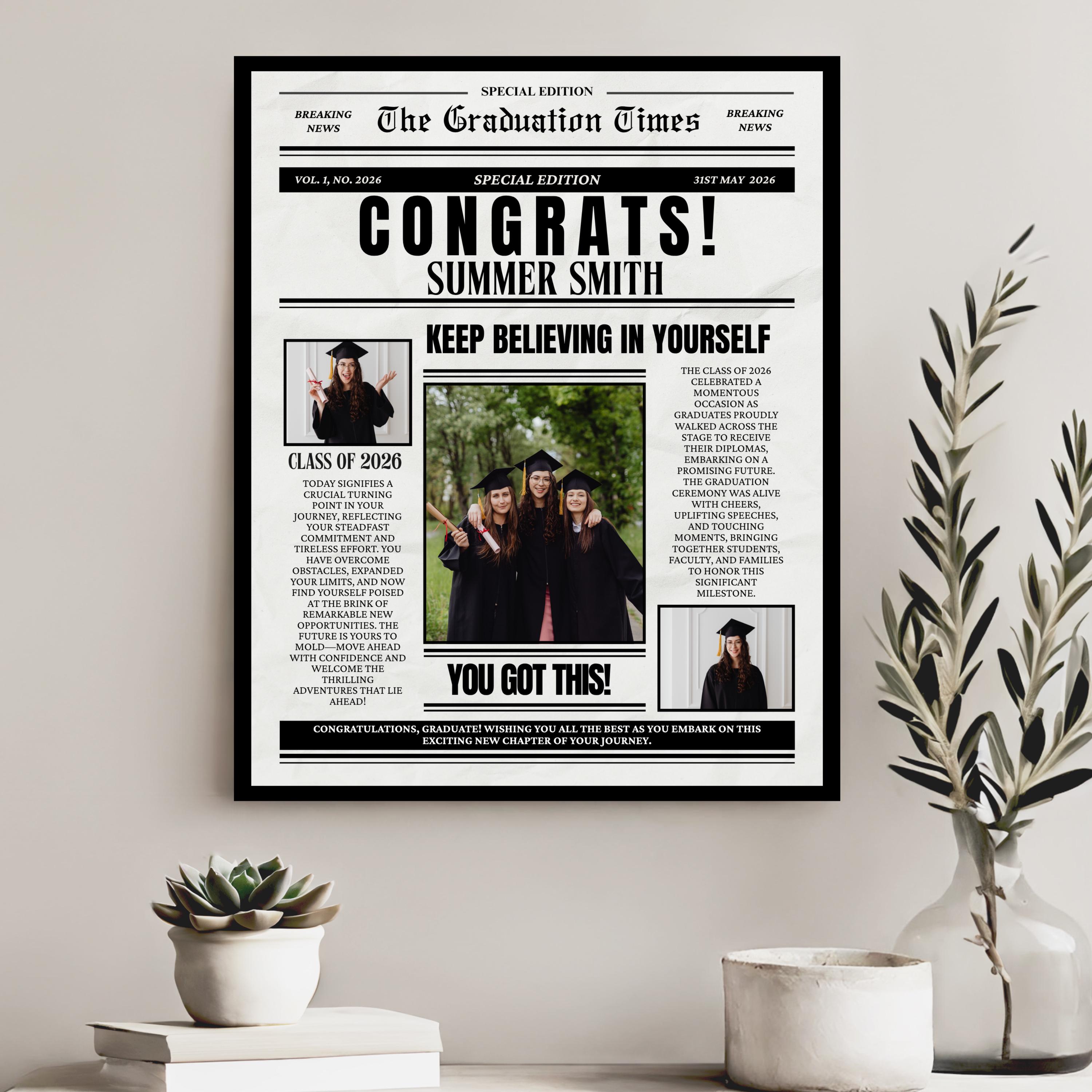 graduation newspaper template, grad newspaper Canva, senior 2026 template, graduation poster editable, photo newspaper template, graduation party decor, senior keepsake printable, graduation announcement template, editable Canva graduation, custom grad poster, newspaper style template, graduation photo template, grad party printable template, customizable grad designs